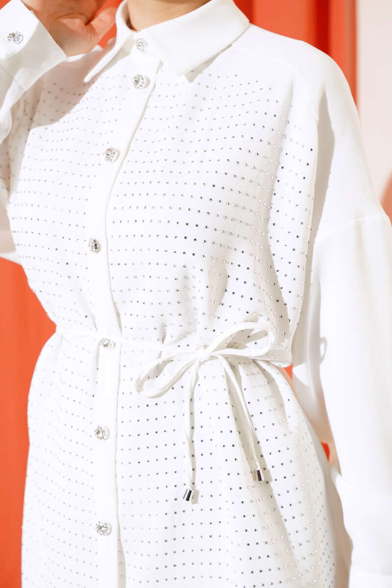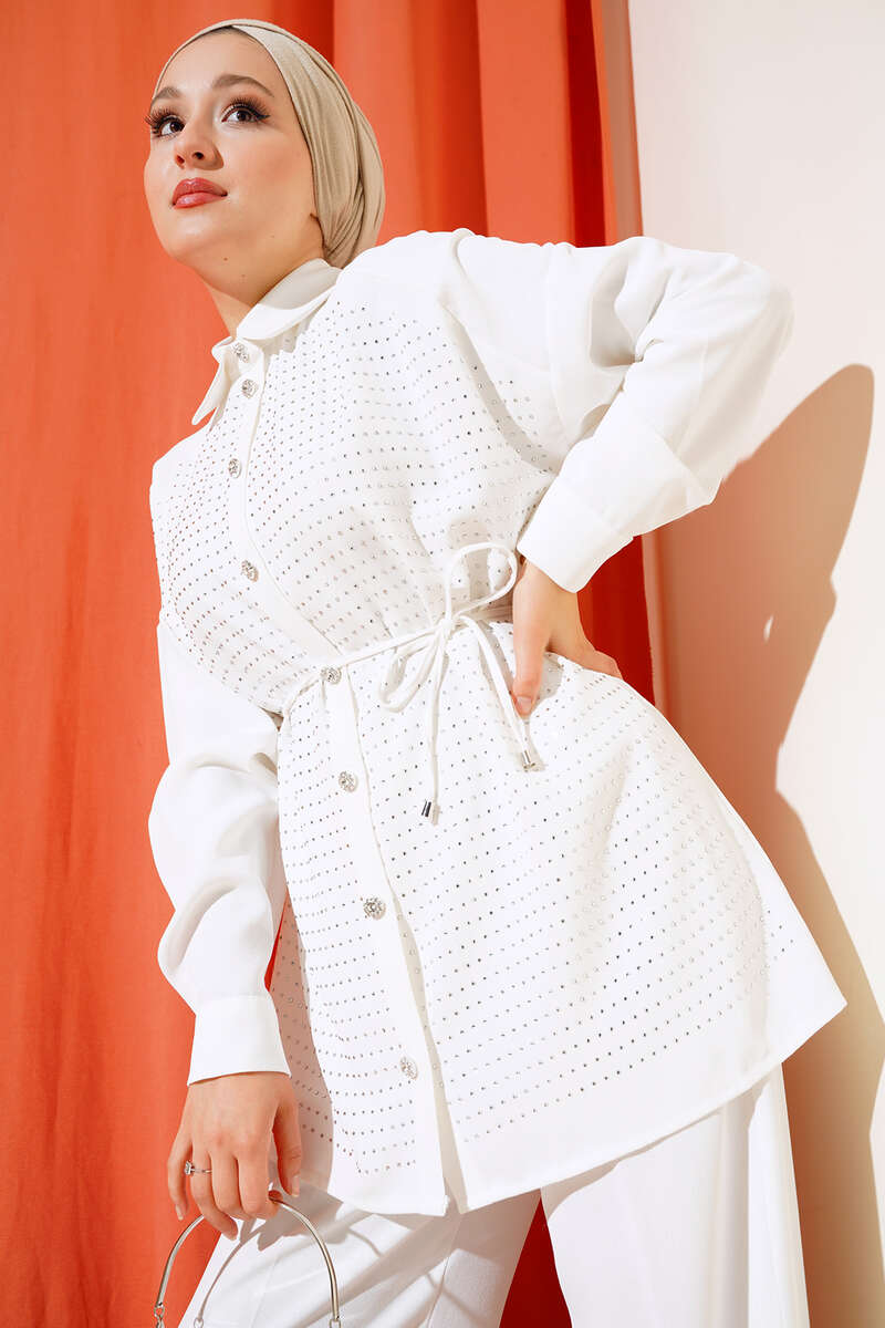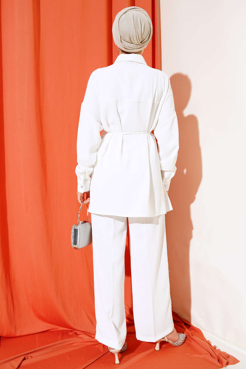 Yeni sezon ikili takım modelimiz sizlerle beraber. Tuniğimizin önü taşlarla süslenmiştir. Gömlek yakadır. Kol bilekleri manşetli ve düğmelidir. Tuniğimizin kendi kumaşından ip bağcığı vardır. Pantolonumuzun beli lastiklidir. Cepsiz modeldir. Geniş paçalıdır. Renk seçenekleri olan ikili takımımız dolabınızda yerini beklemektedir.