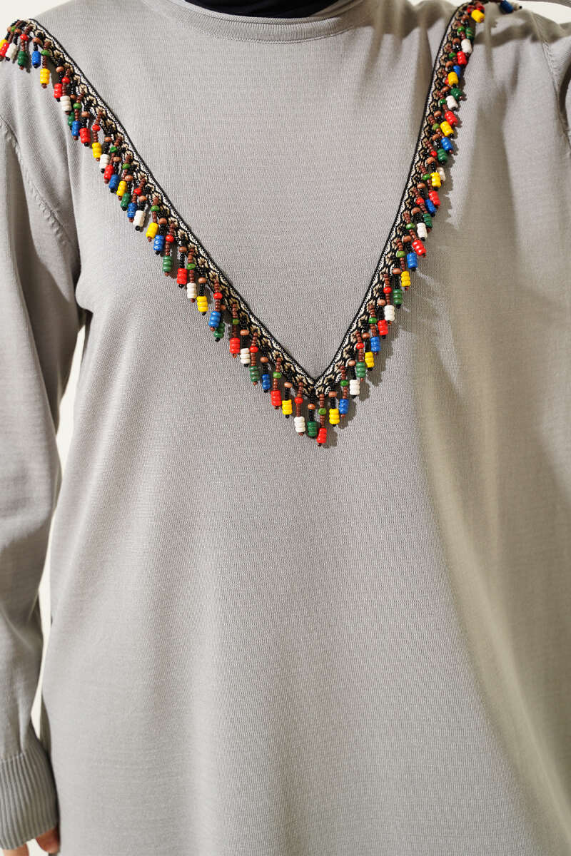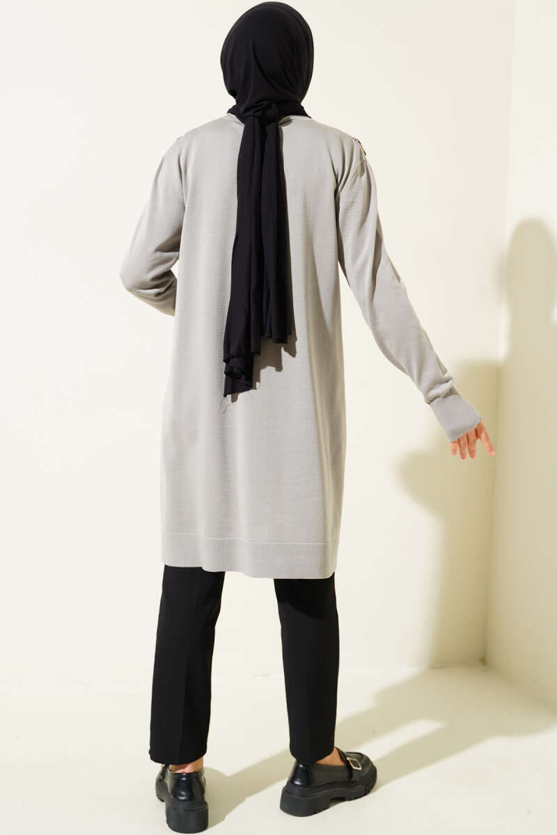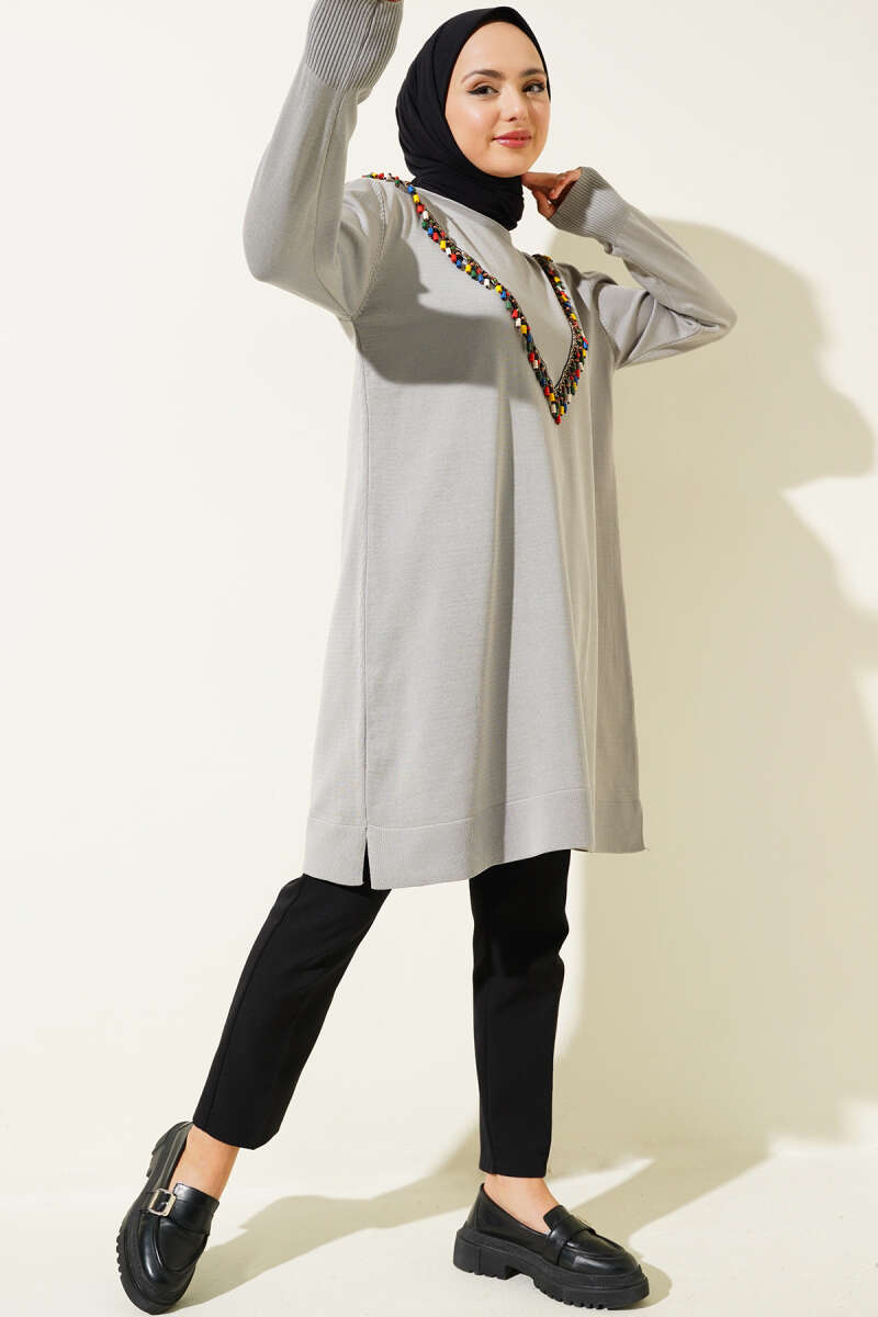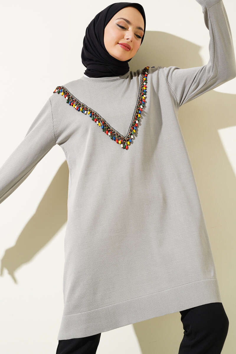 Gömlek Yaka Fularlı Triko Tunik Gri