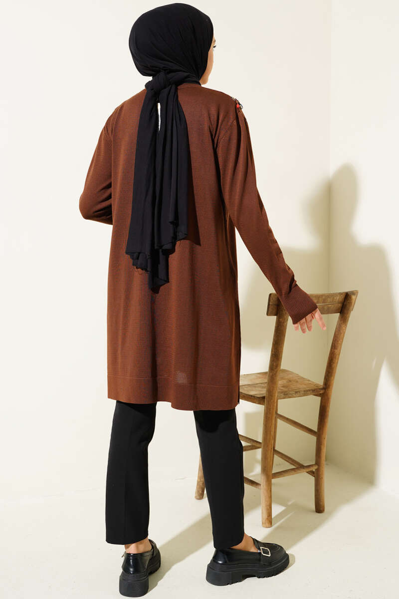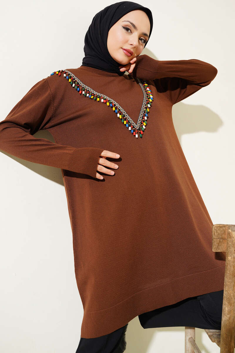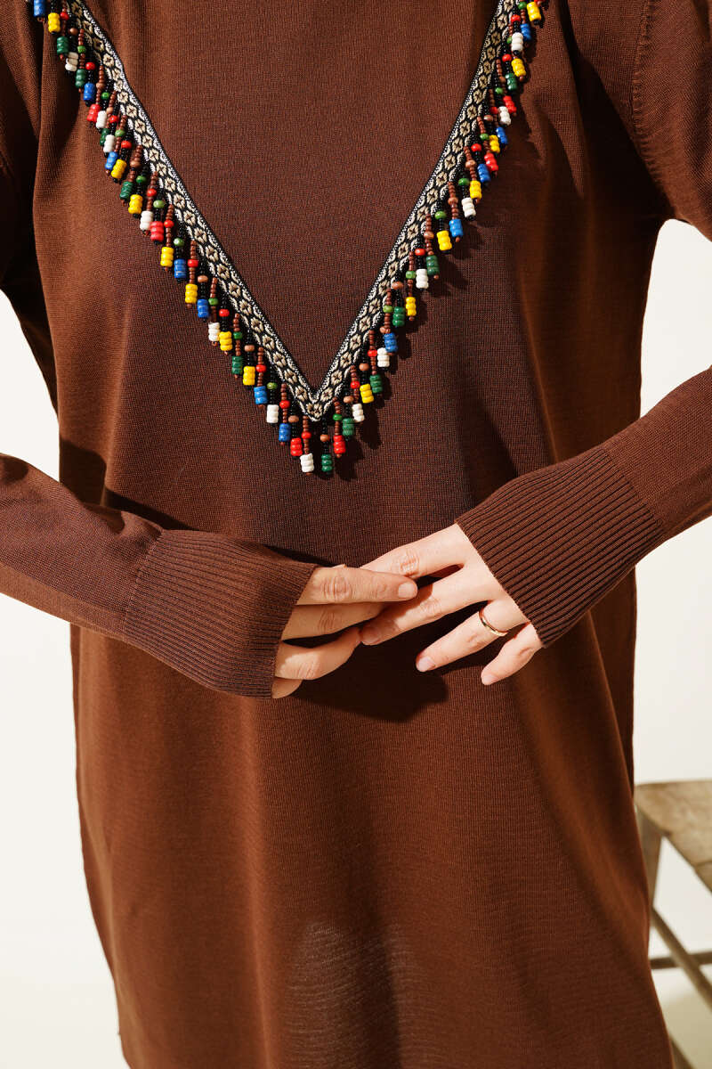 Gömlek Yaka Fularlı Triko Tunik Kahve