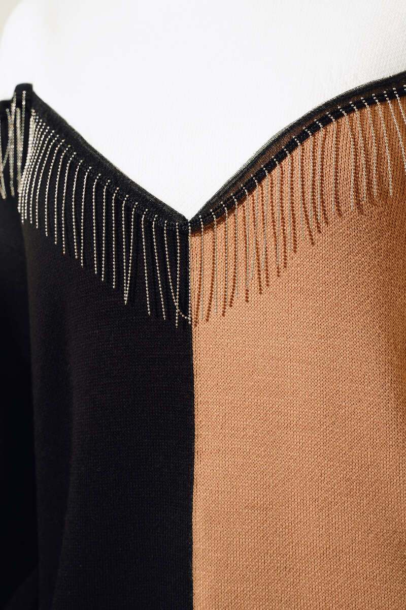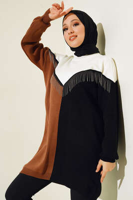 Yeni sezon triko tuniğimizin önü v şeklinde zincir püsküllüdür. Renk geçişlerine sahip olan triko tuniğimiz düşük omuz modeldir. Kombinlerinizin ayrılmaz bir parçası olacak triko tuniğimiz şimdiden çok beğenildi.
