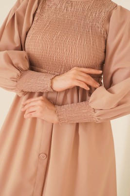 Önü ve Kol Ucu Gipeli Elbise Bej
