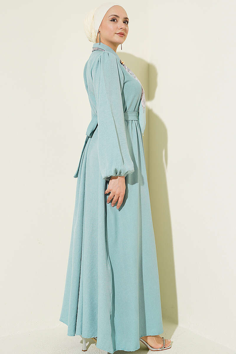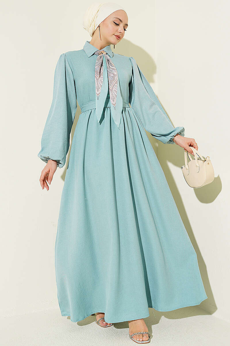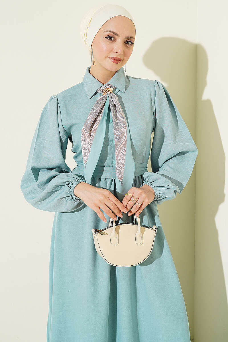 Önü Yarım Düğmeli Fularlı Elbise Çağla Yeşili