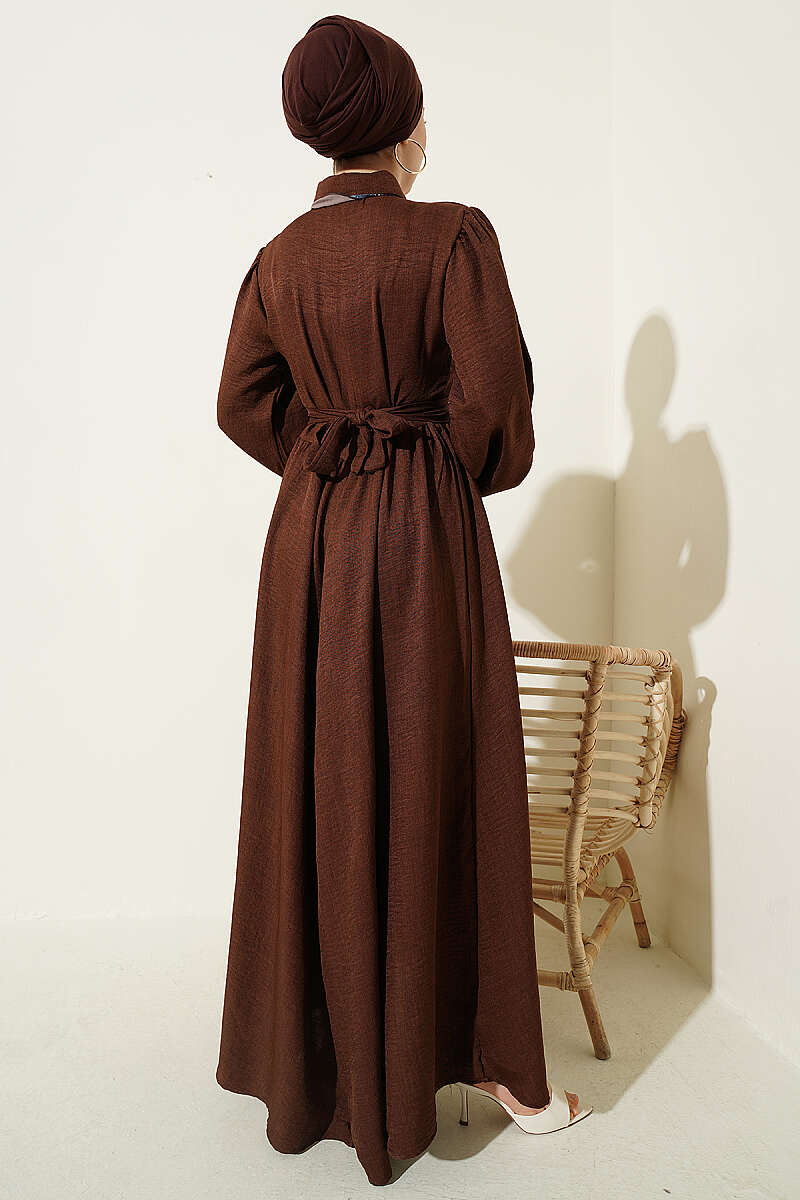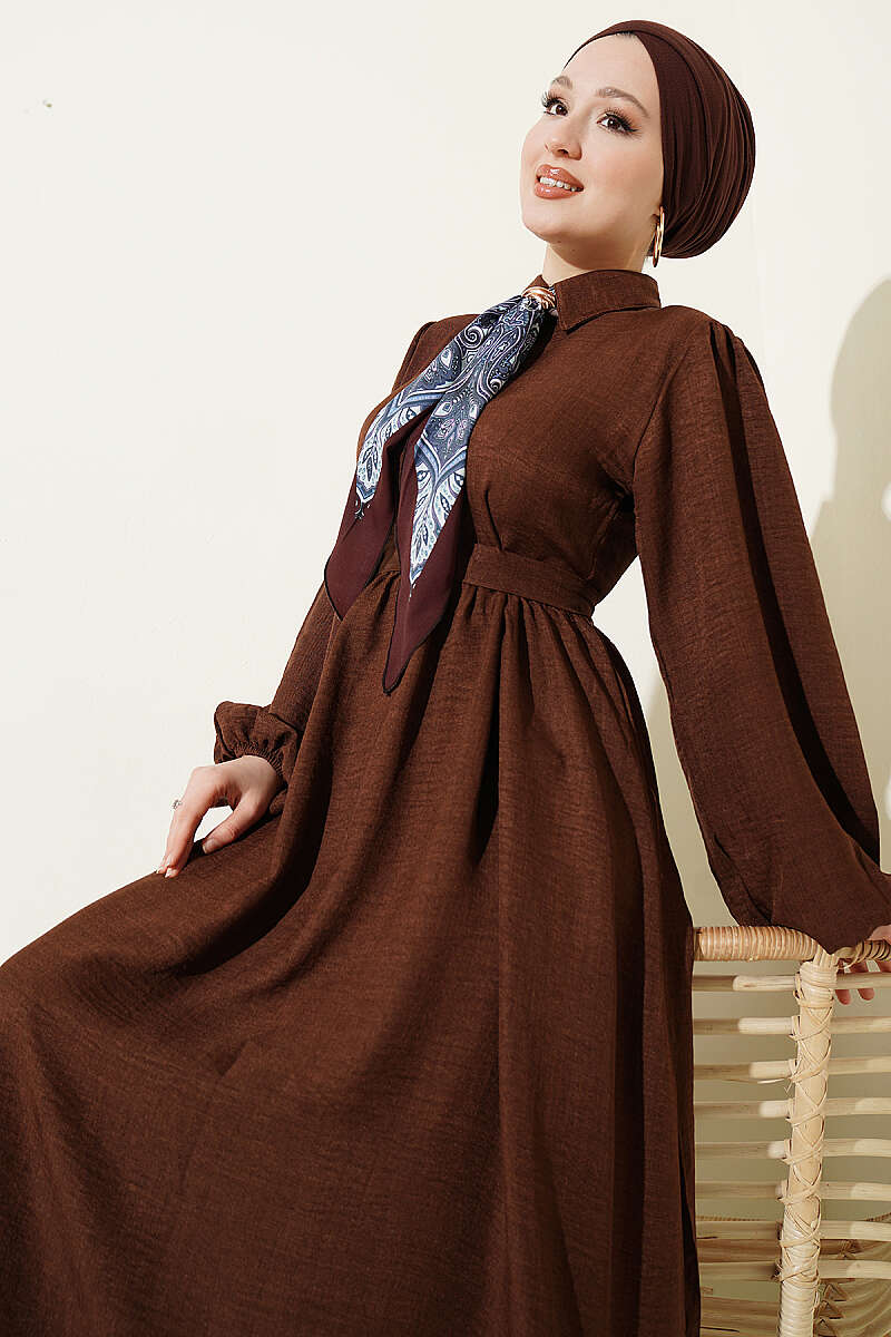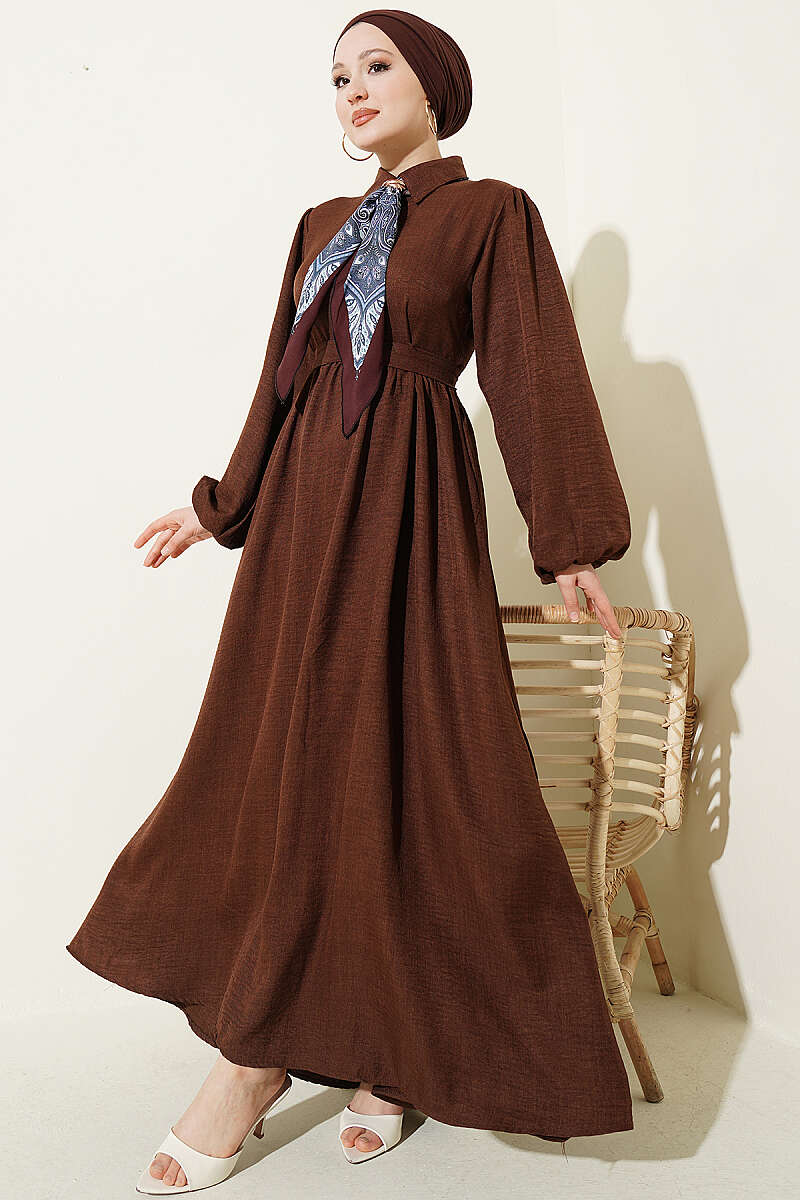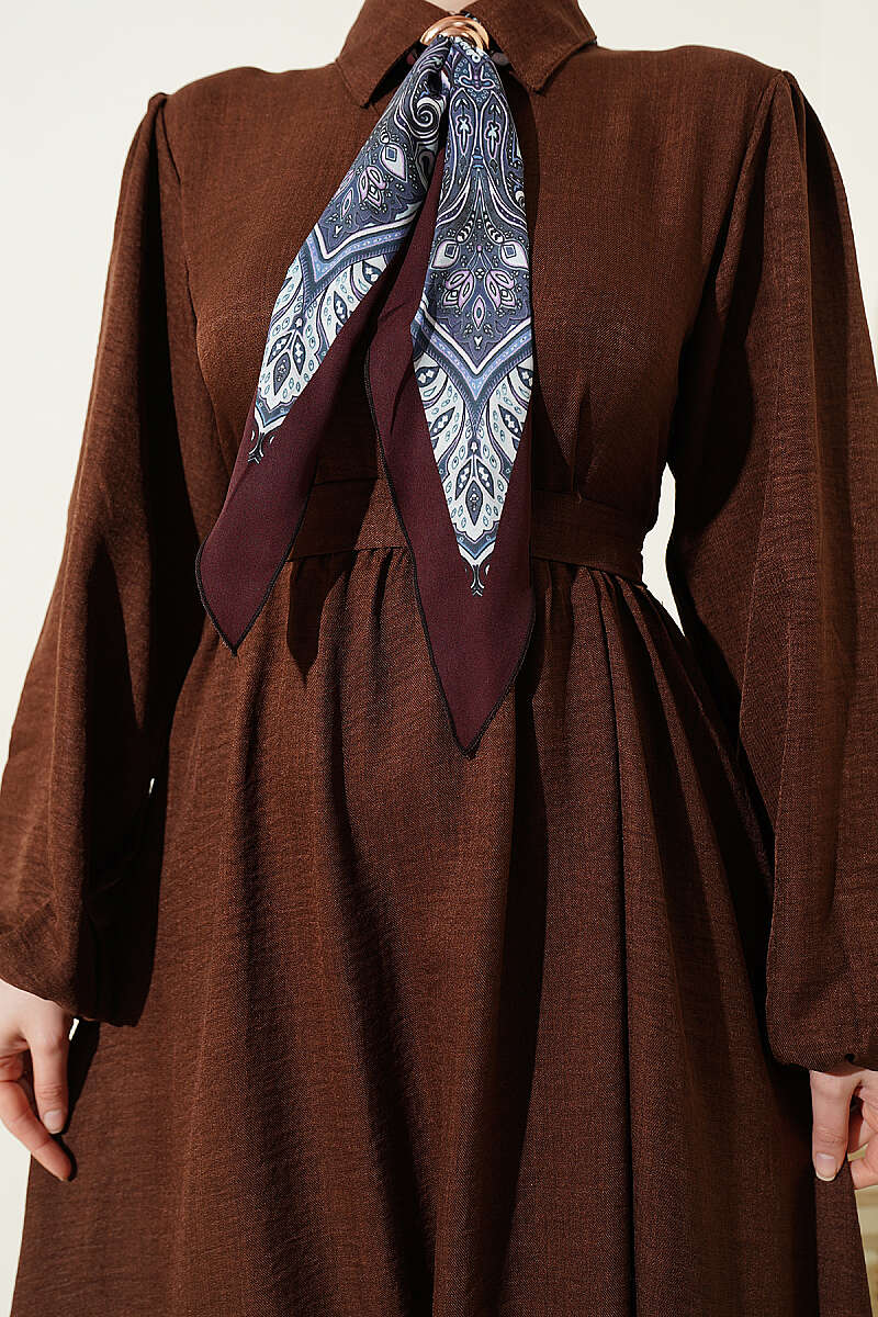 Önü Yarım Düğmeli Fularlı Elbise Kahve