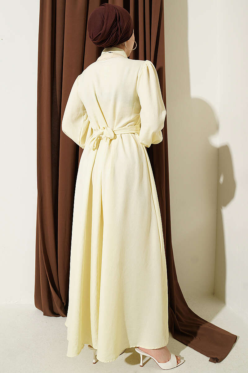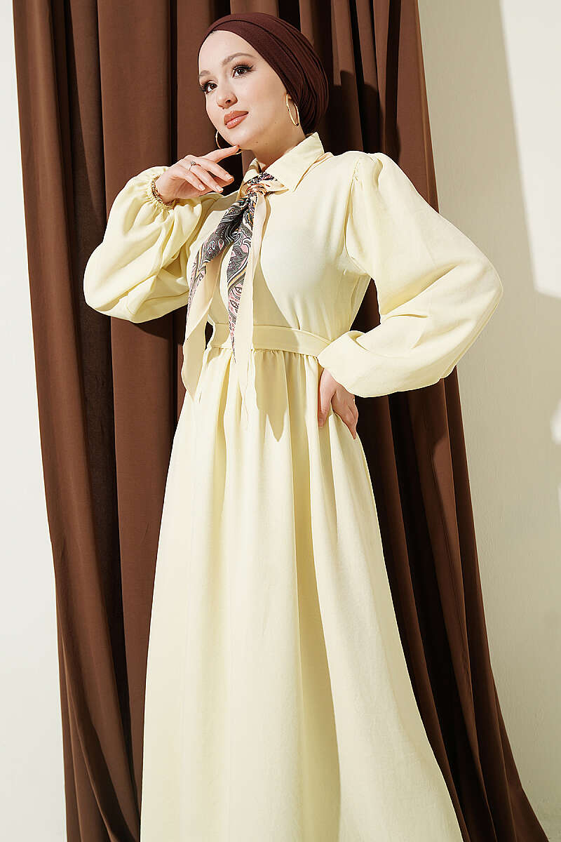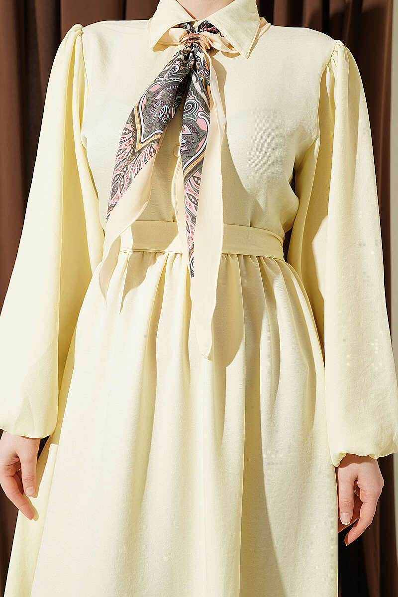 Önü Yarım Düğmeli Fularlı Elbise Sarı