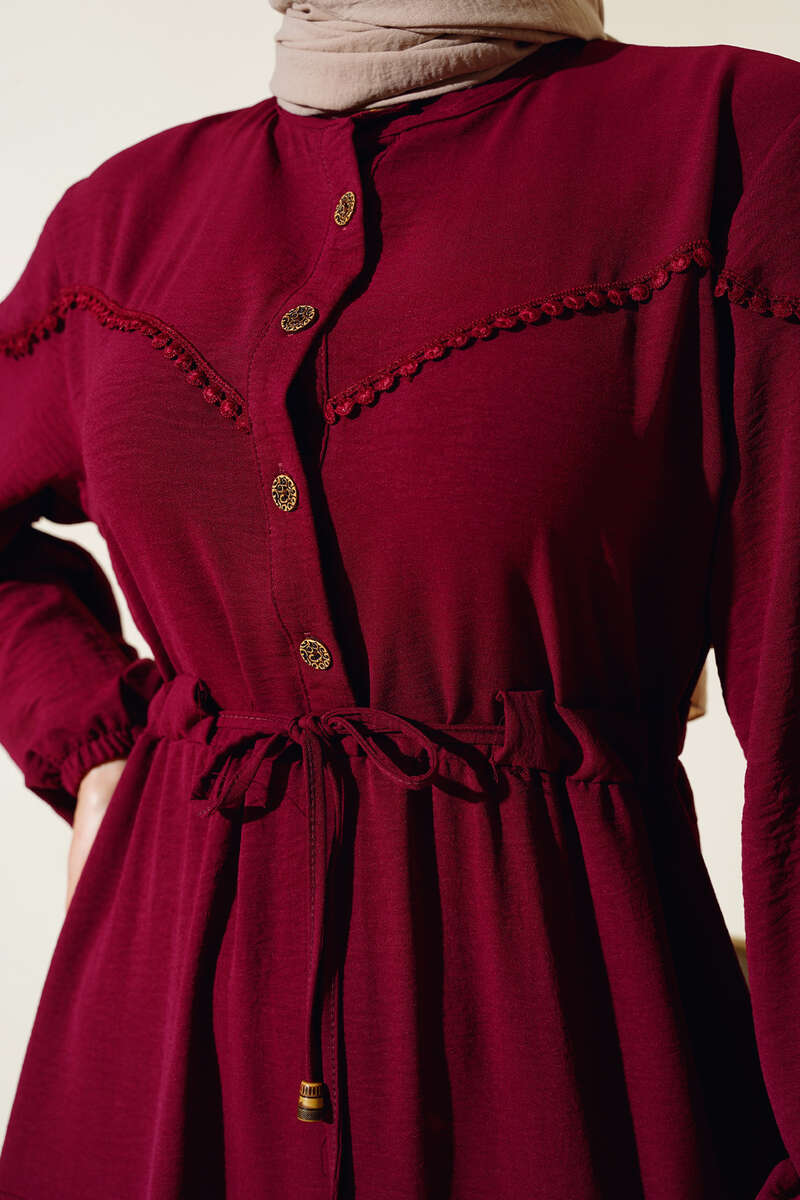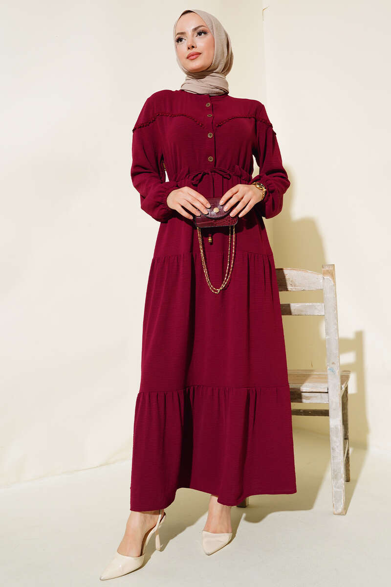 Önü Yarım Düğmeli Kat Kat Elbise Burgonya