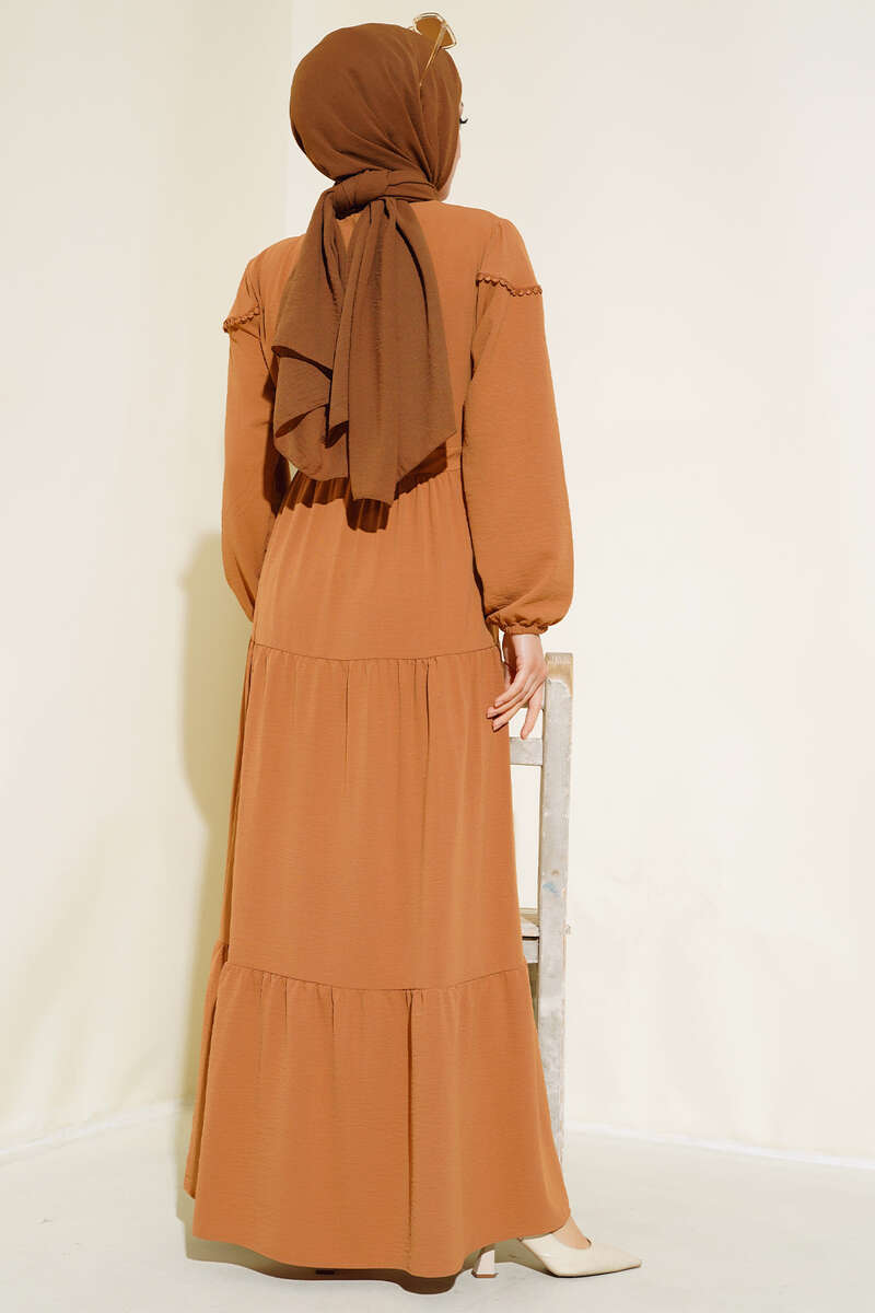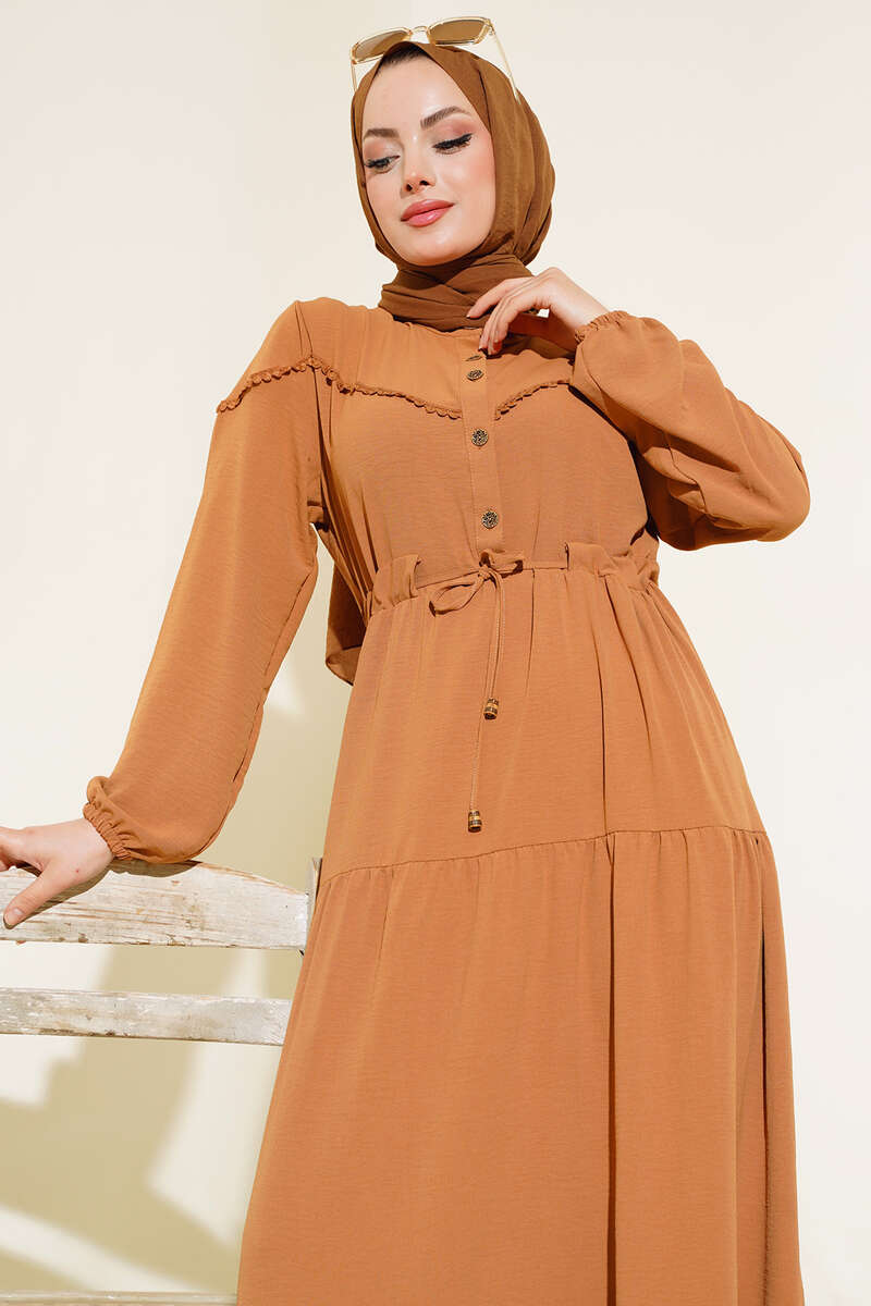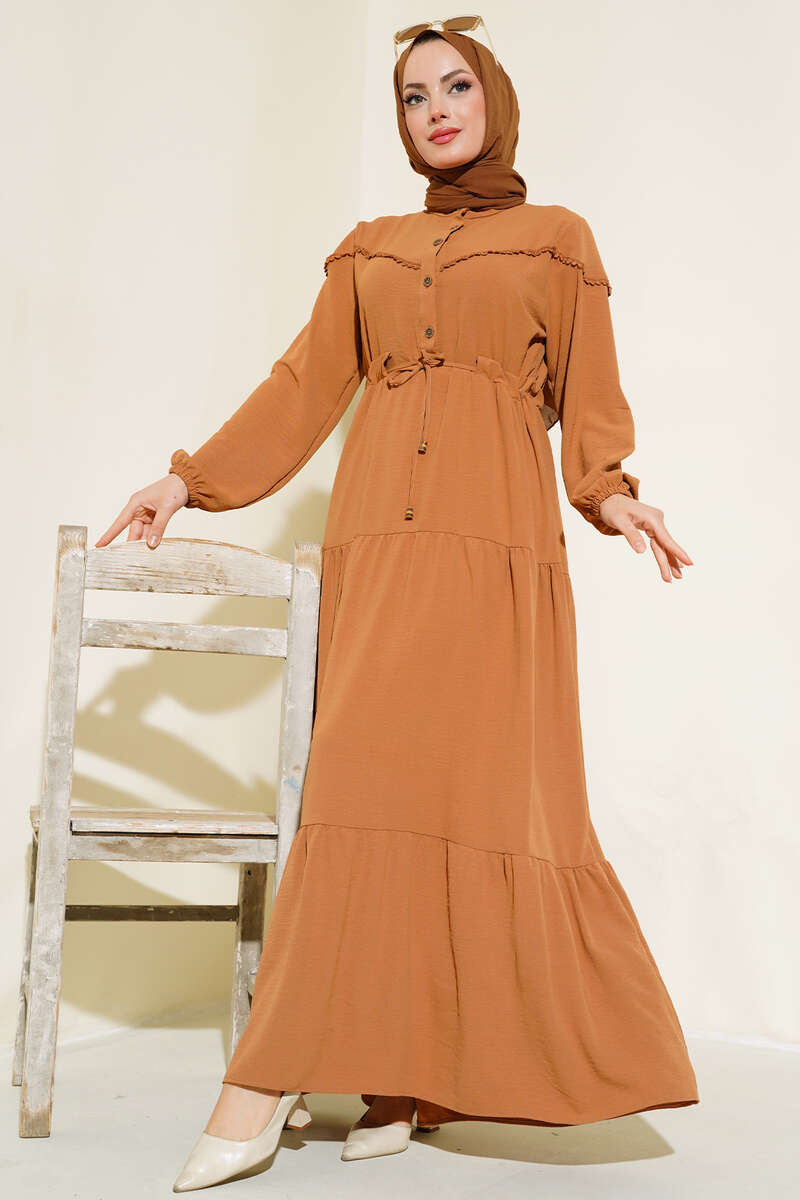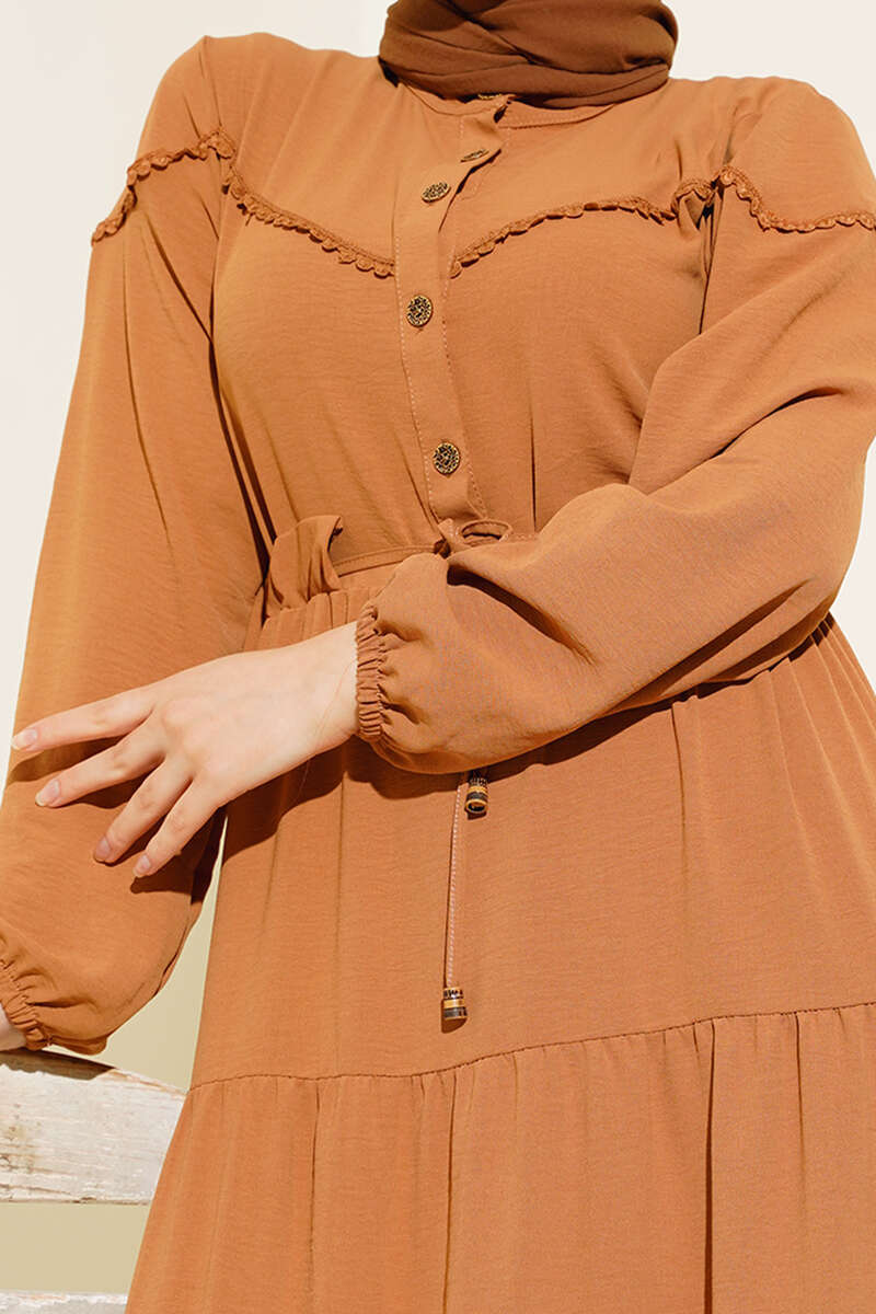 Önü Yarım Düğmeli Kat Kat Elbise Camel