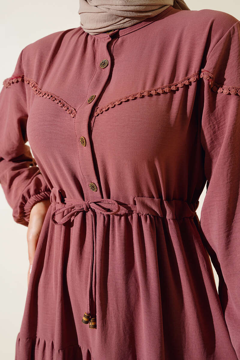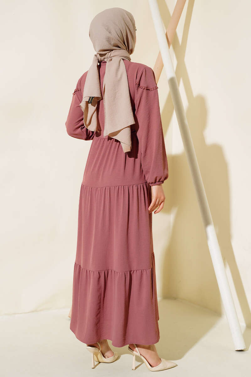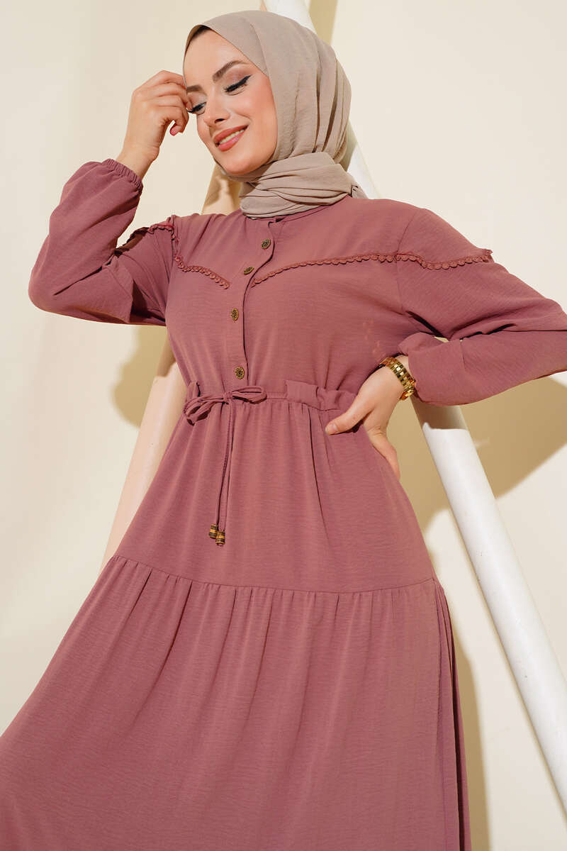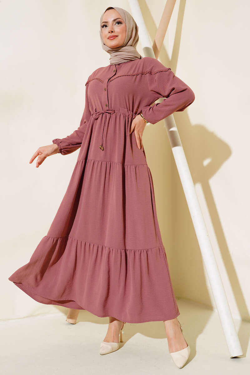 Yeni sezon elbisemiz harika tasarımıyla sizler için geldi. Elbisemizin önü yarım düğmelidir. Elbisemizin beli tünelli olup, ip bağcıklıdır. Kol bilekleri lastiklidir. Dik yakadır. Elbisemiz kat kat modeldir. Astarsızdır. Sade ve şık elbisemiz renk seçenekleriyle dolabınızda yerini beklemektedir.