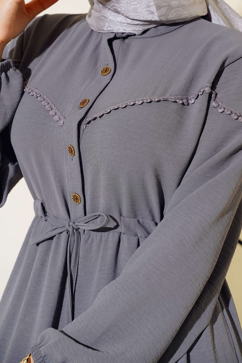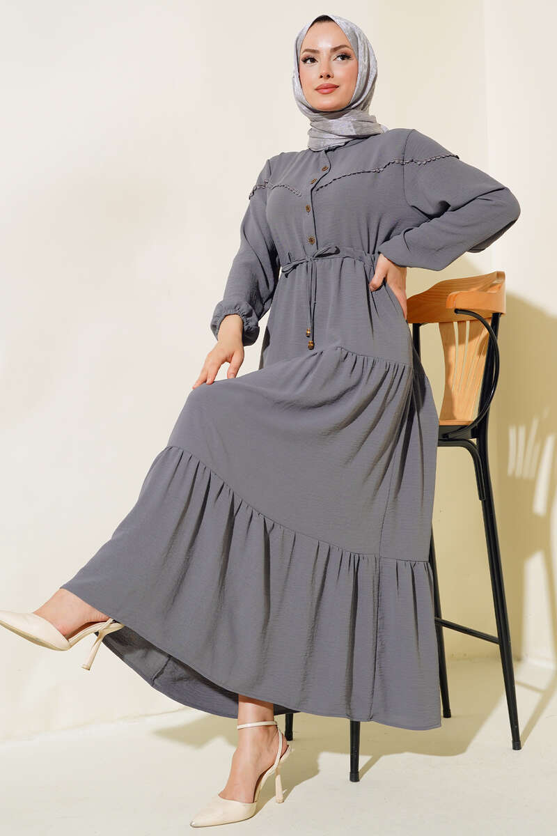 Önü Yarım Düğmeli Kat Kat Elbise Kayrak Grisi