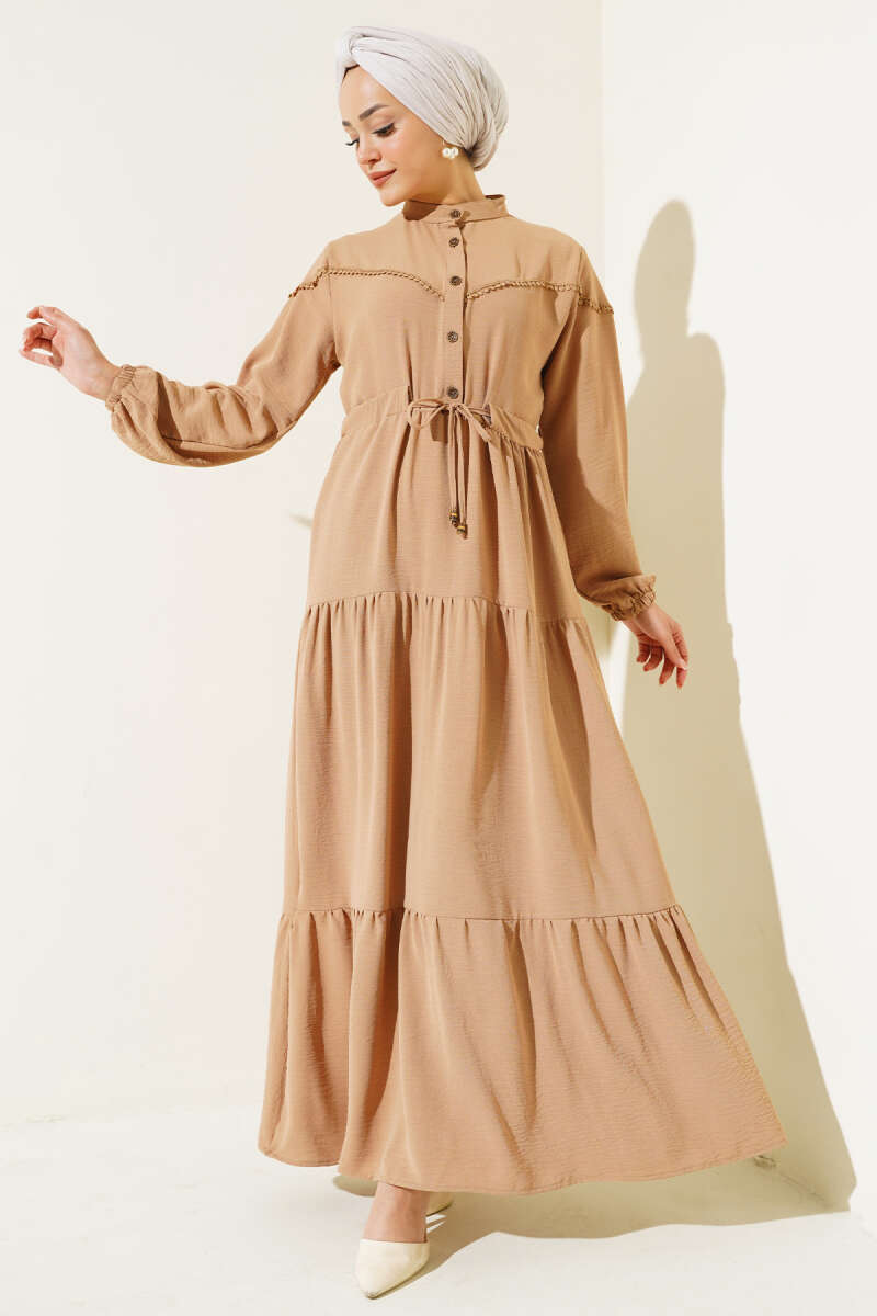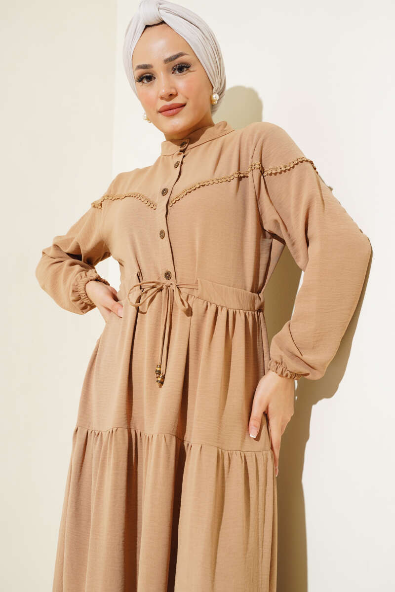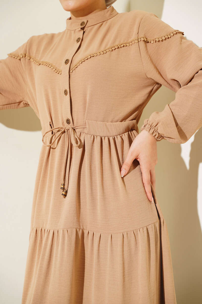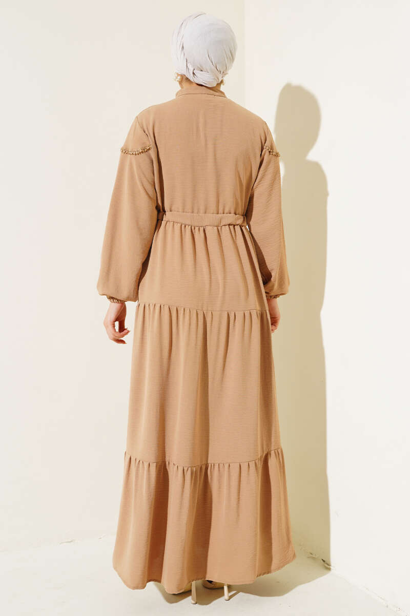 Kuşaklı Dik Fitilli Kaşe Elbise Latte
