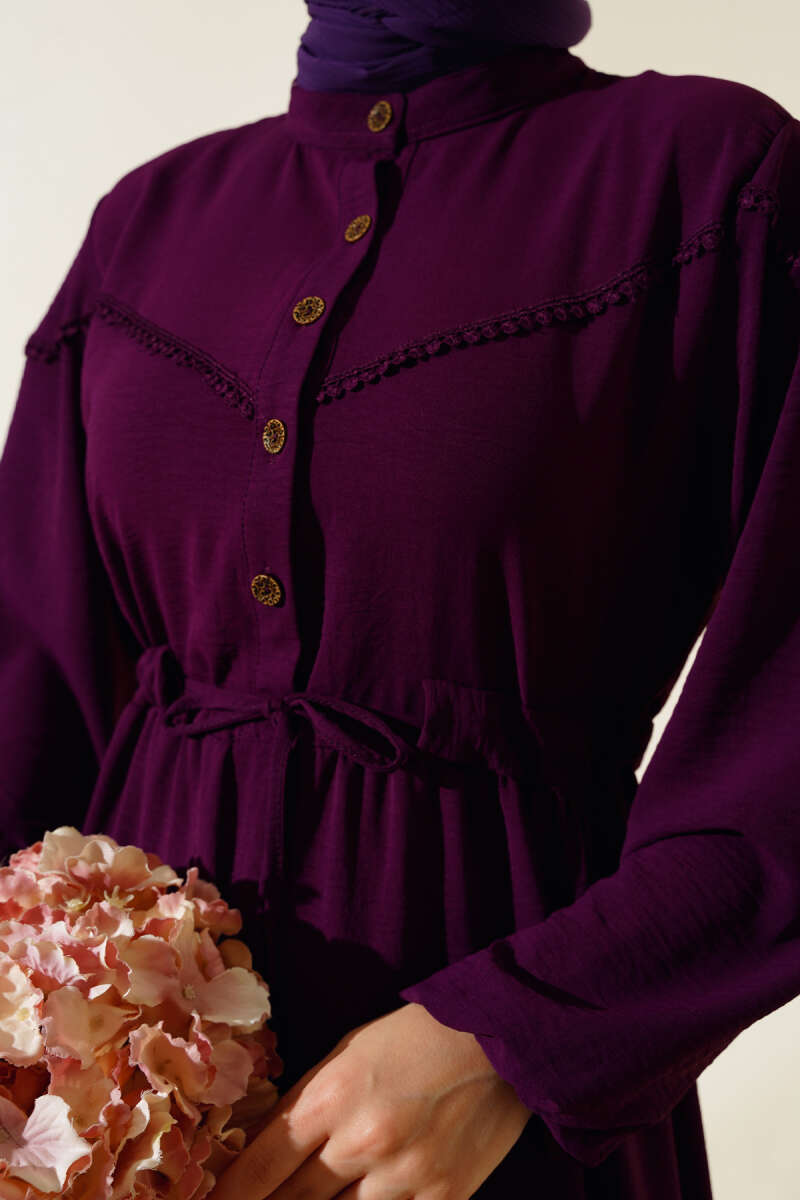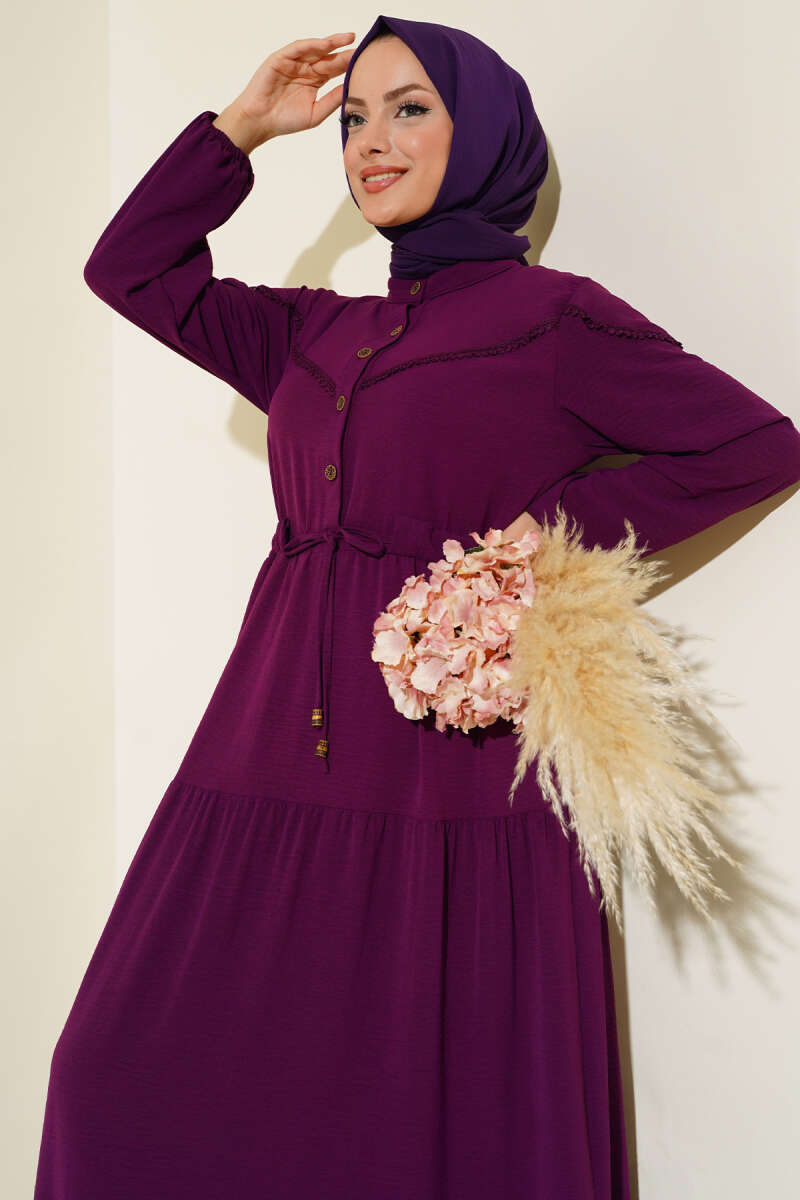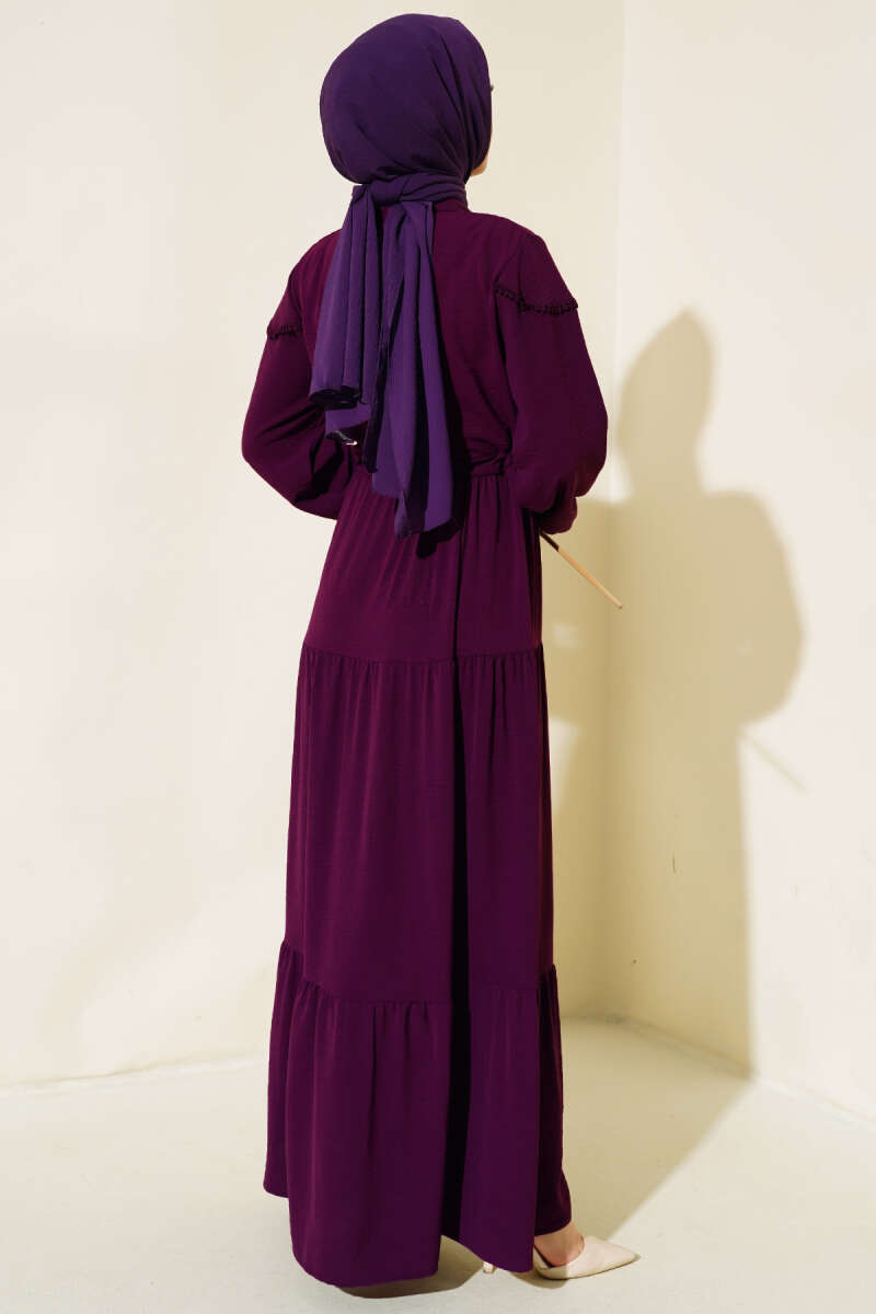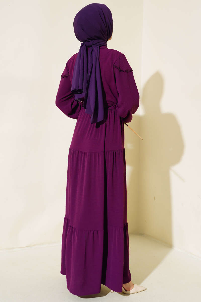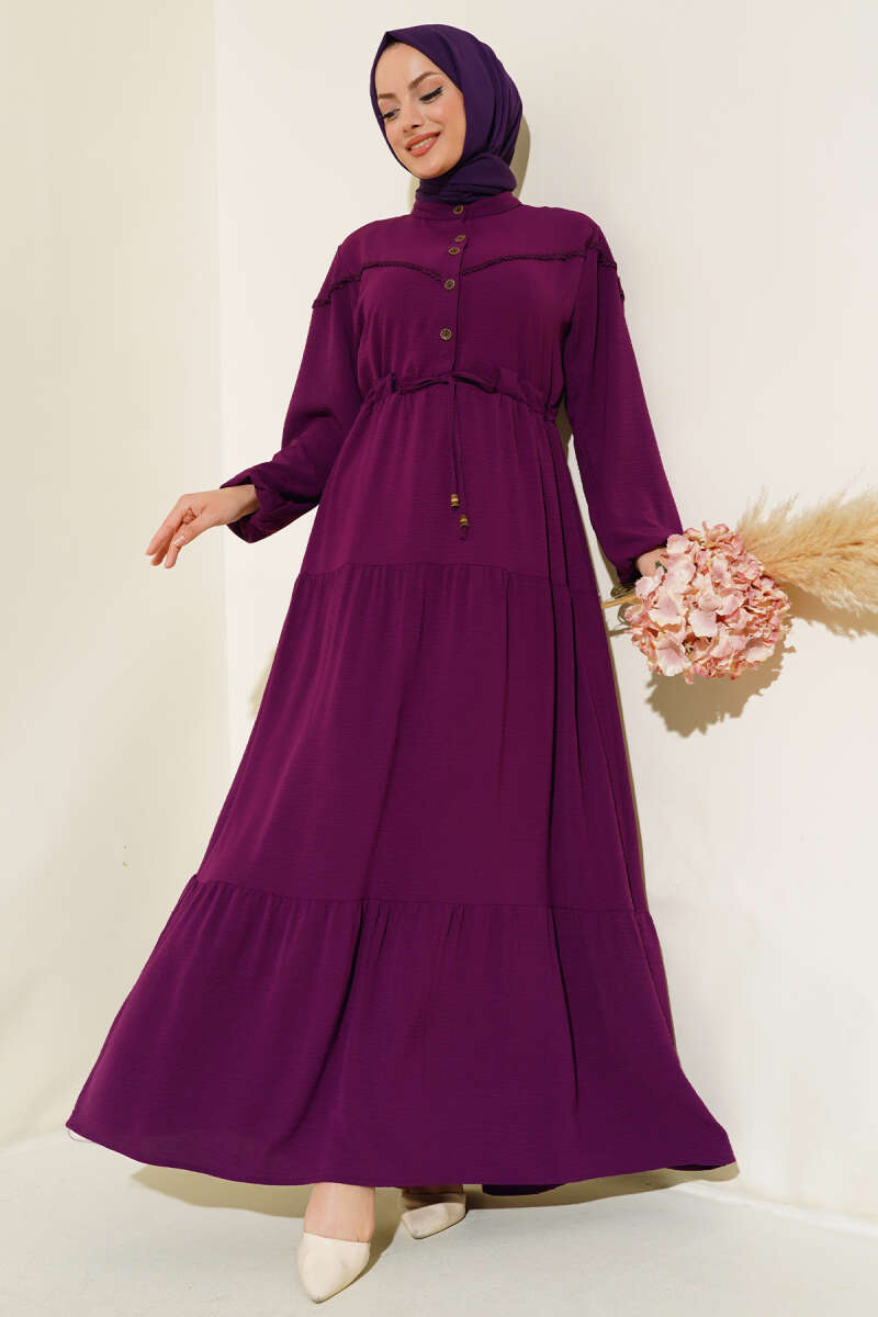Önü Yarım Düğmeli Kat Kat Elbise Mor