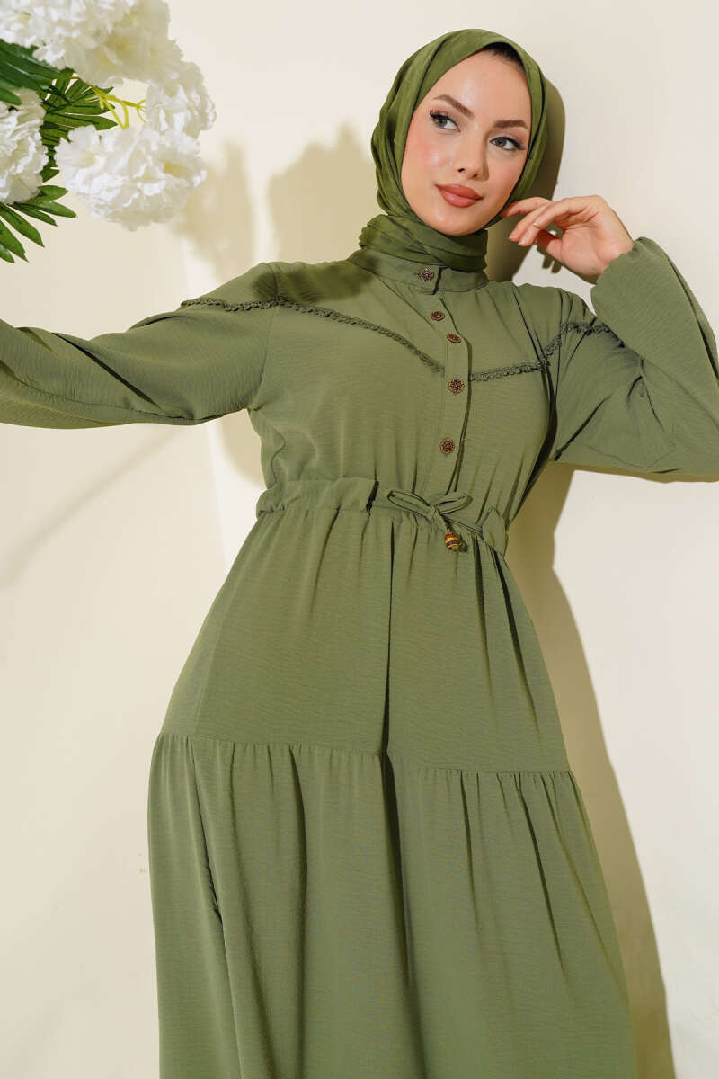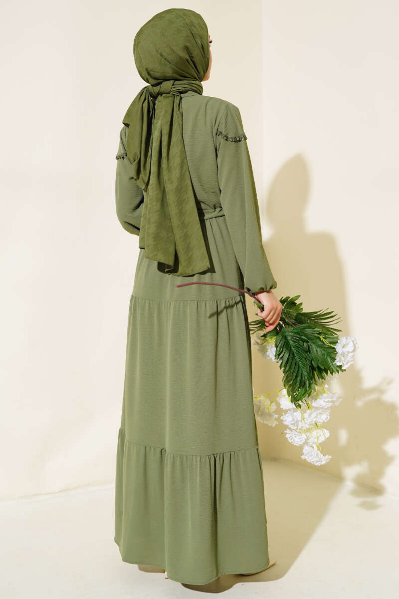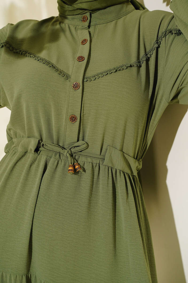 Kuşaklı Dik Fitilli Kaşe Elbise Haki