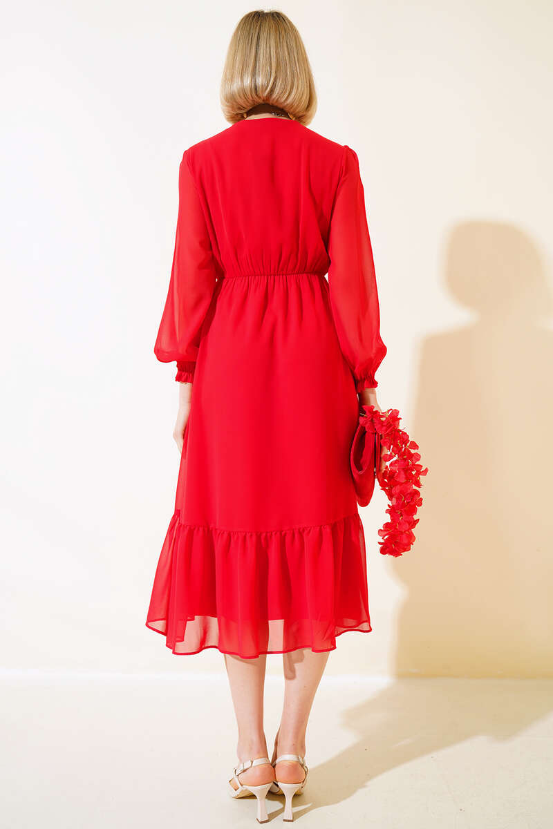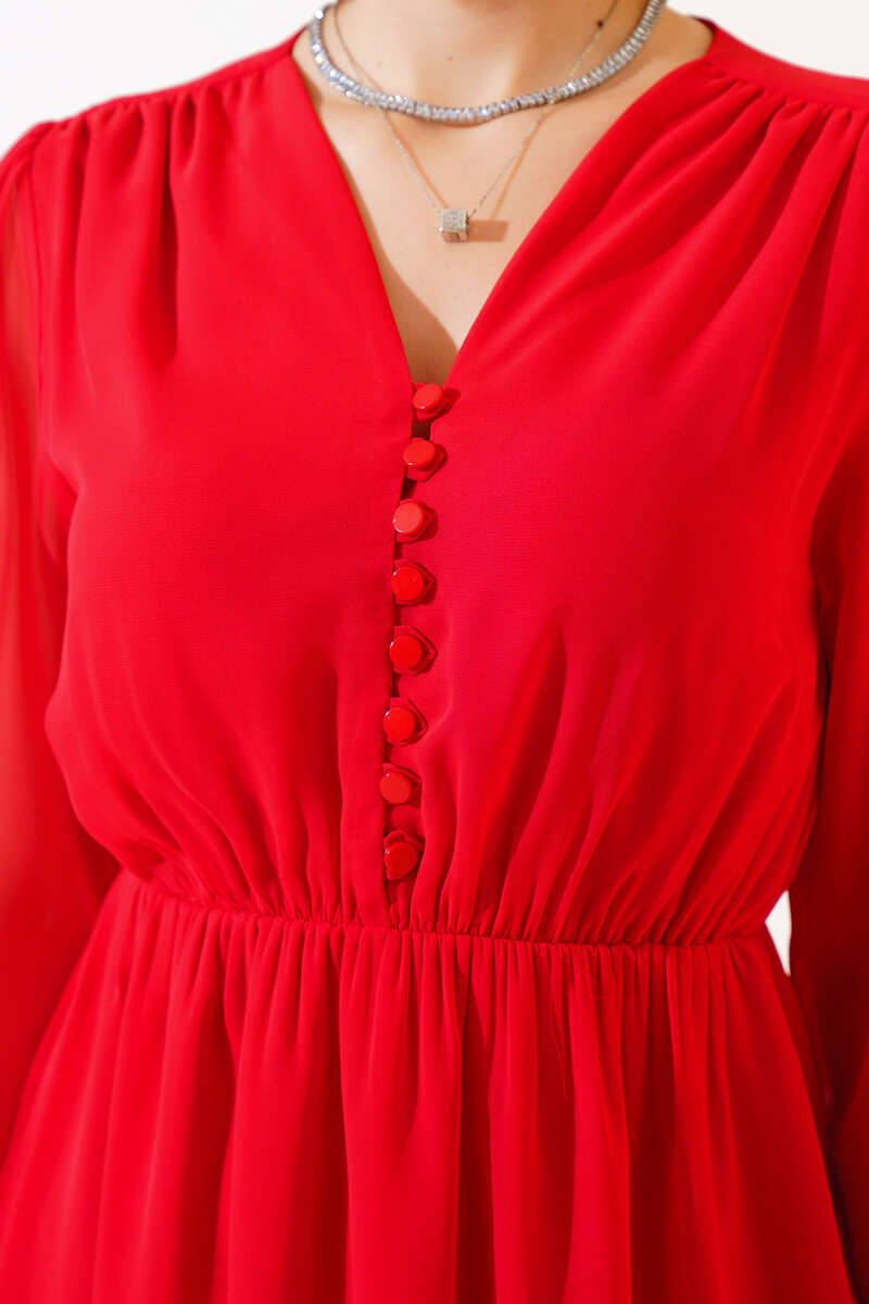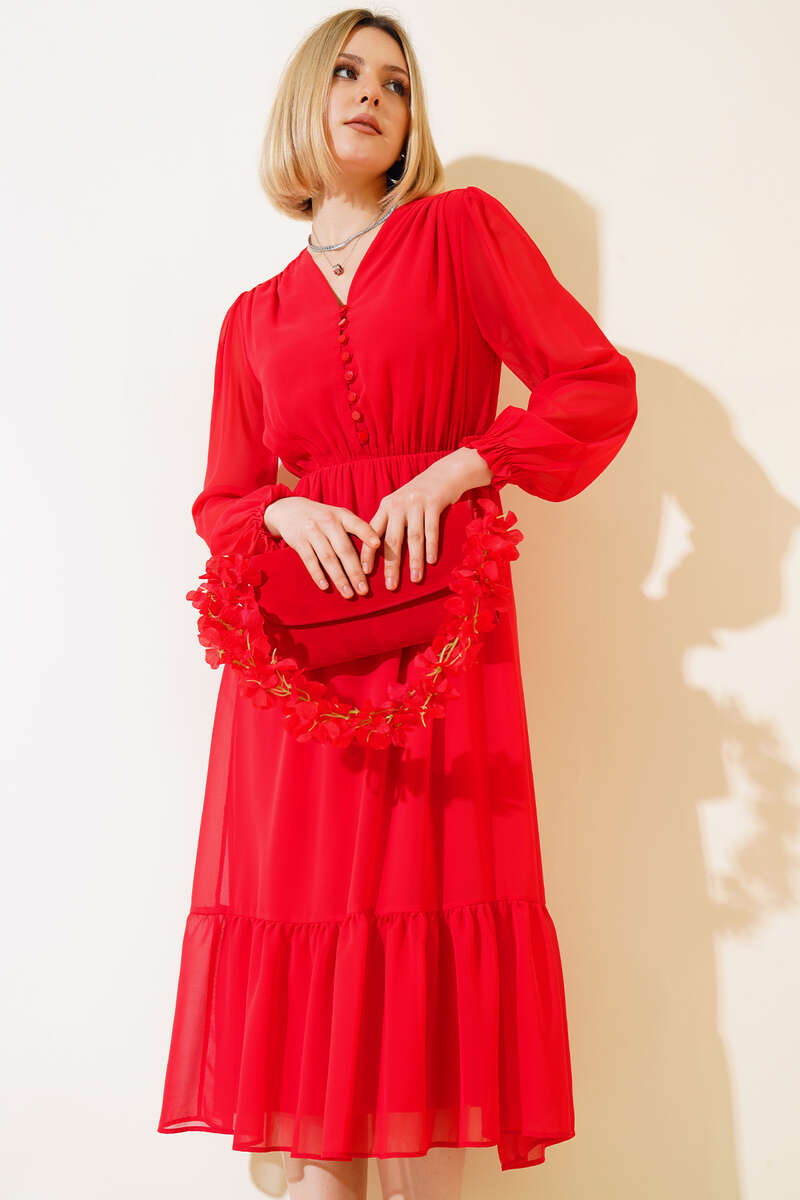 Önü Yarım Düğmeli Şifon Midi Elbise Nar Çiçeği