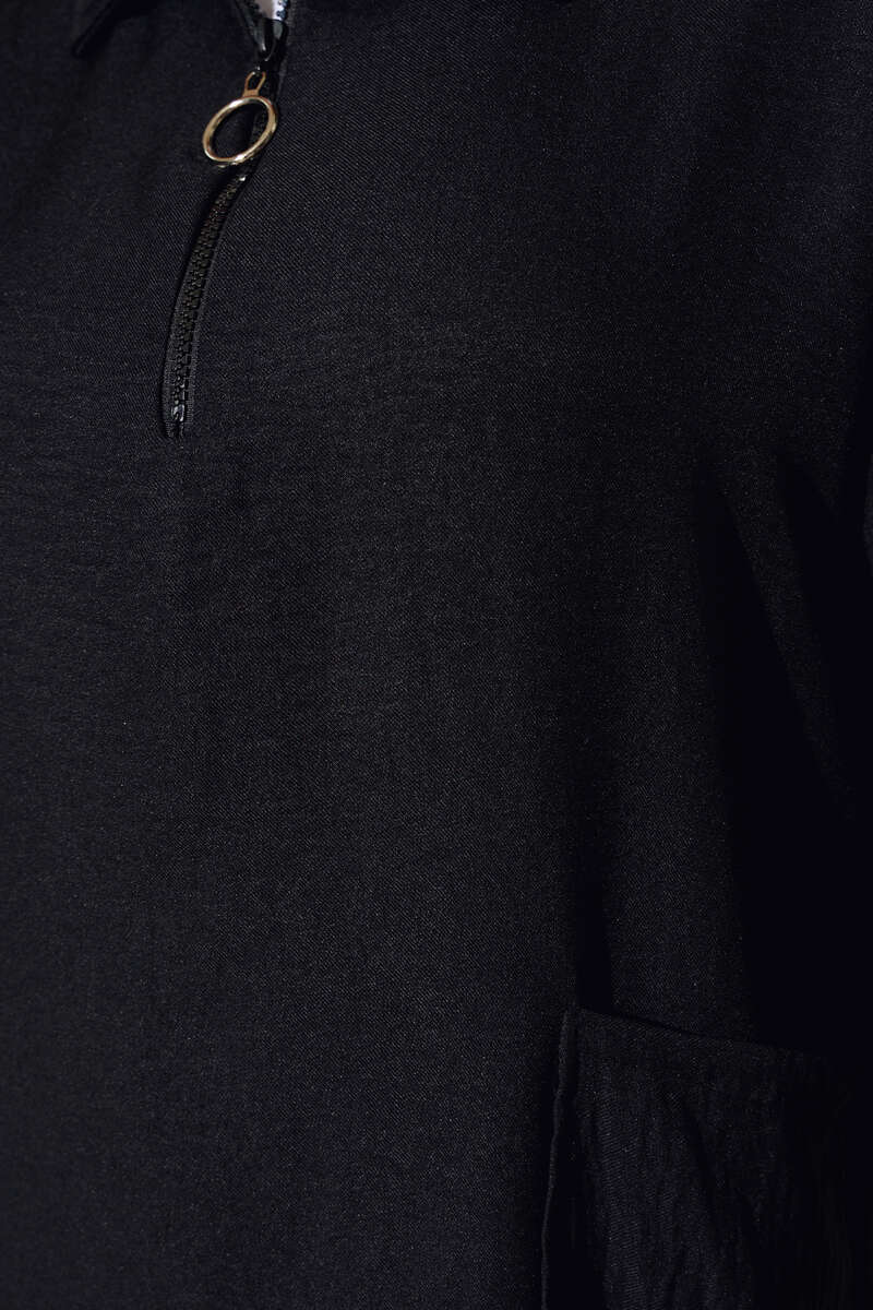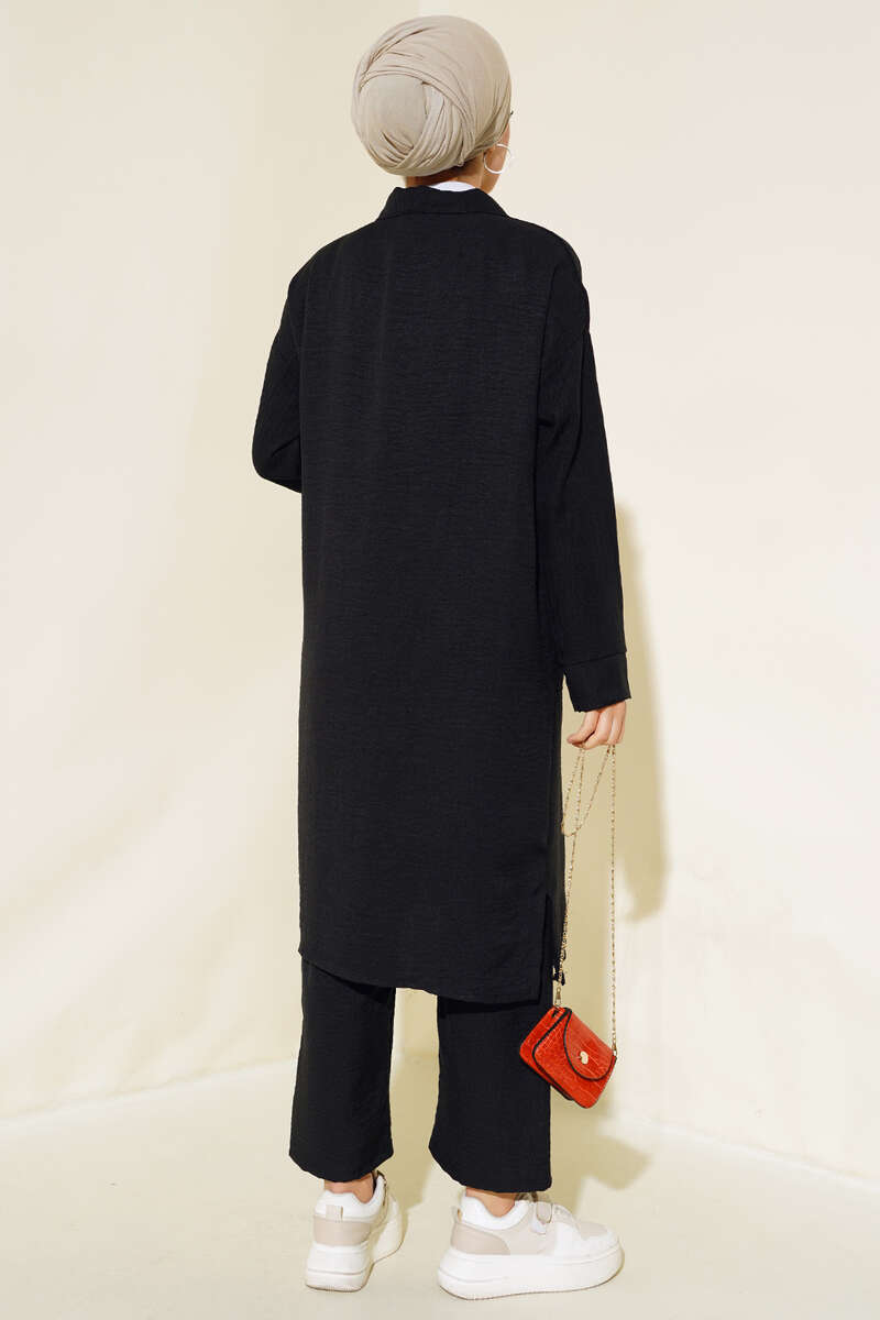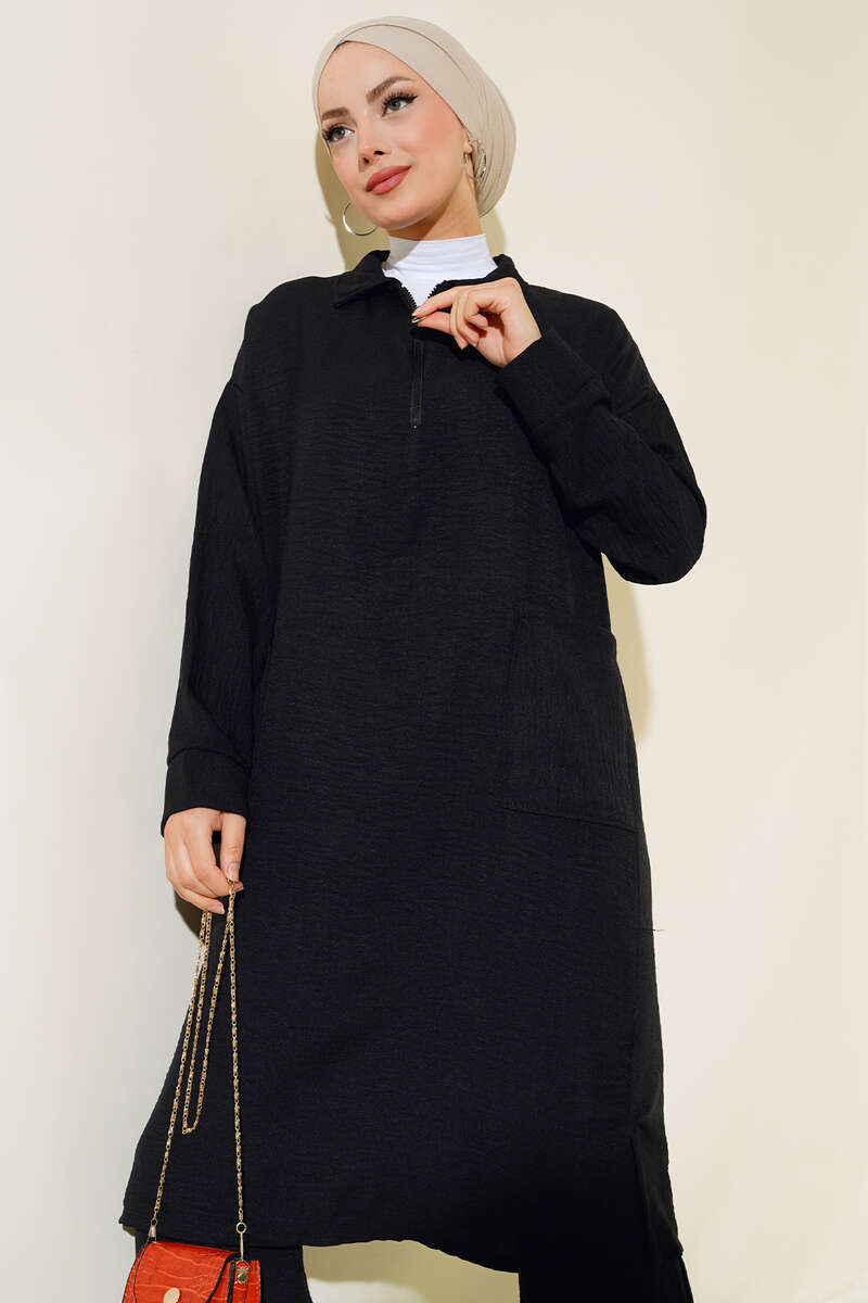 Önü Yarım Fermuarlı Keten İkili Takım Siyah