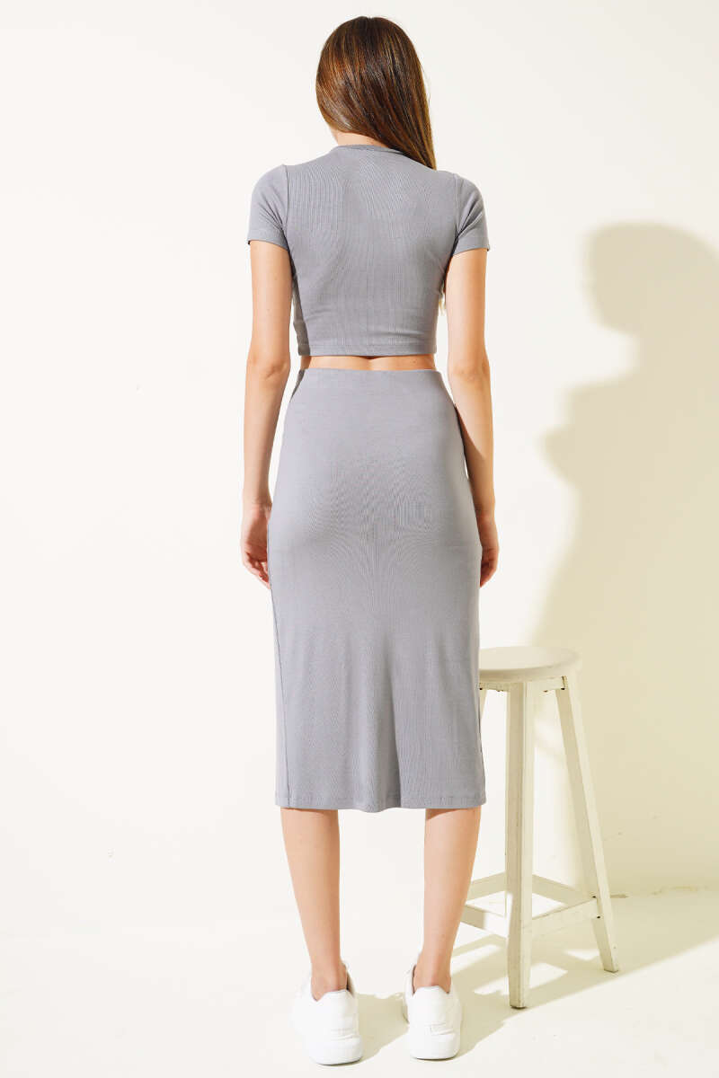 Önü Yırtmaçlı Etekli İkili Takım Gri