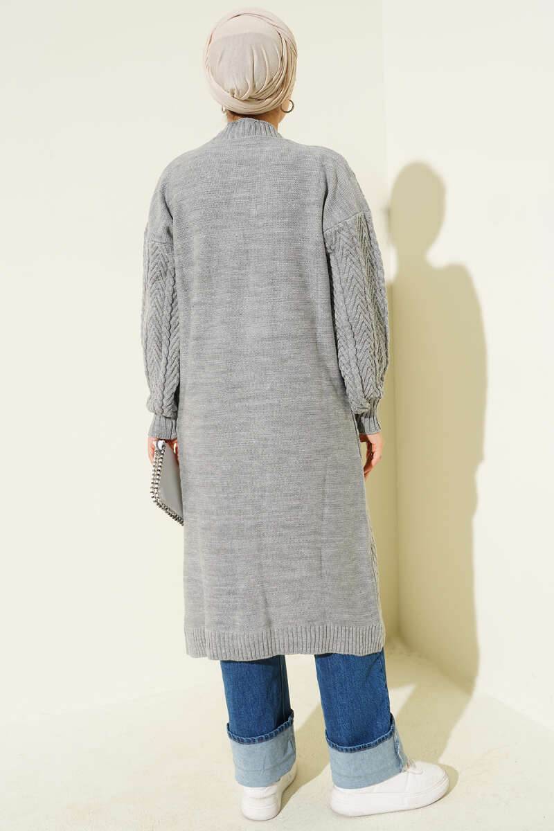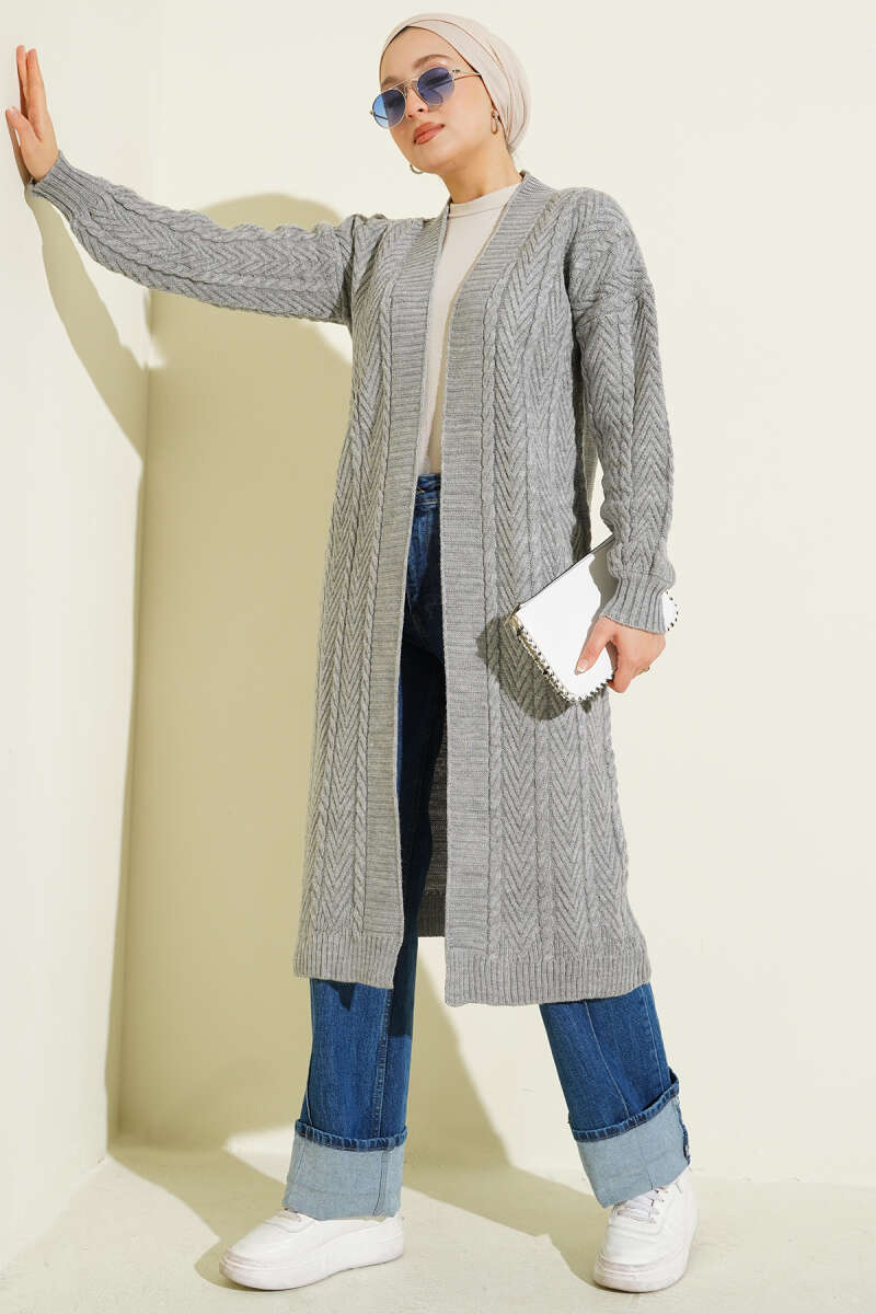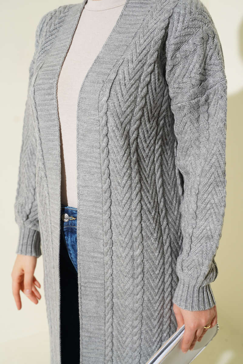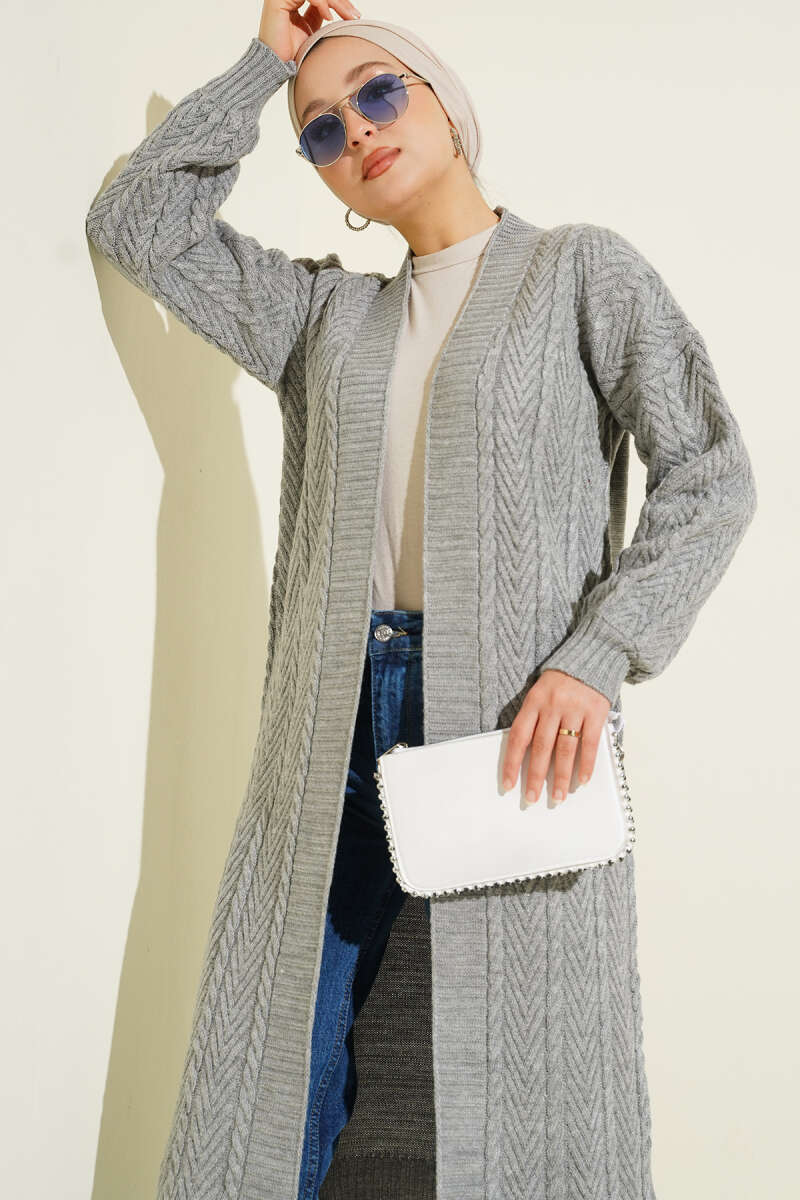 Örgü Büzgülü Uzun Triko Hırka Gri
