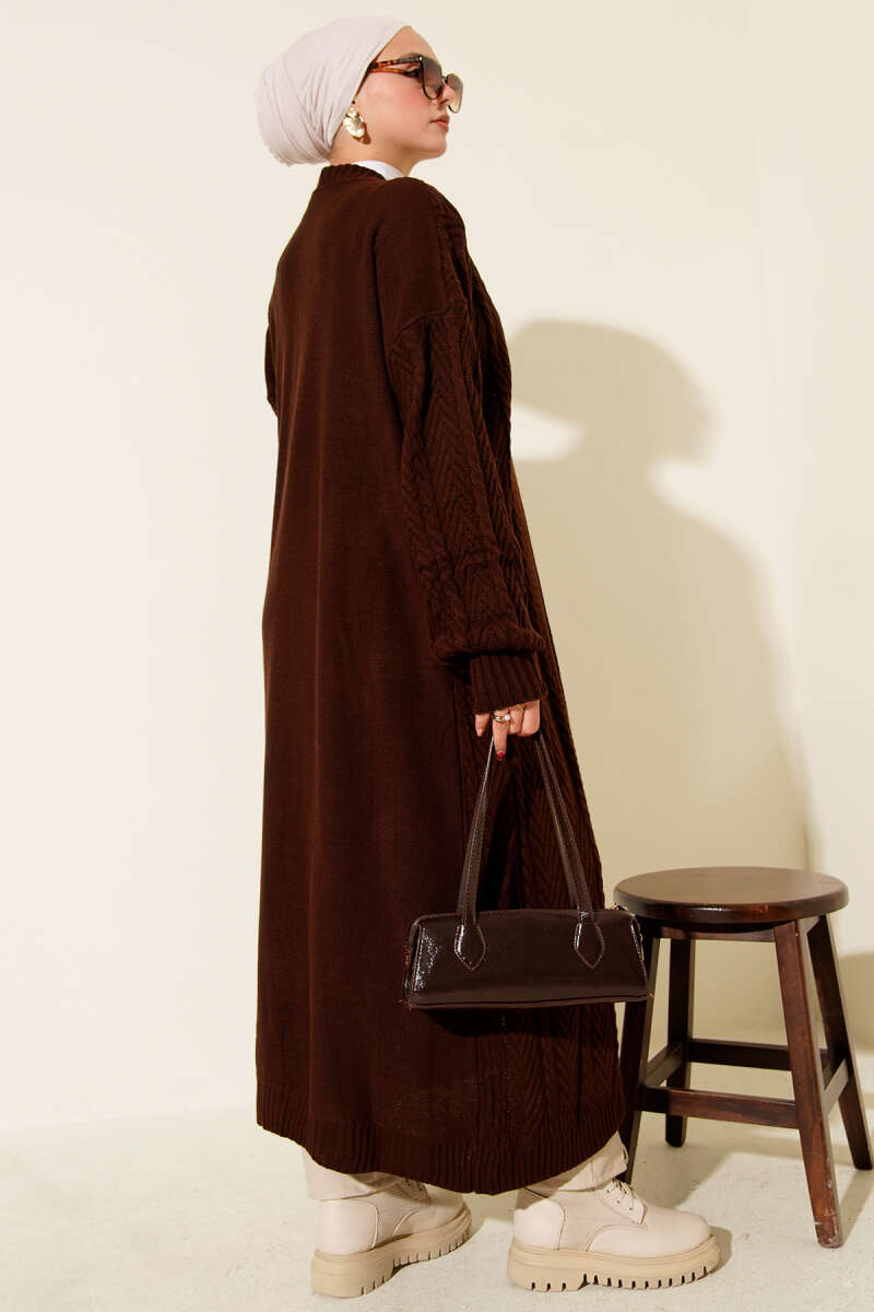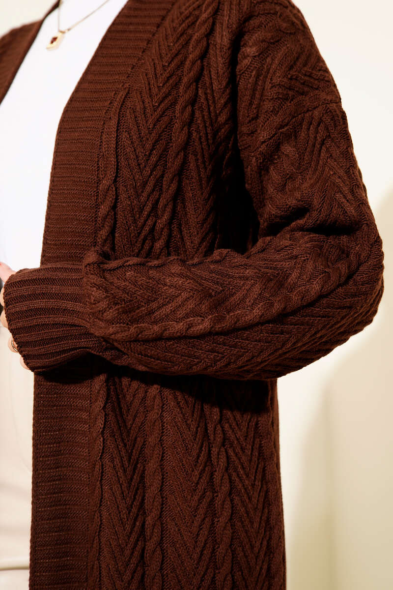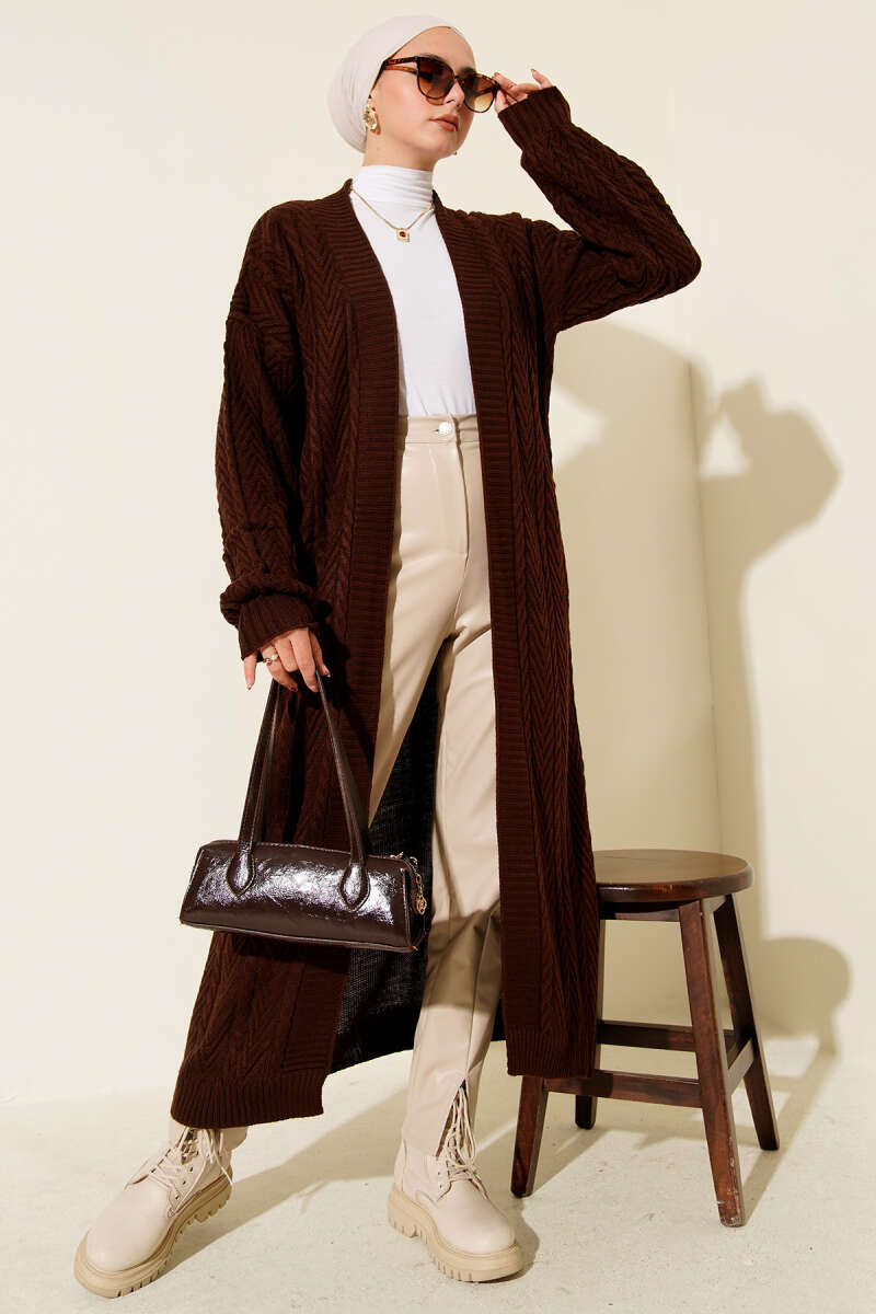 Örgü Büzgülü Uzun Triko Hırka Kahve