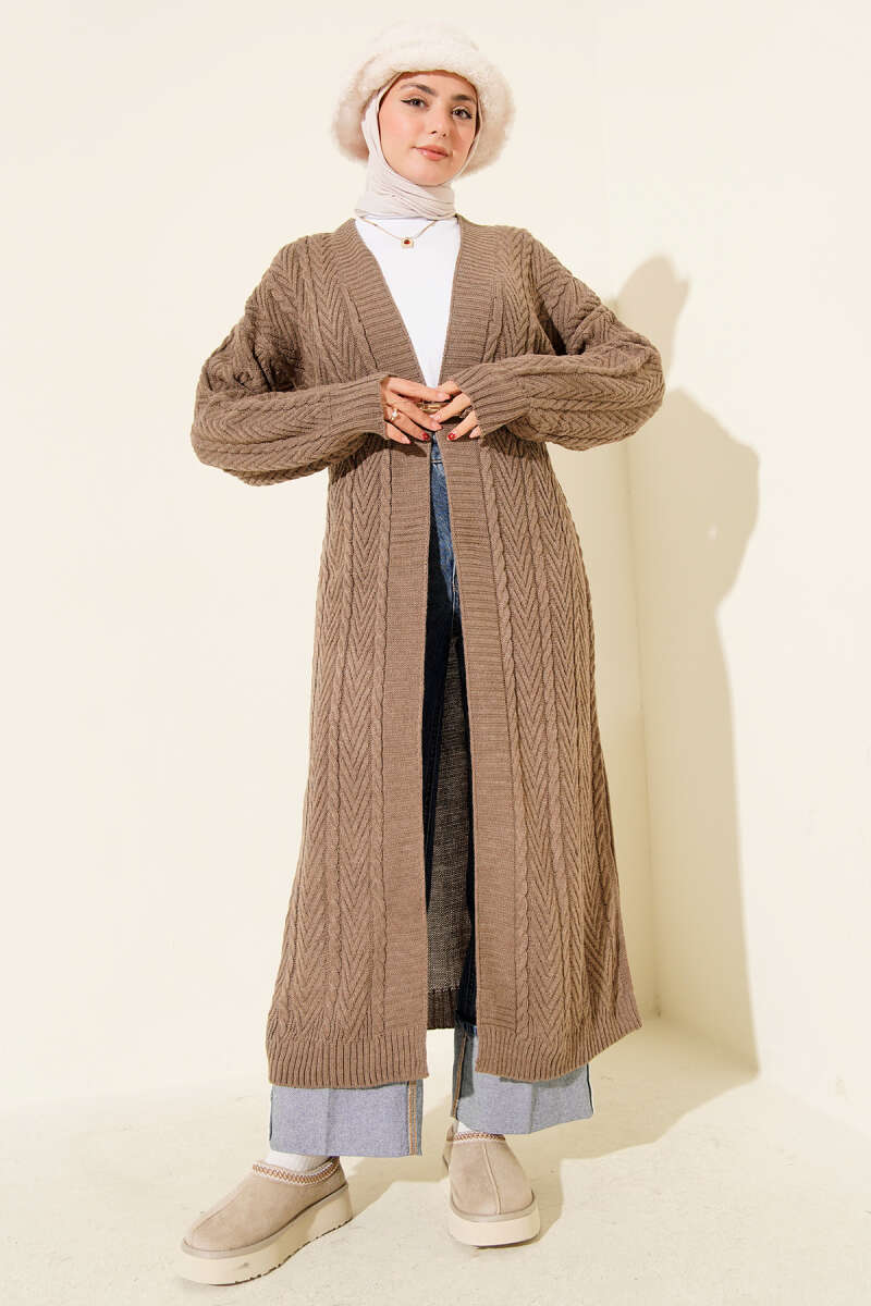 Örgü Büzgülü Uzun Triko Hırka Vizon