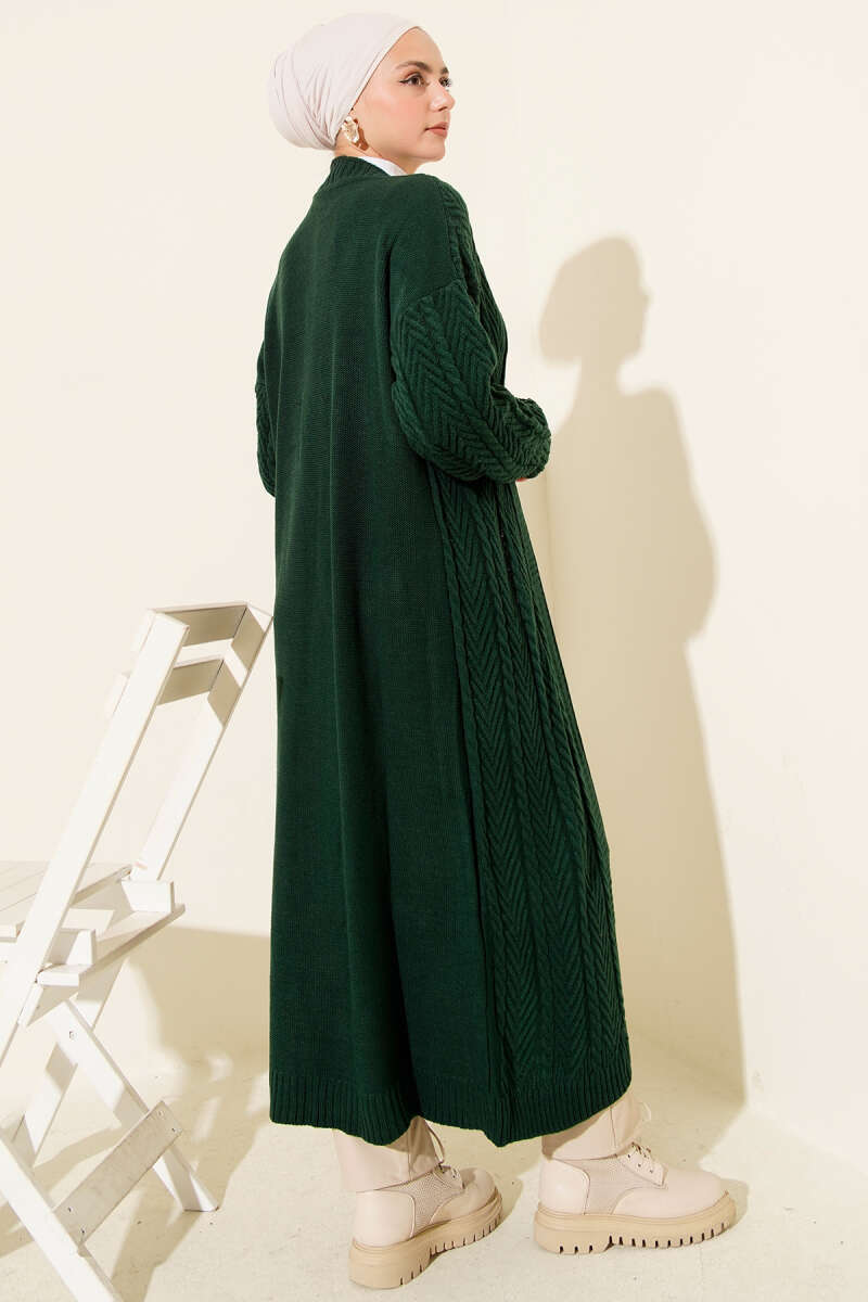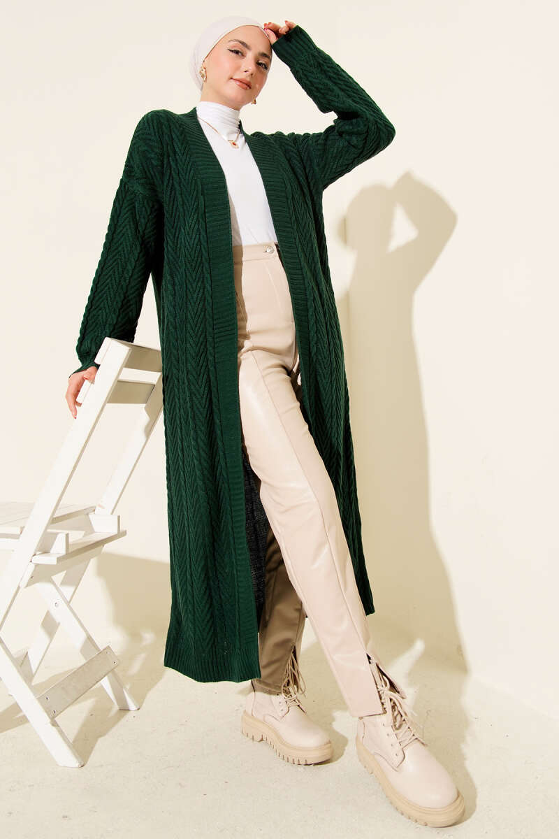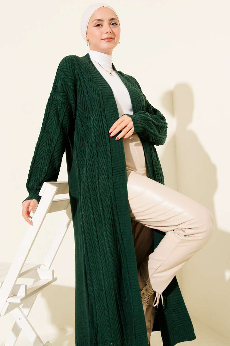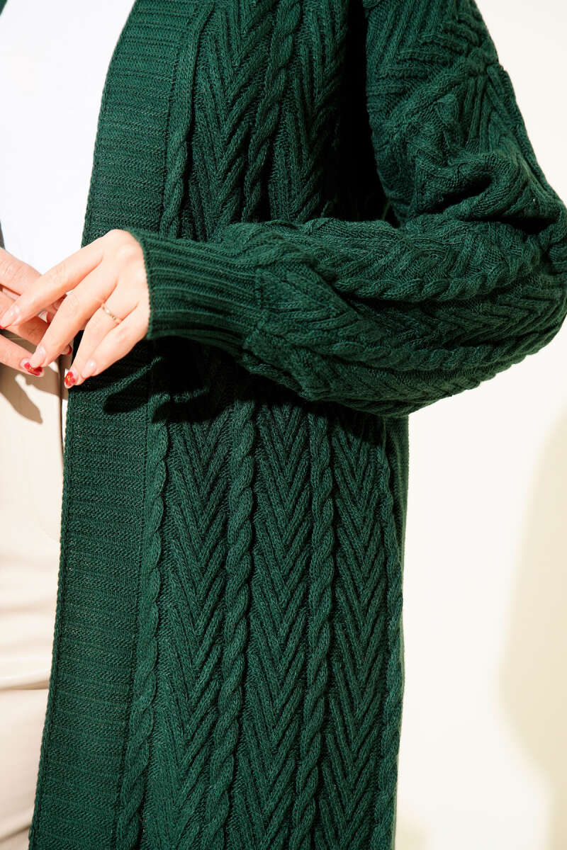 Örgü Büzgülü Uzun Triko Hırka Zümrüt Yeşili
