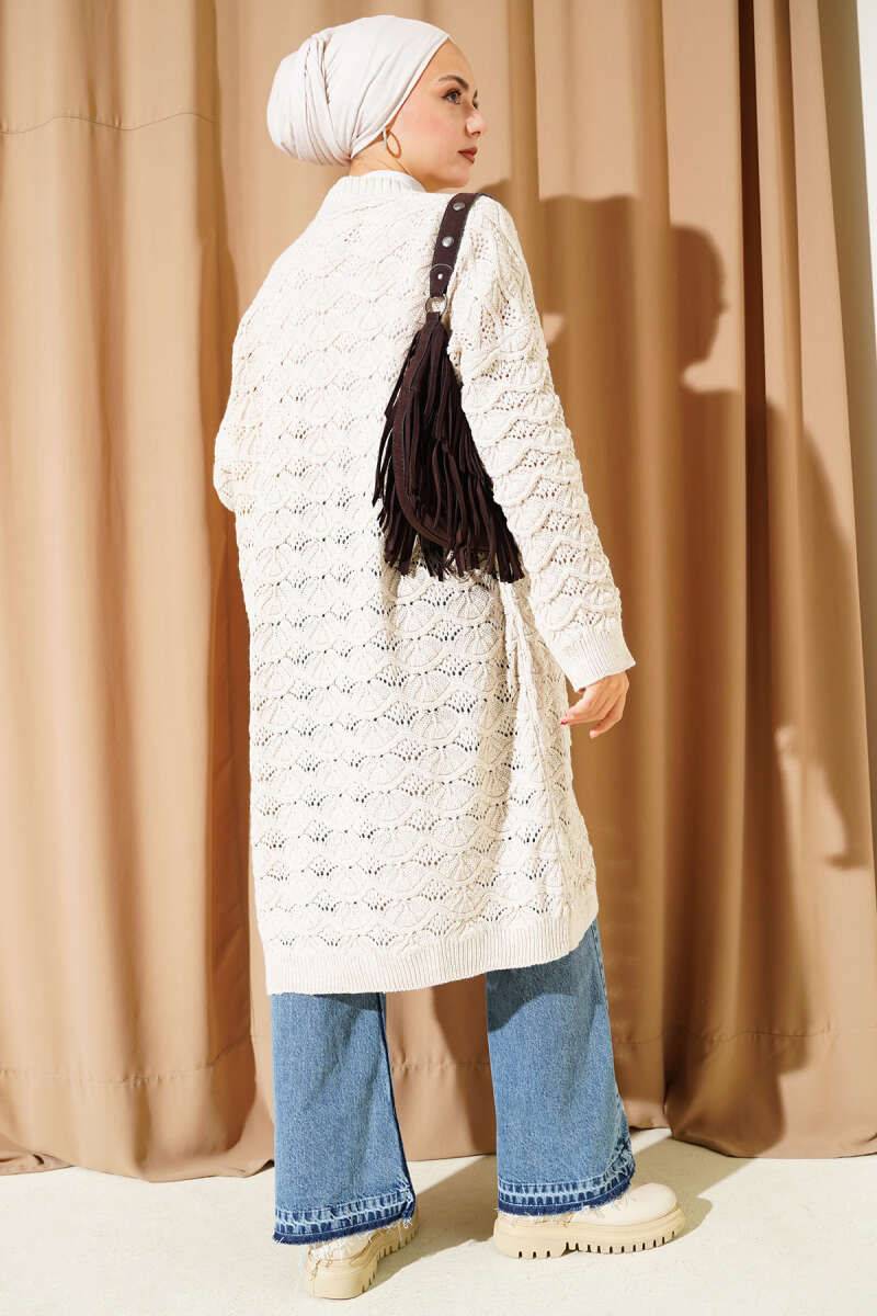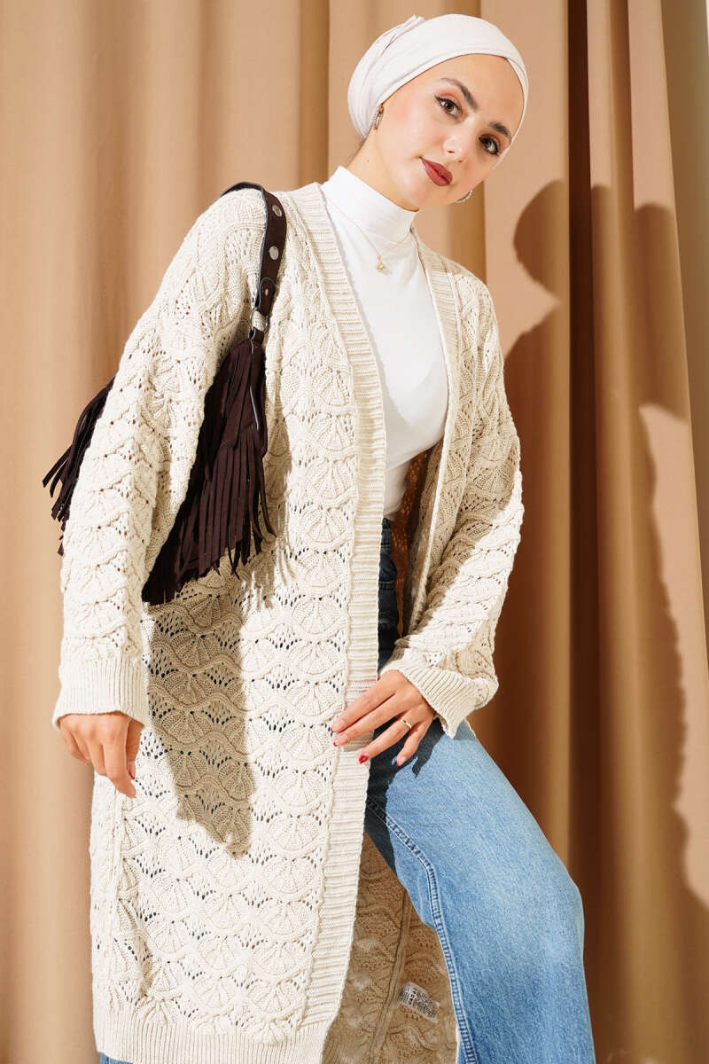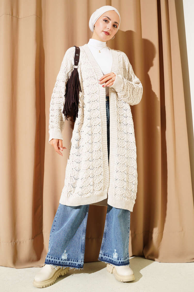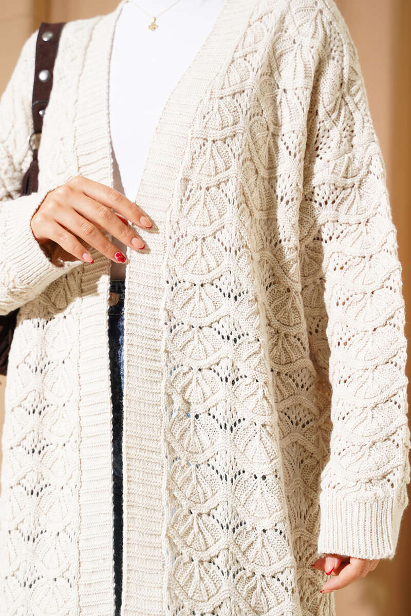 Şal Yaka Pirinç Örgü Triko Hırka Ekru
