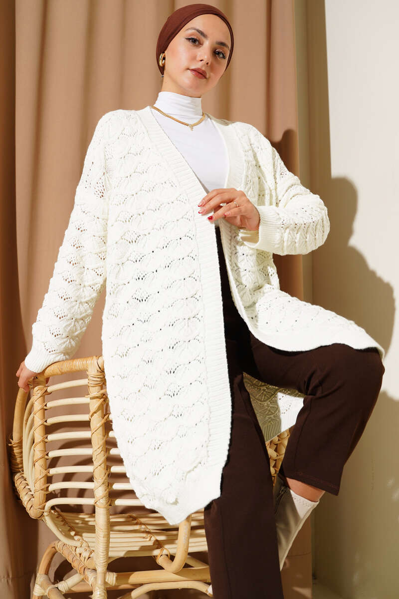 Şal Yaka Pirinç Örgü Triko Hırka Ekru