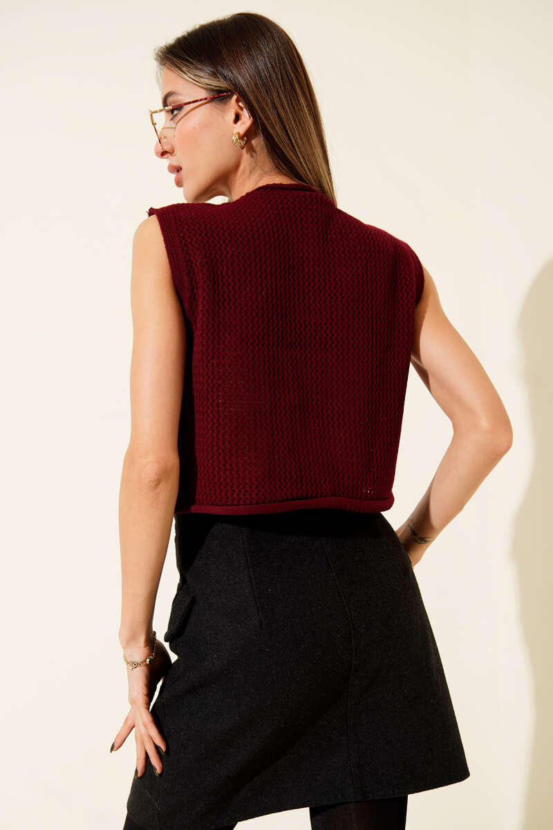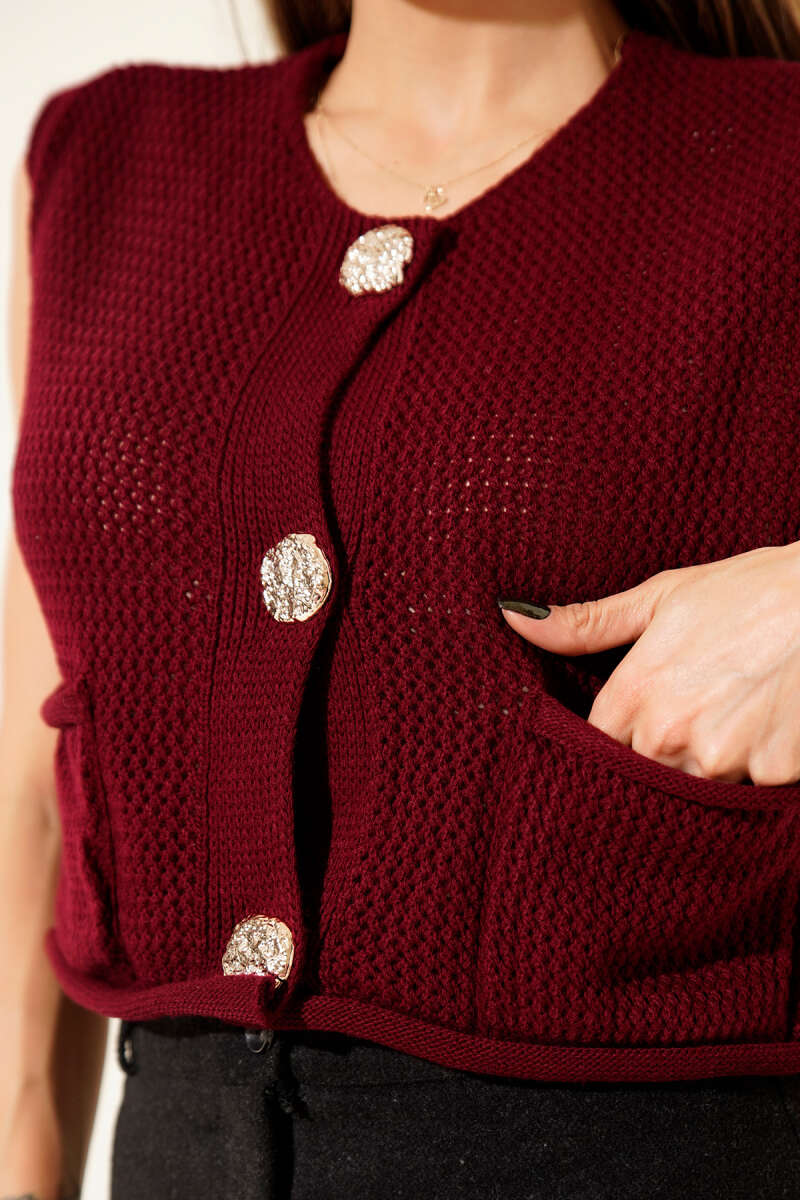 Örgü Detaylı Düğmeli Triko Yelek Bordo