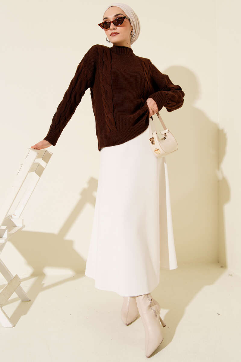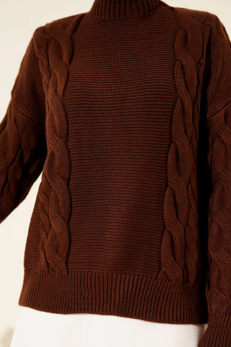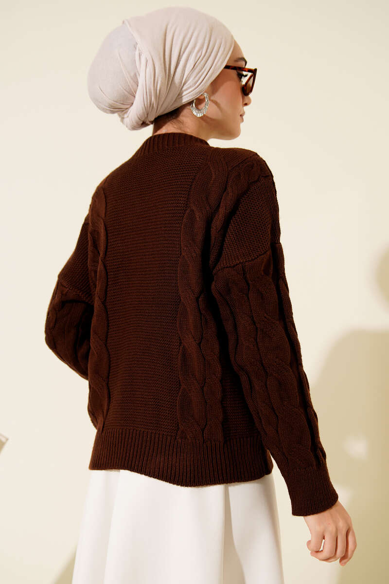 Zikzak Desen Ajurlu Triko Kazak Kahve