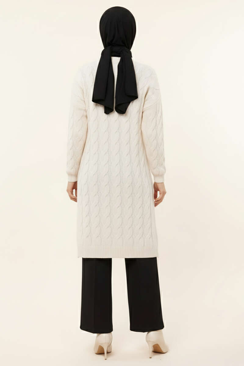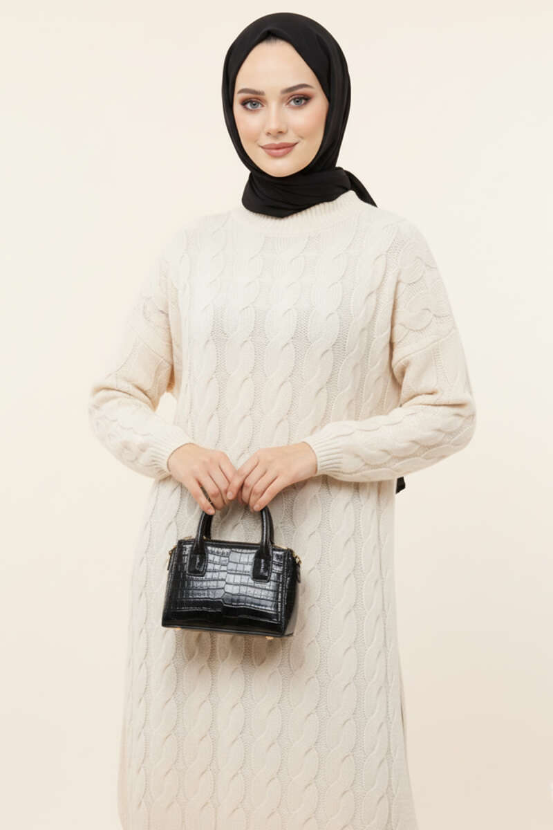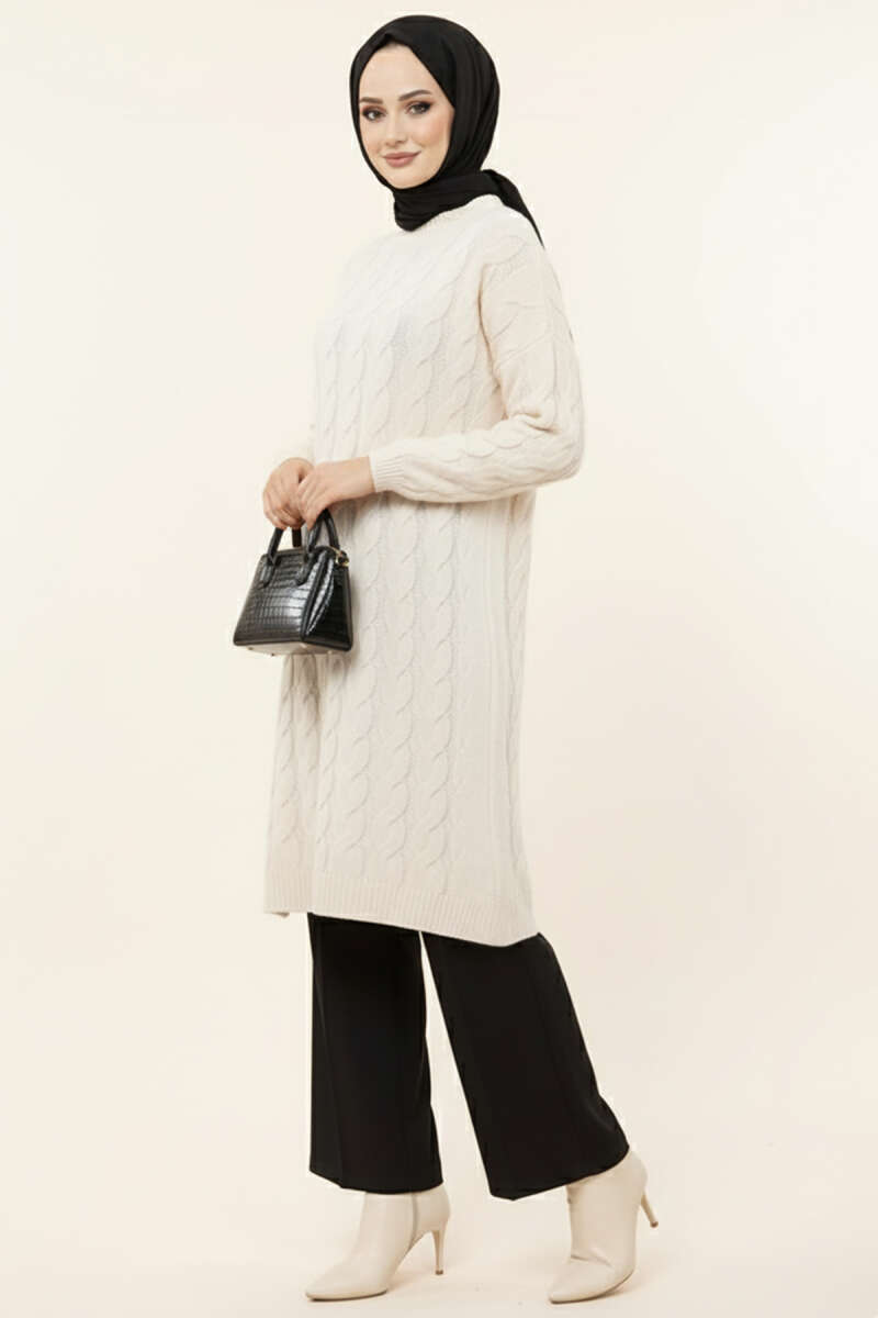 Tek Cep Örgülü Uzun Triko Tunik Ekru