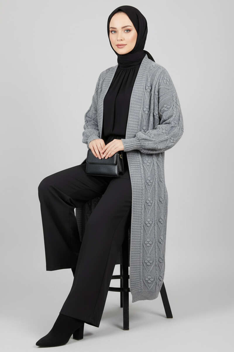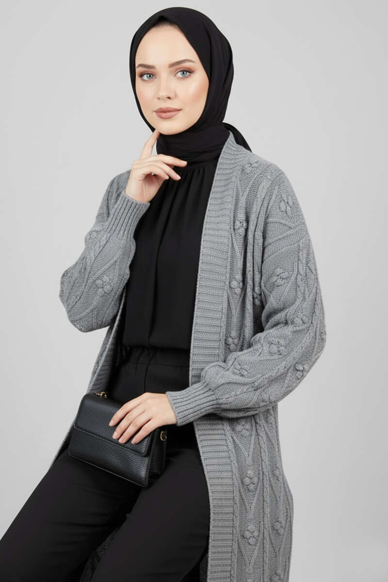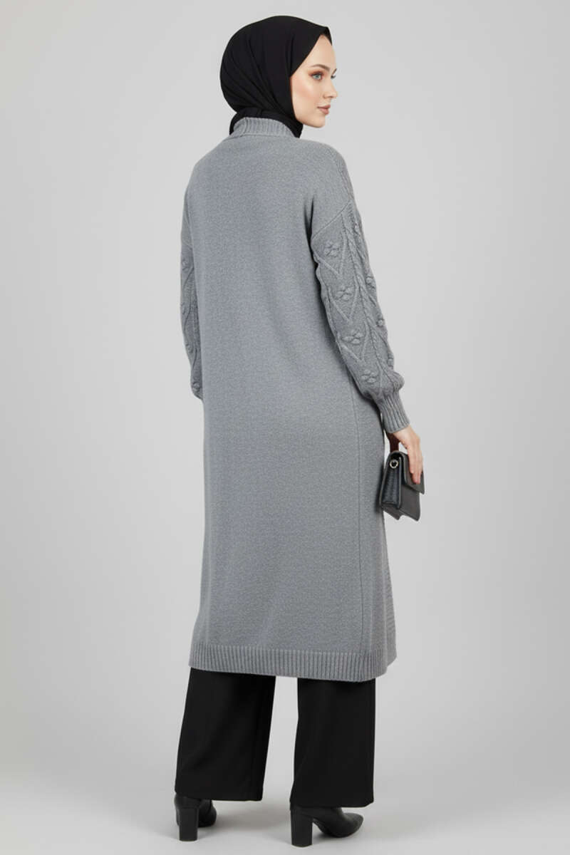 Örgü Kabartma Desenli Uzun Triko Hırka Gri
