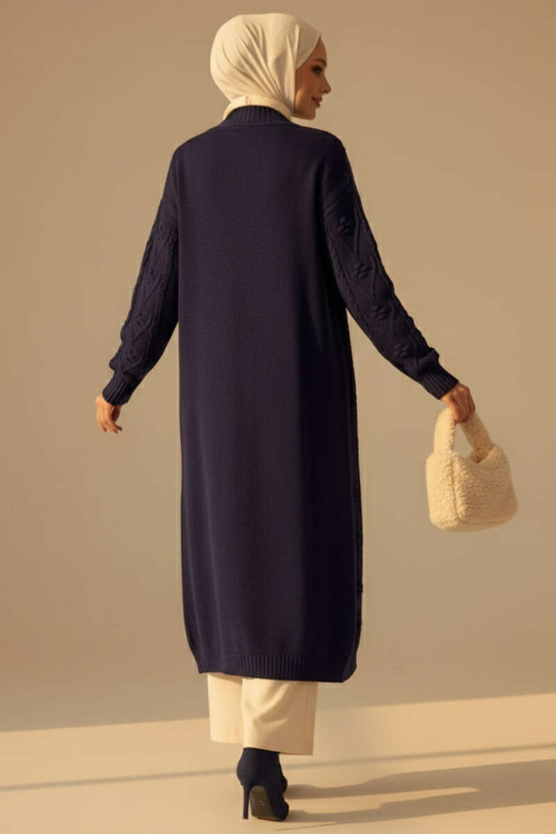 Örgü Kabartma Desenli Uzun Triko Hırka Lacivert