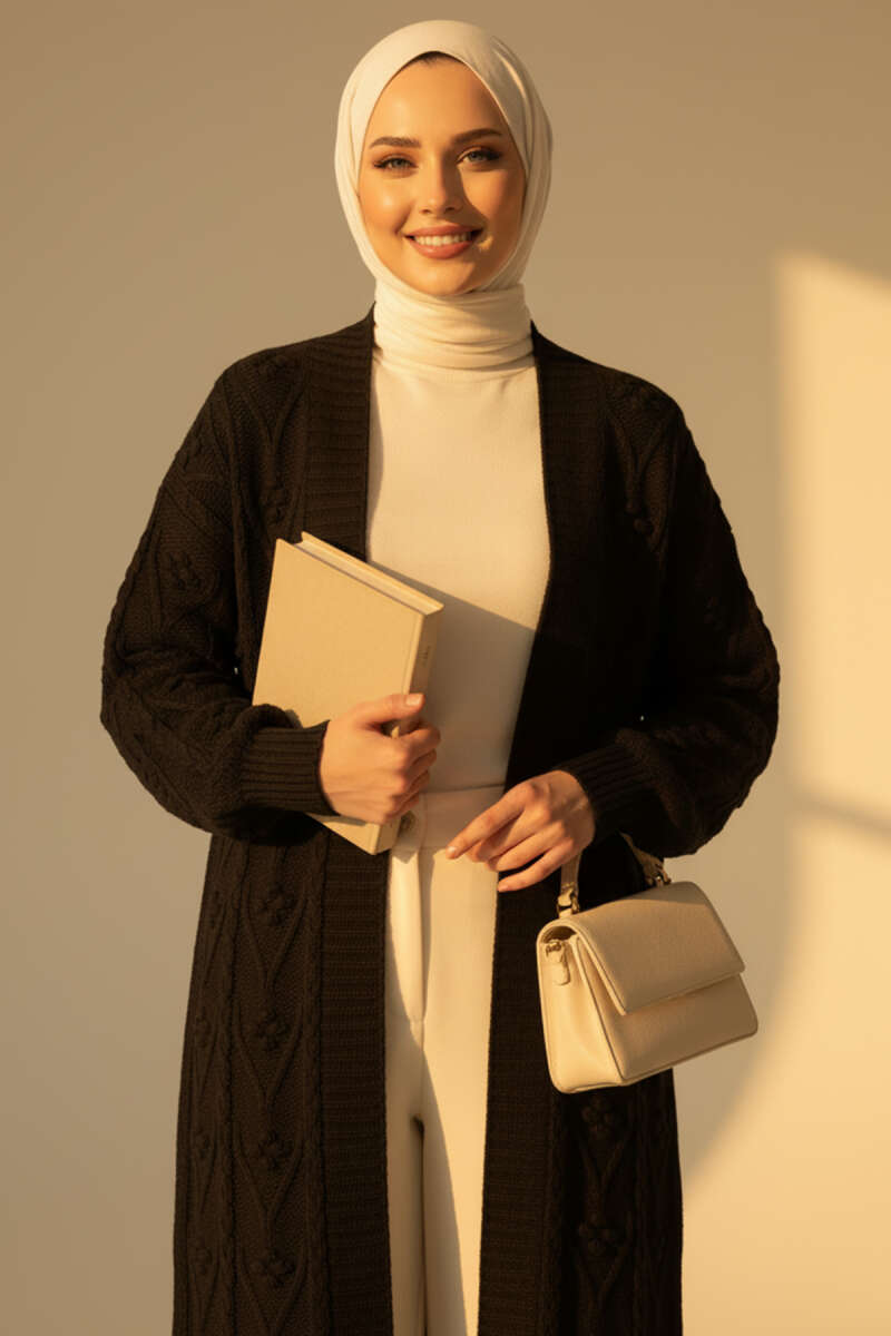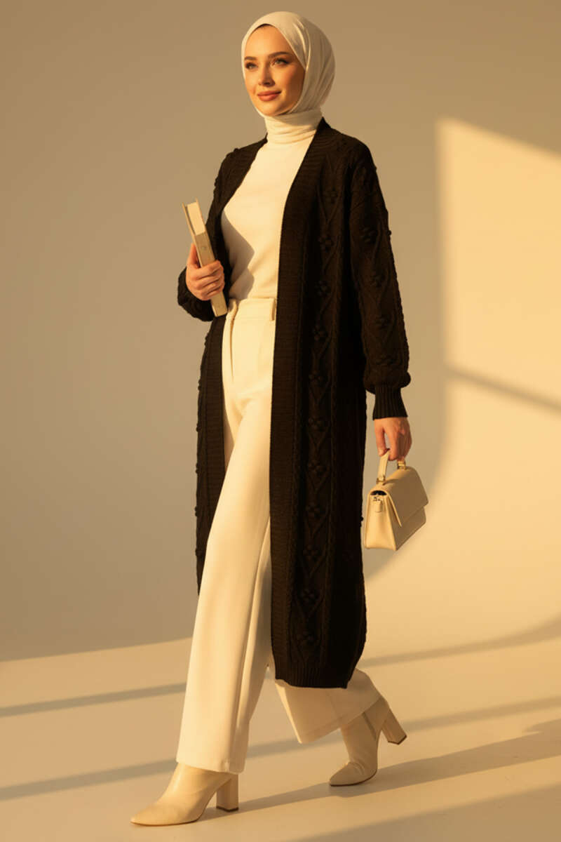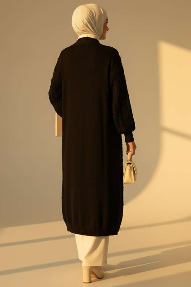 Örgü Kabartma Desenli Uzun Triko Hırka Siyah
