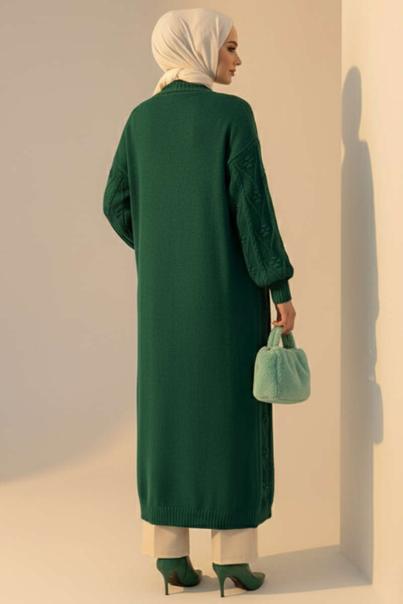 Örgü Kabartma Desenli Uzun Triko Hırka Zümrüt