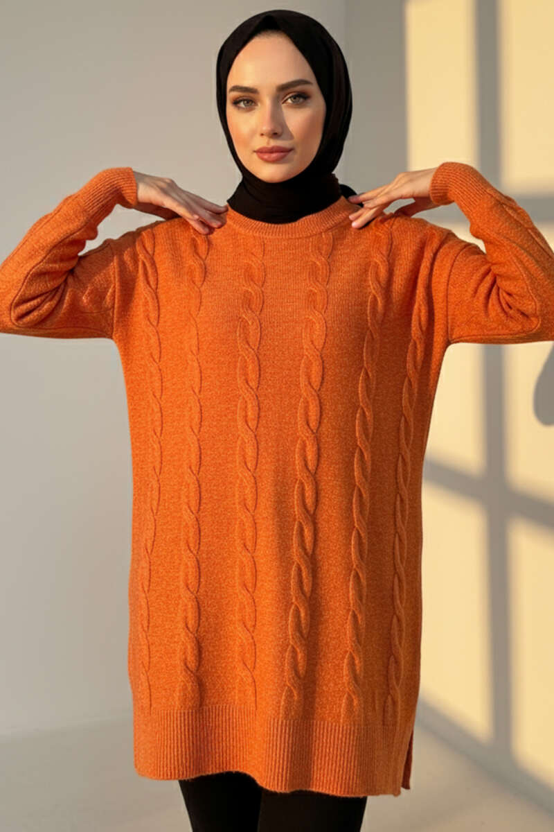 Örgü Kabartmalı Yumoş Triko Tunik Oranj