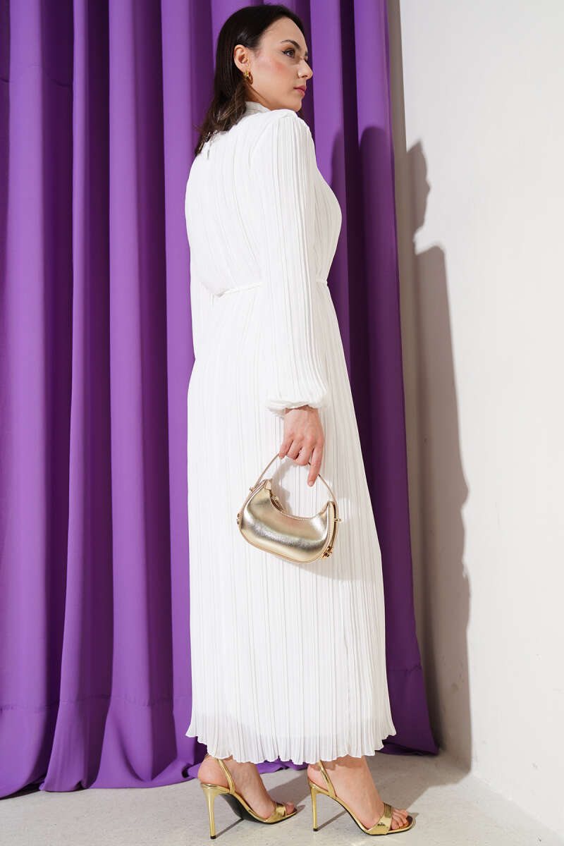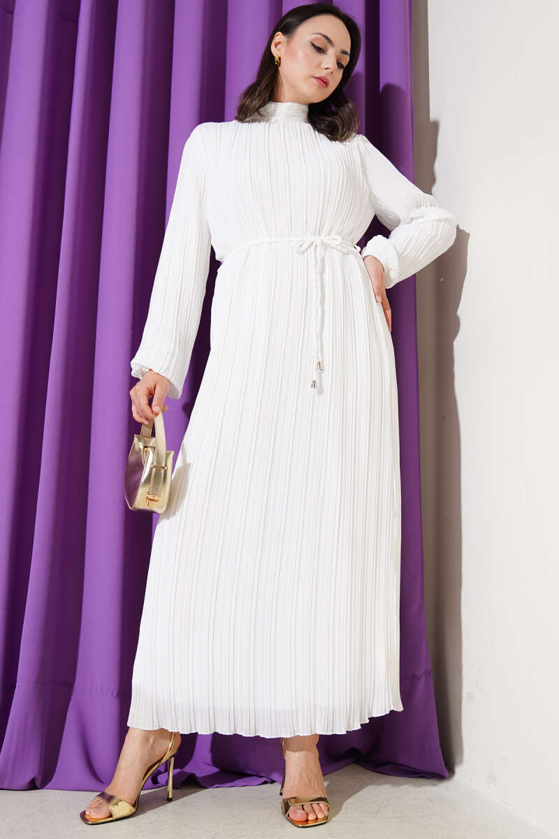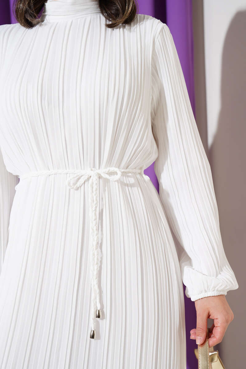Örgü Kuşaklı Pileli Şifon Elbise Ekru