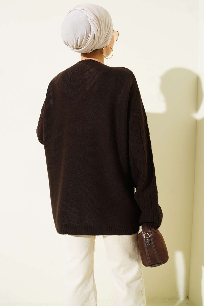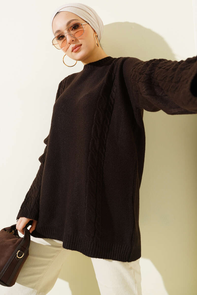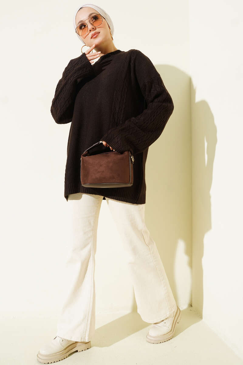 Yaka Fularlı Yumoş Triko Tunik Kahve