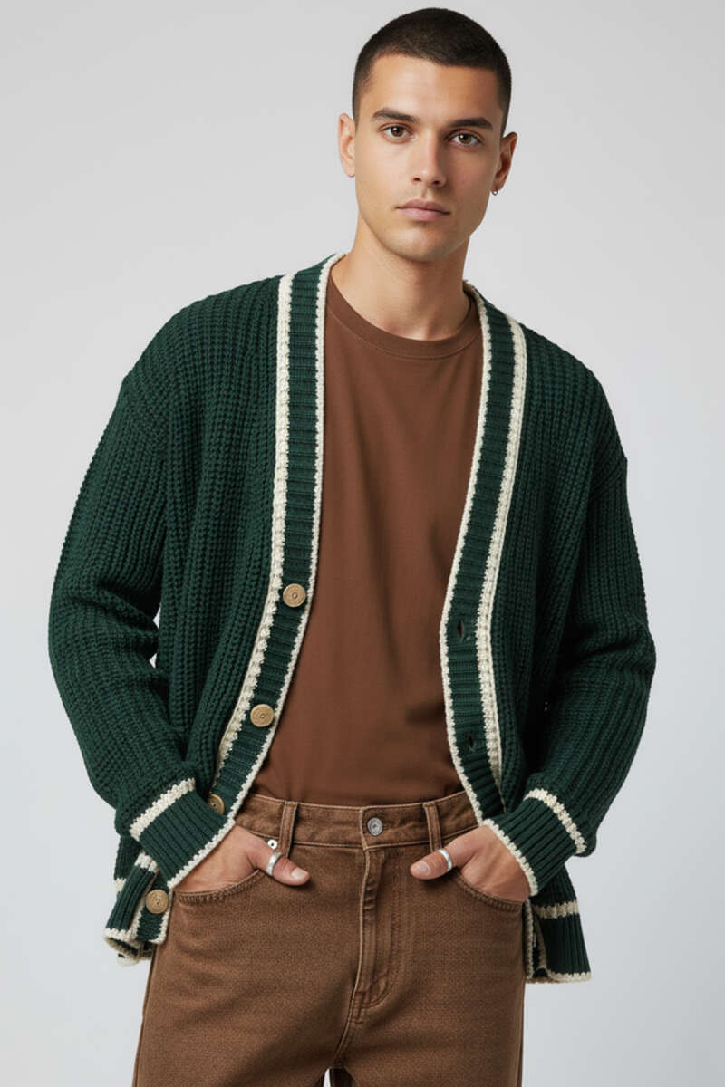 Düğmeli Triko Örme Erkek Hırka Krem