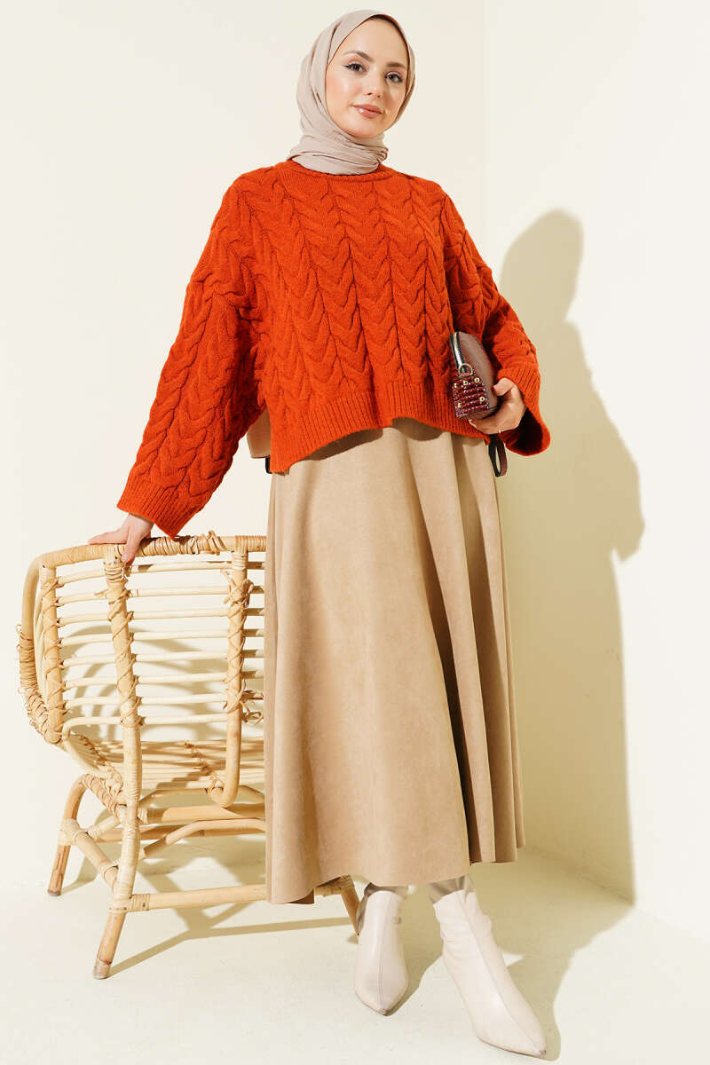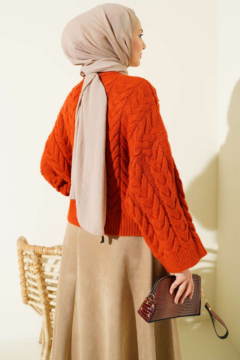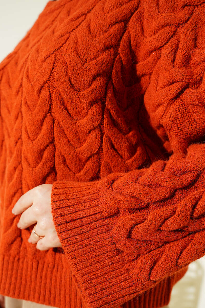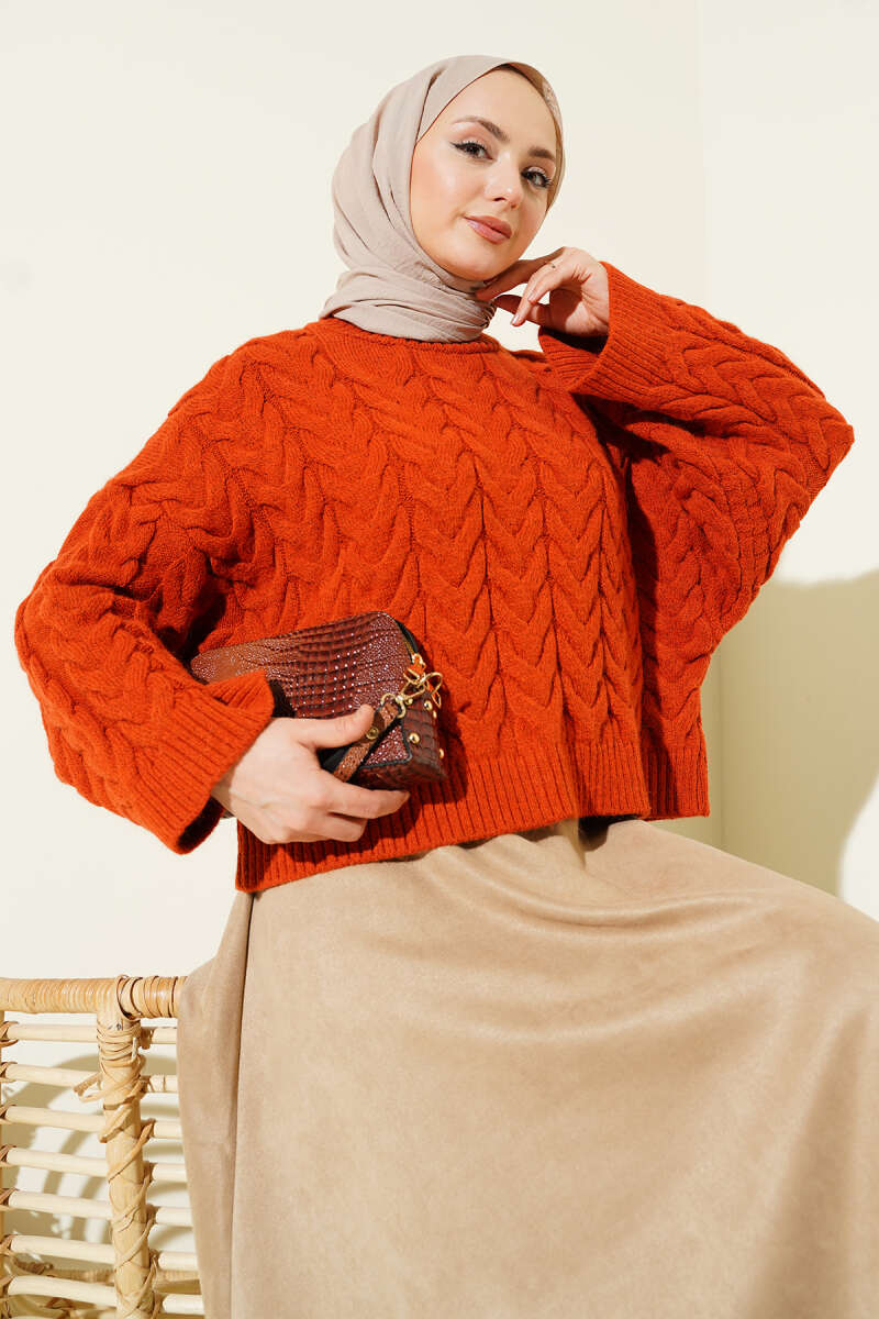 Örgülü Salaş Triko Kazak Kiremit