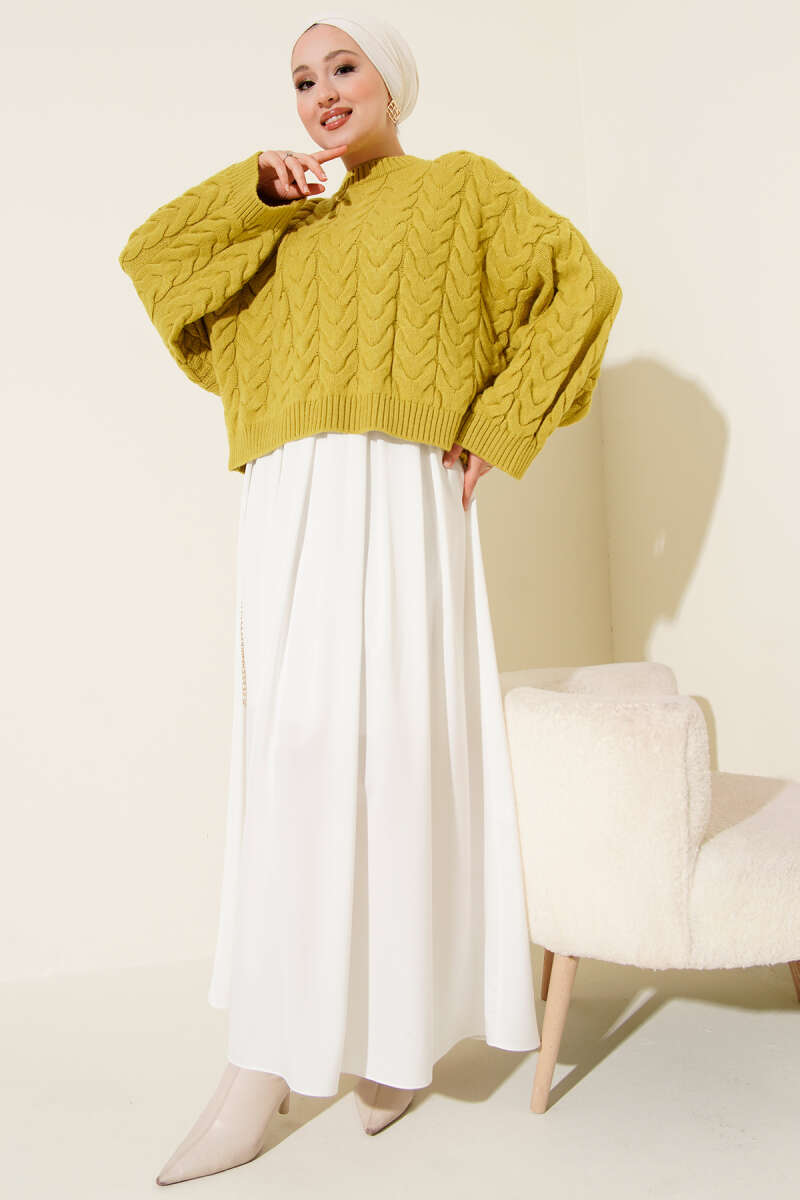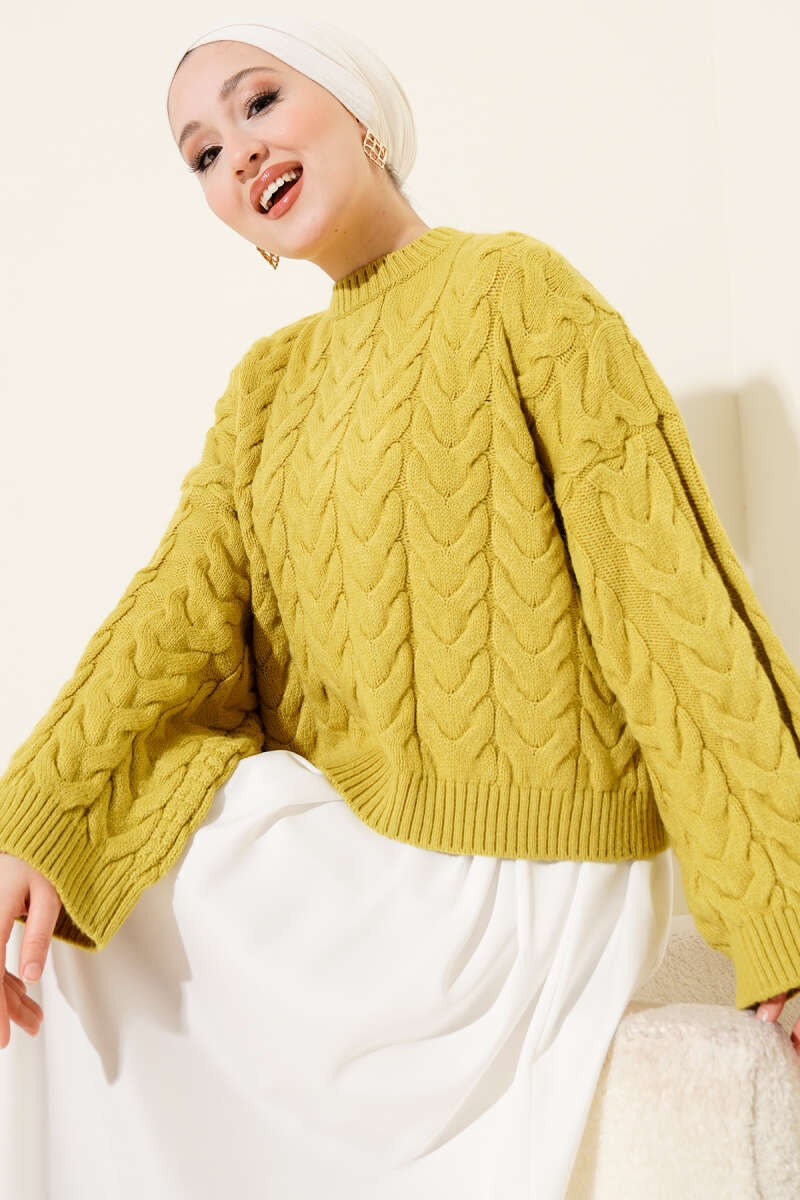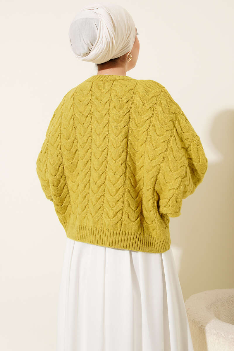 Kabartmalı Yarasa Kol Triko Kazak Yağ Yeşili