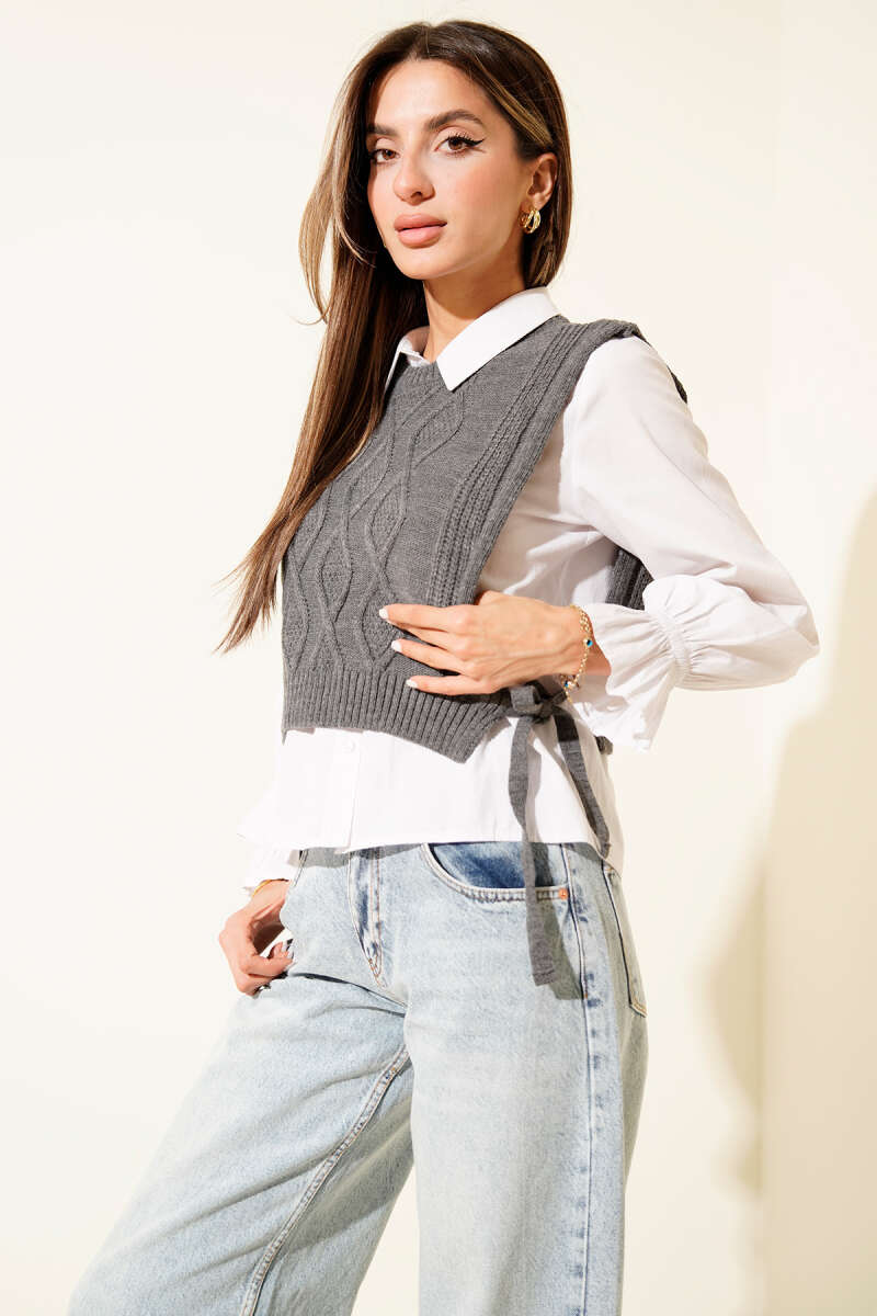 Zigzag Desenli Düğmeli Merserize Hırka Gri