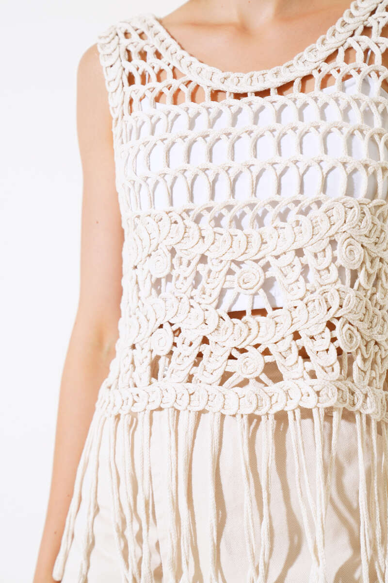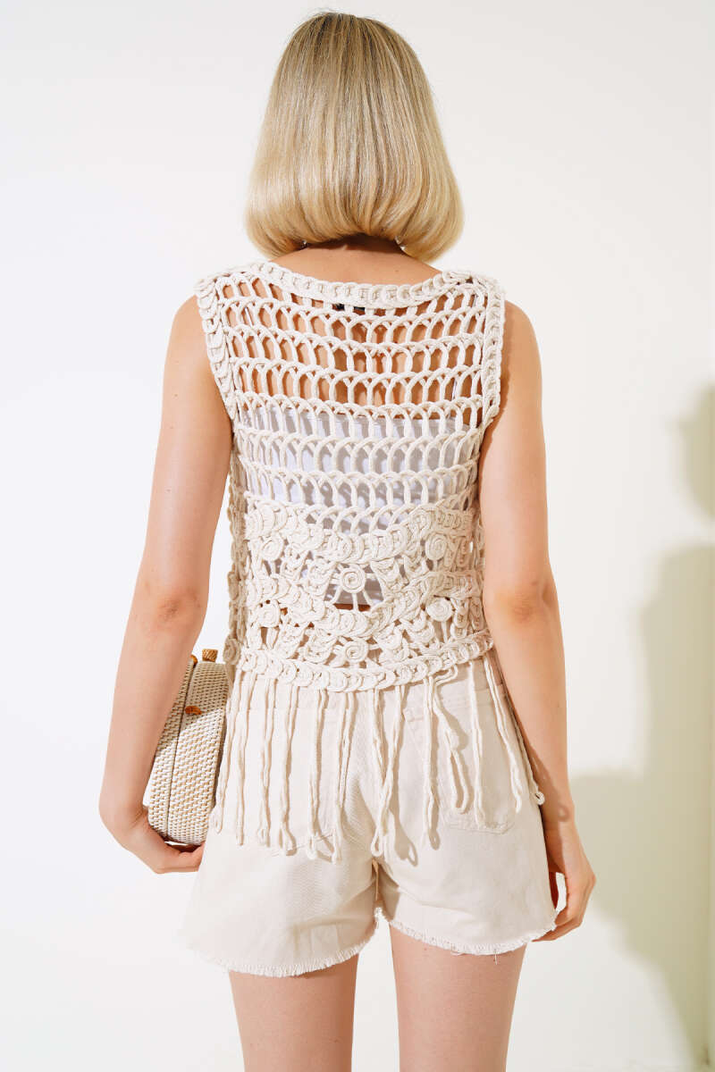 Eteği Volanlı Kısa Kol Triko Bluz Bej