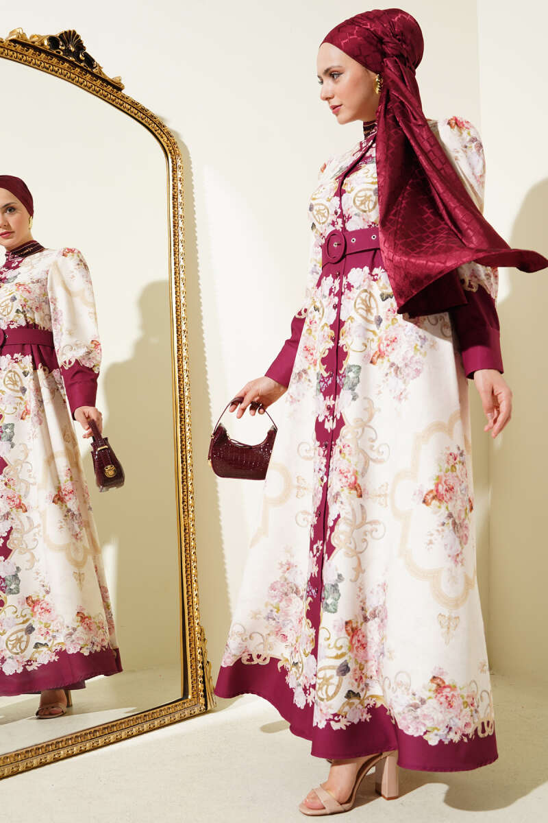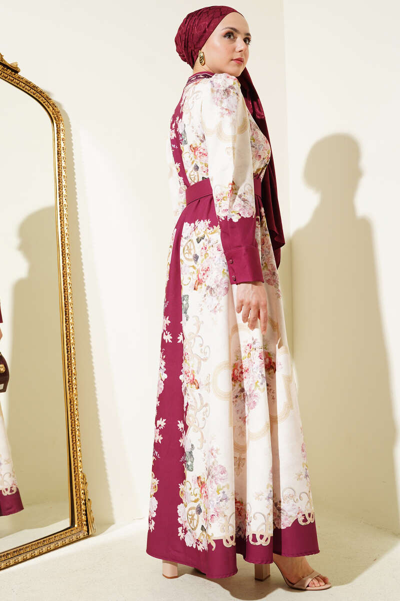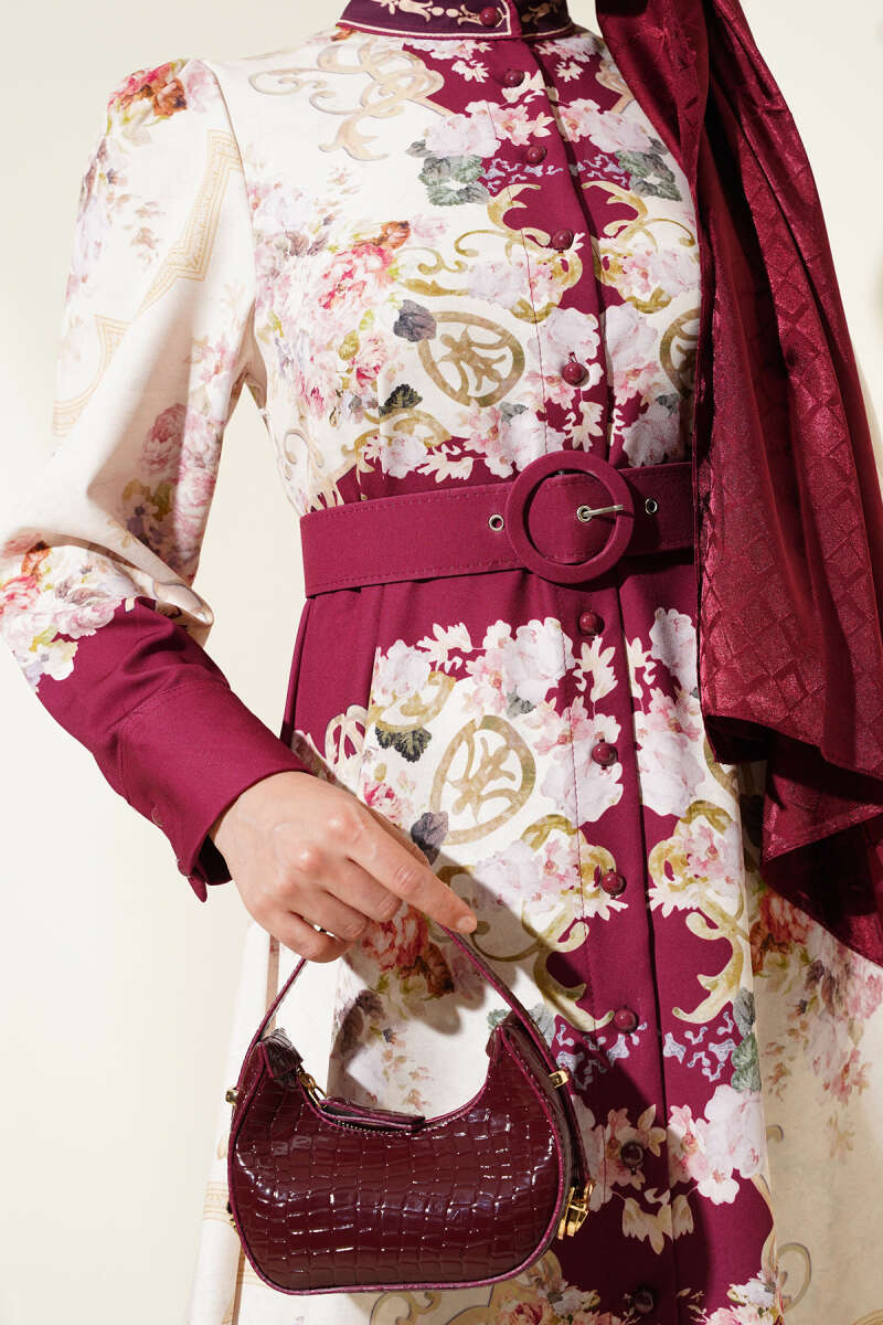Otantik Desen Boydan Düğmeli Elbise Bordo