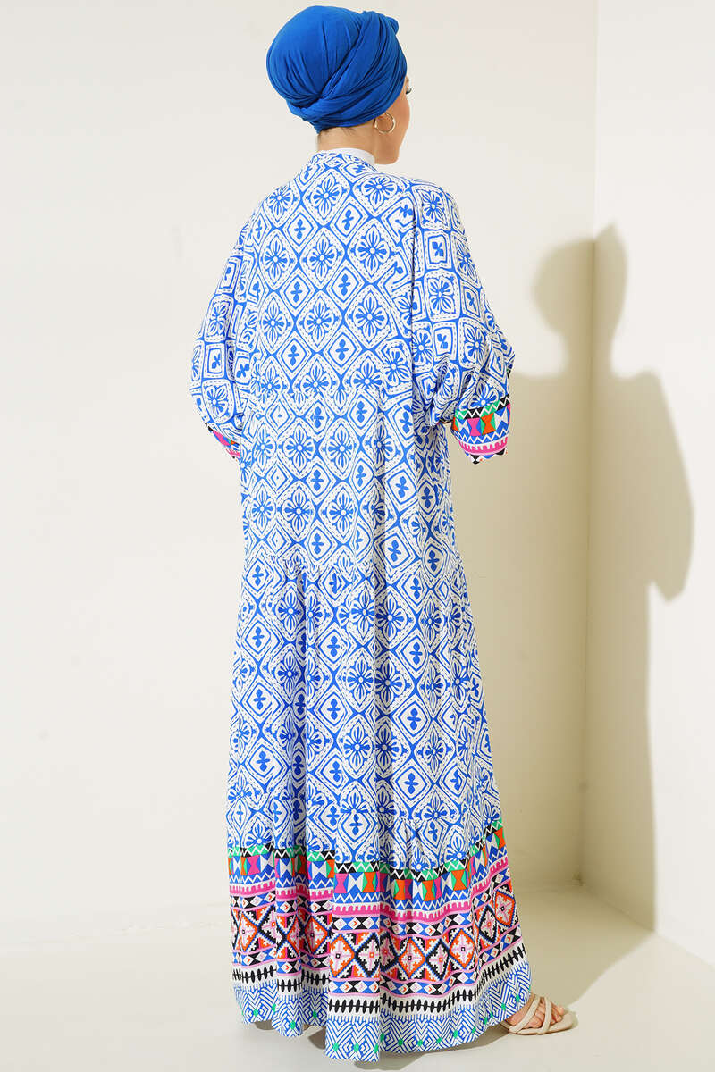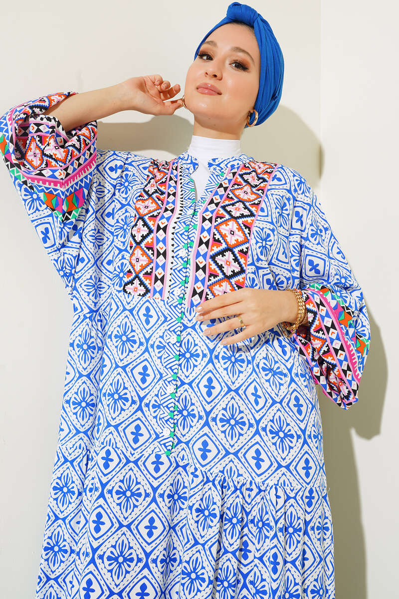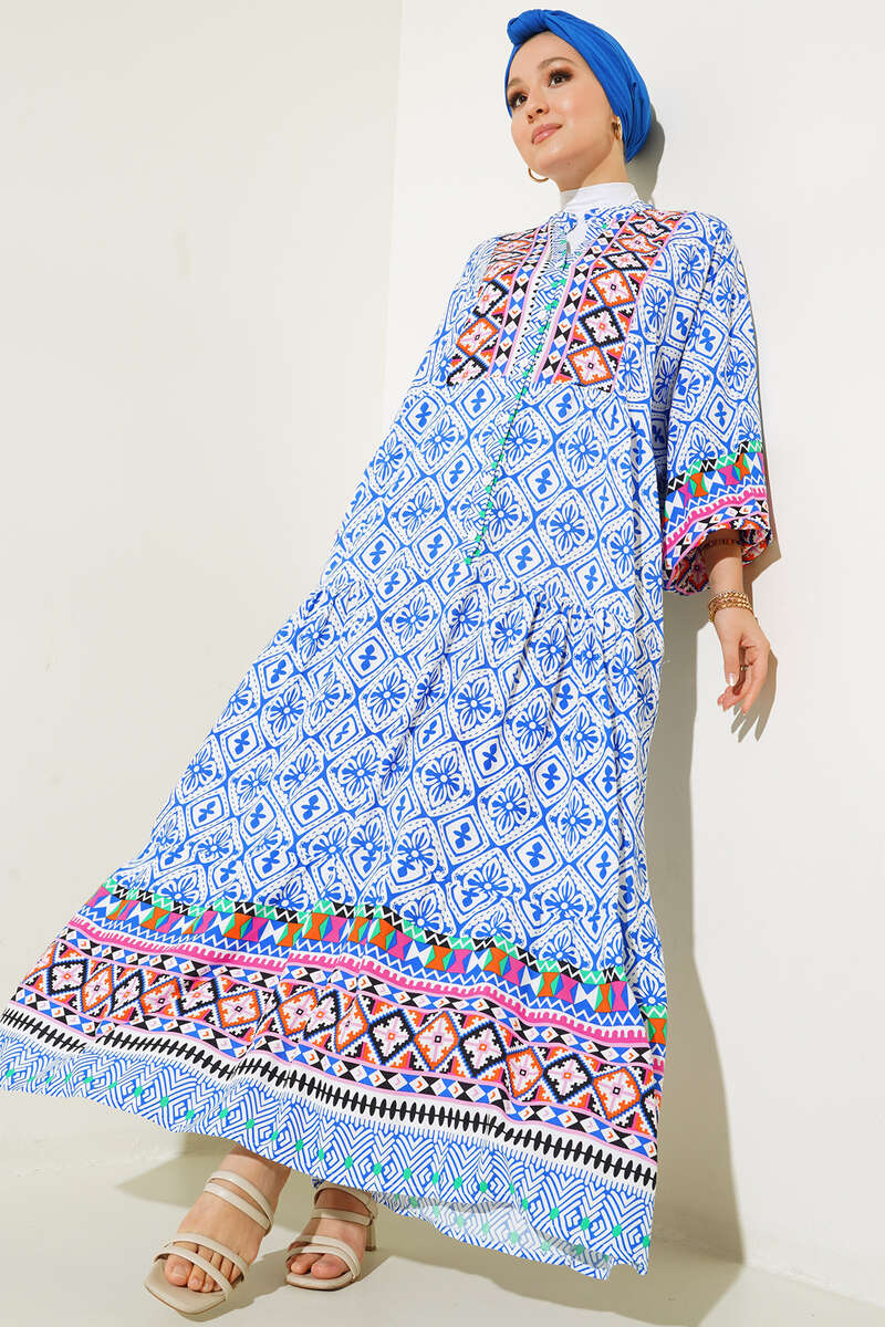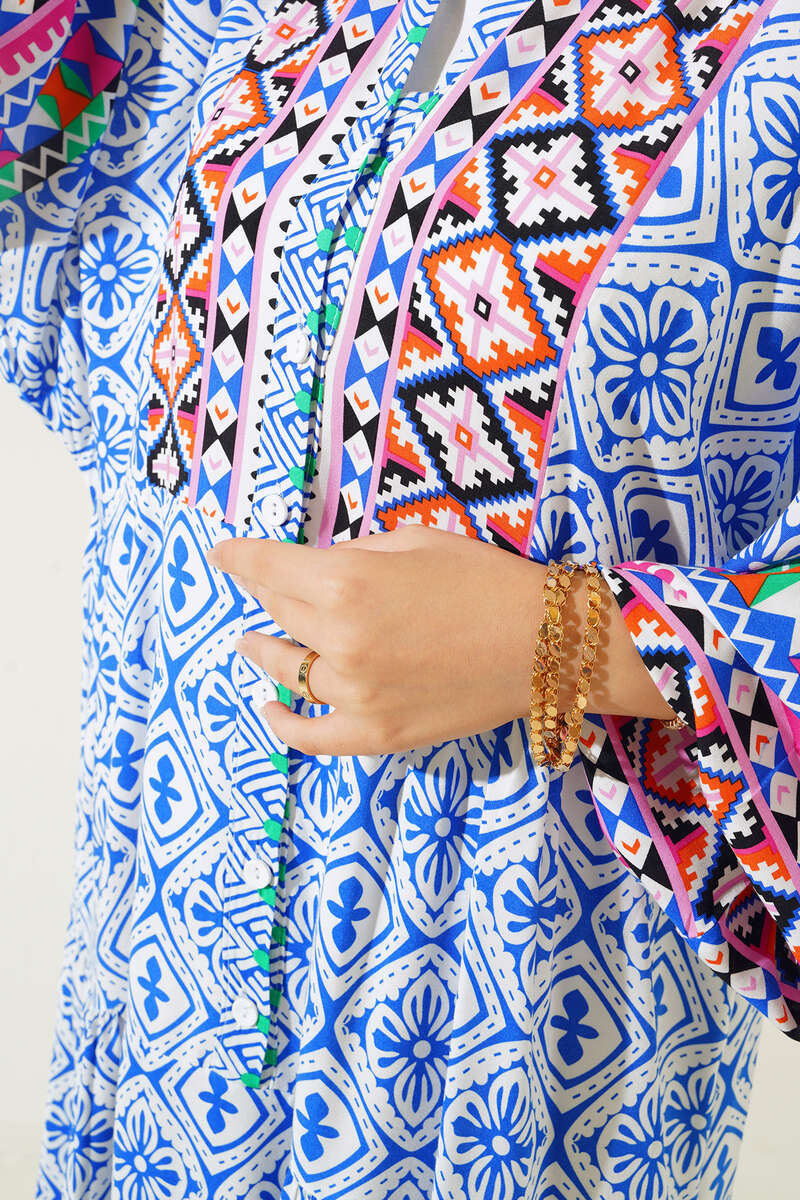 Otantik desenli dokuma elbisemiz sizin için rahat giyimin doğru seçimi olacaktır. Bilekleri lastikli elbisemiz düğme detaylıdır. Yarasa kol elbisemiz rahat şıklığı size sunacaktır.