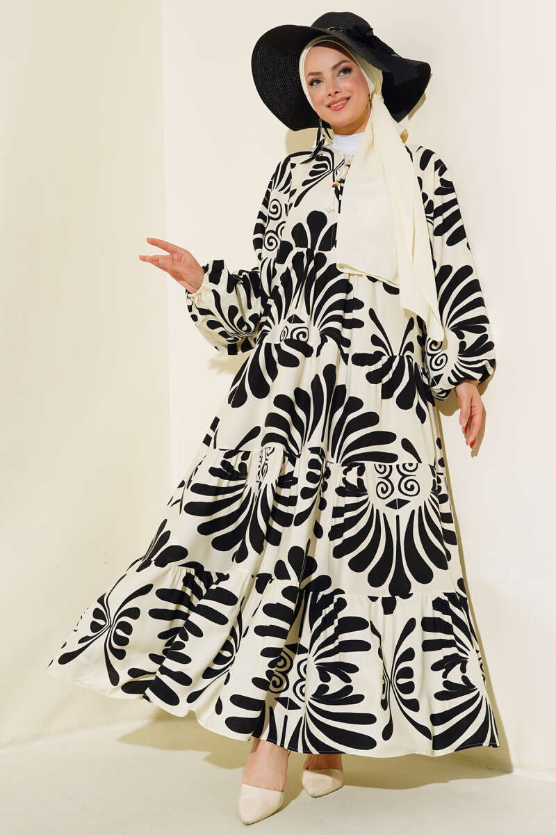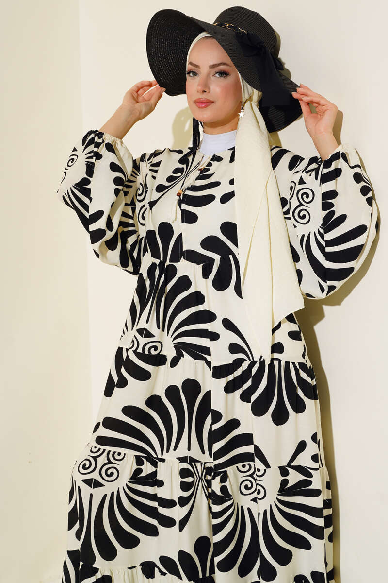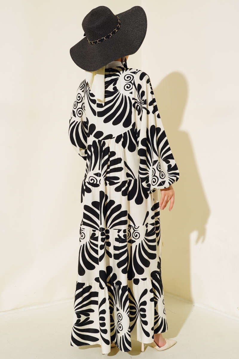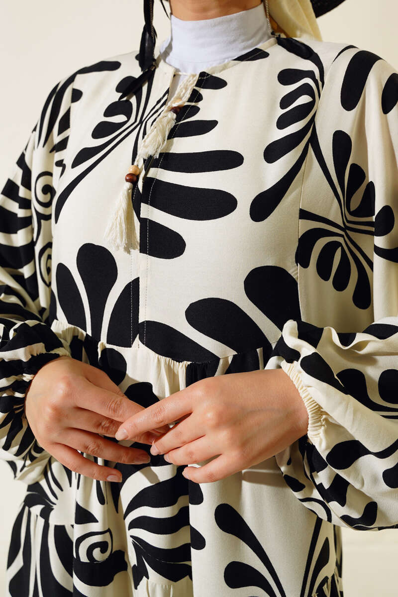 Otantik Desen Yaka Püsküllü Elbise Siyah Yeşil