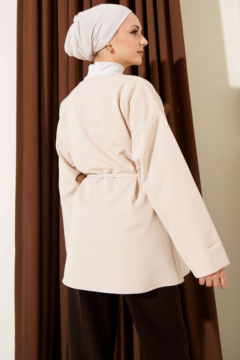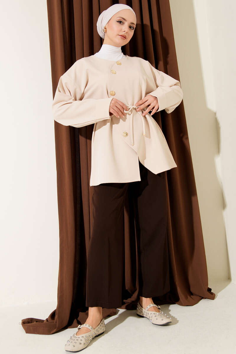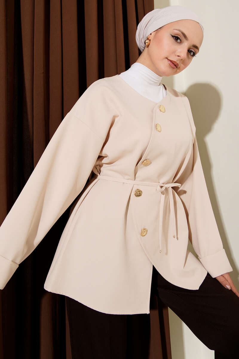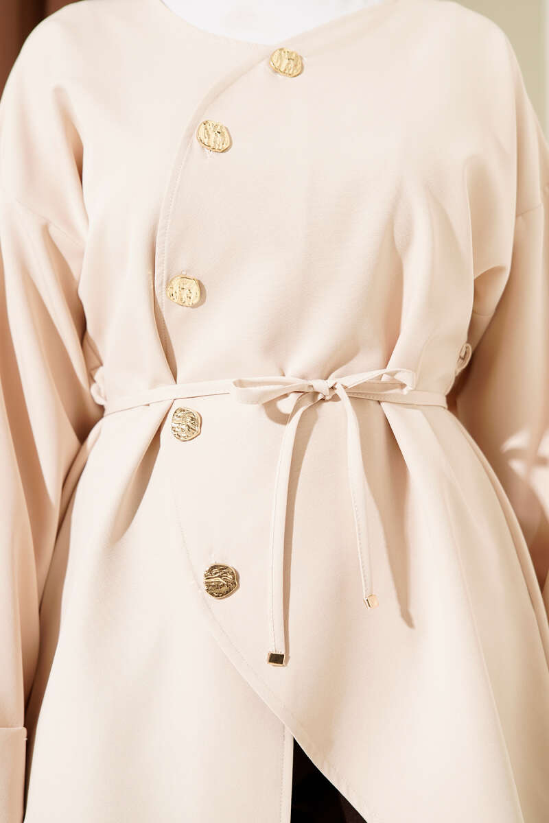 Oval Gold Düğmeli İp Kuşaklı Ceket Bej