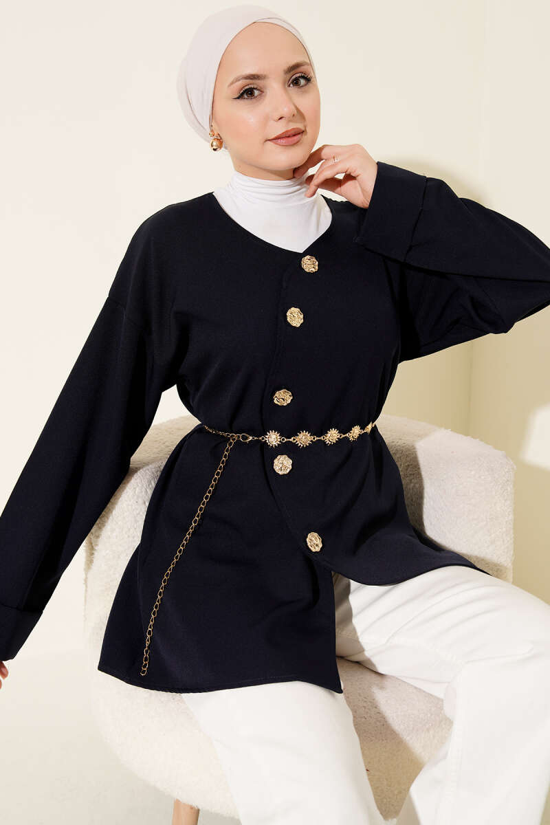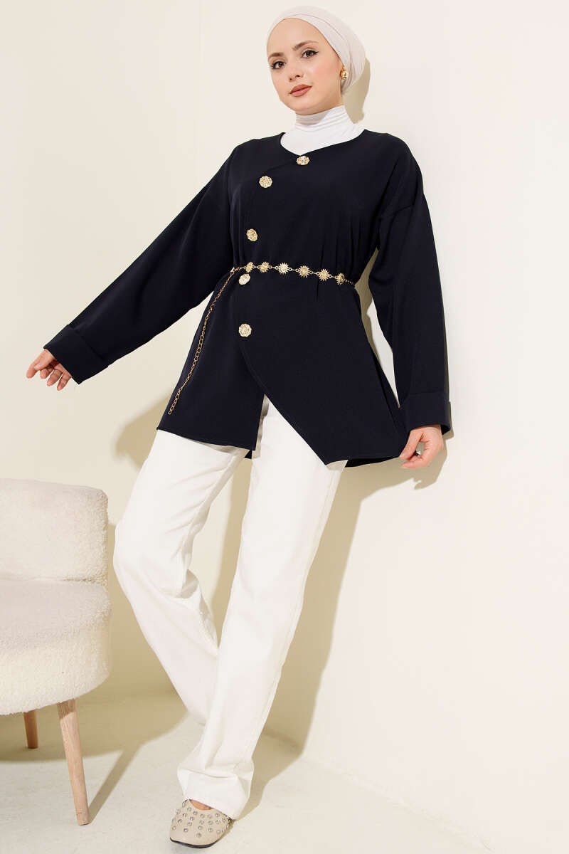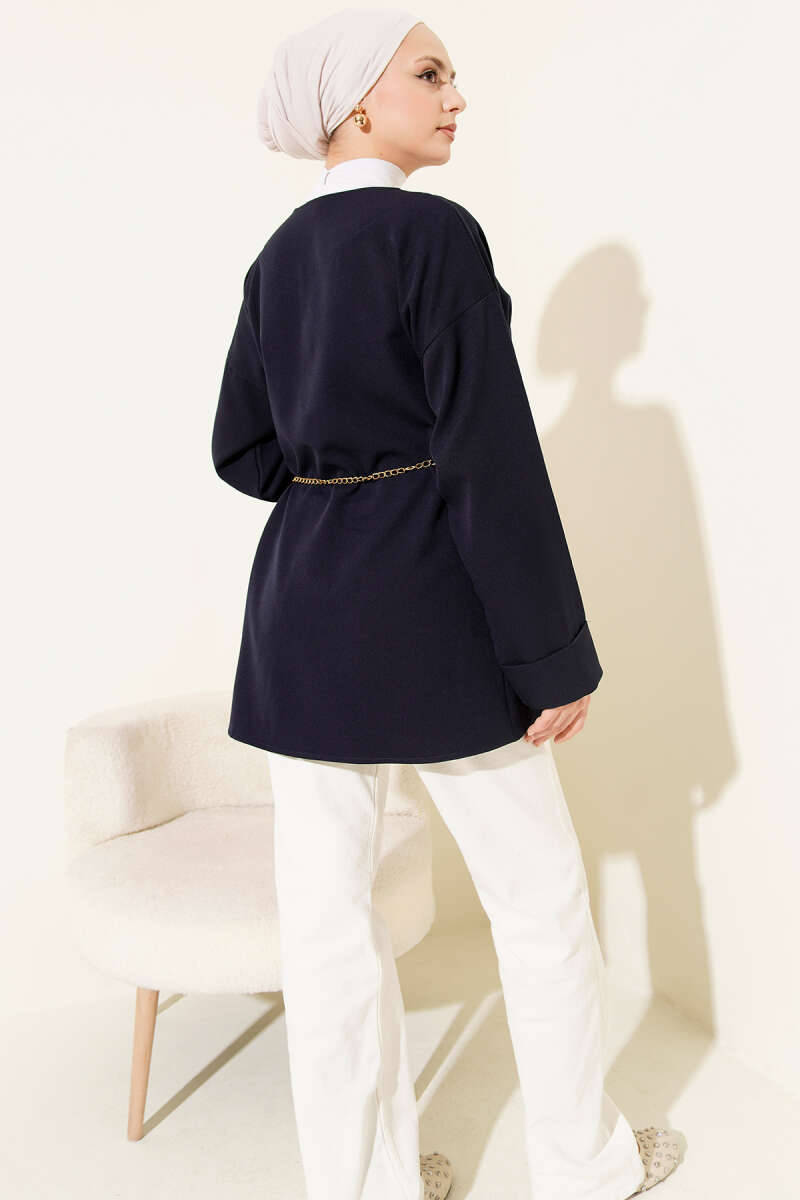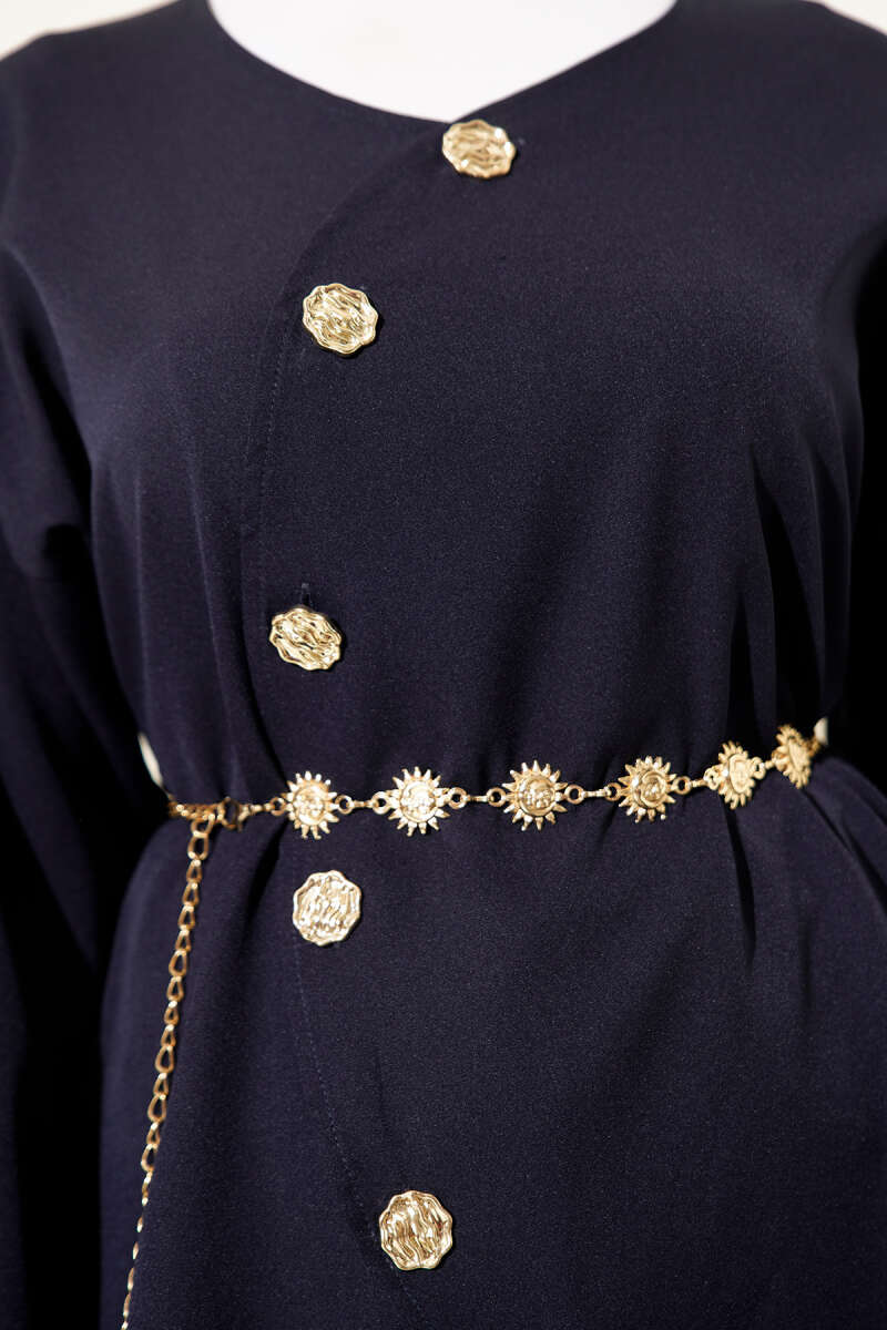 Oval Gold Düğmeli İp Kuşaklı Ceket Lacivert