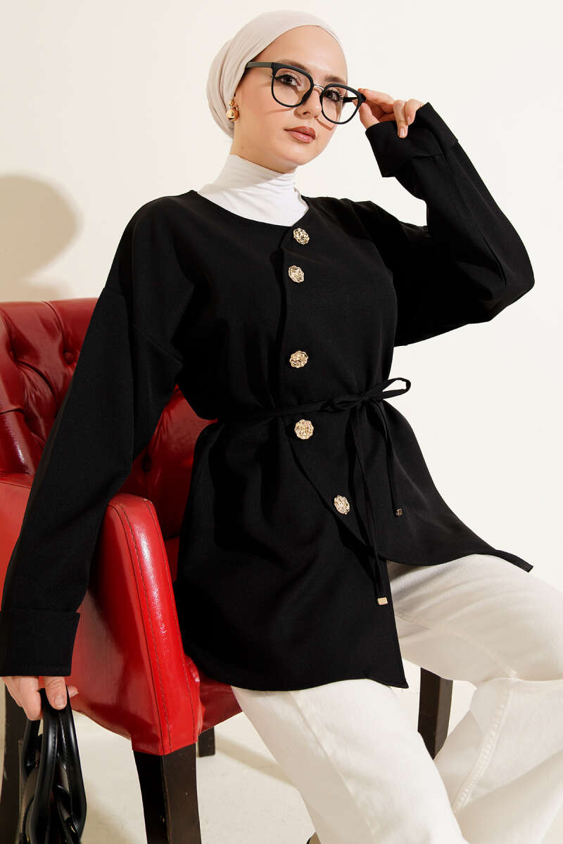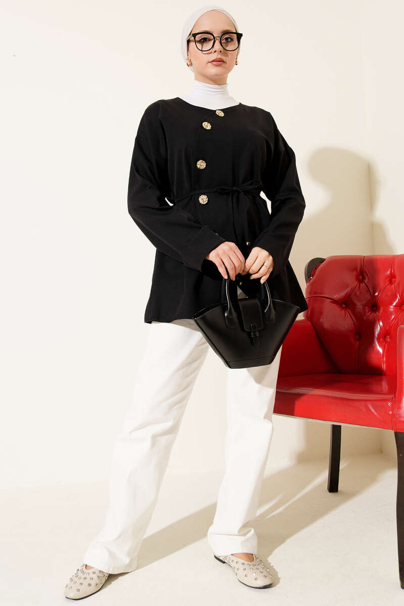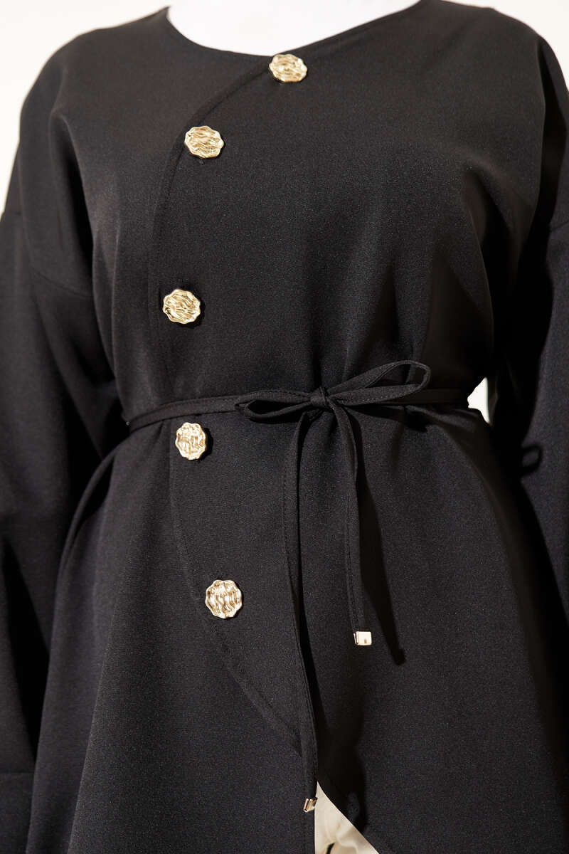 Oval Gold Düğmeli İp Kuşaklı Ceket Siyah
