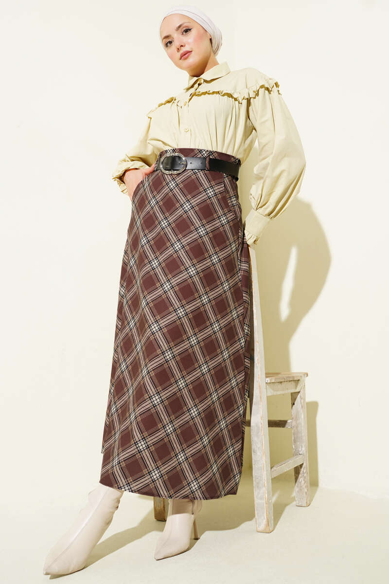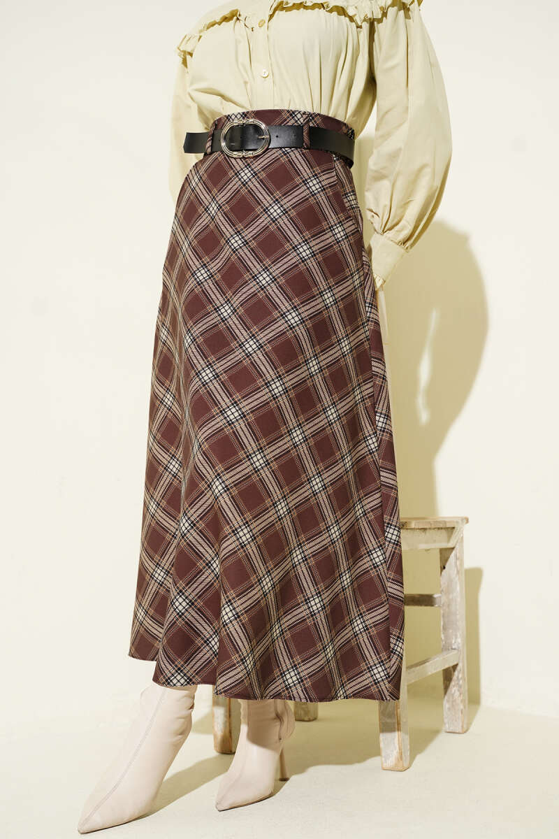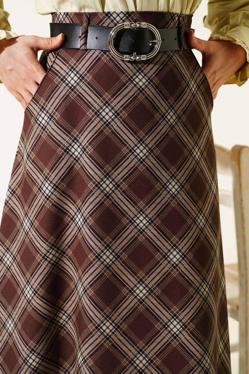 İnce Kemerli Ekoseli Etek Kahve