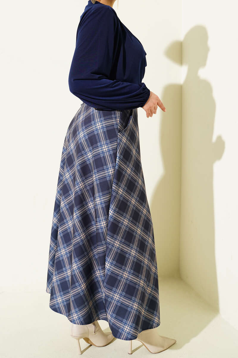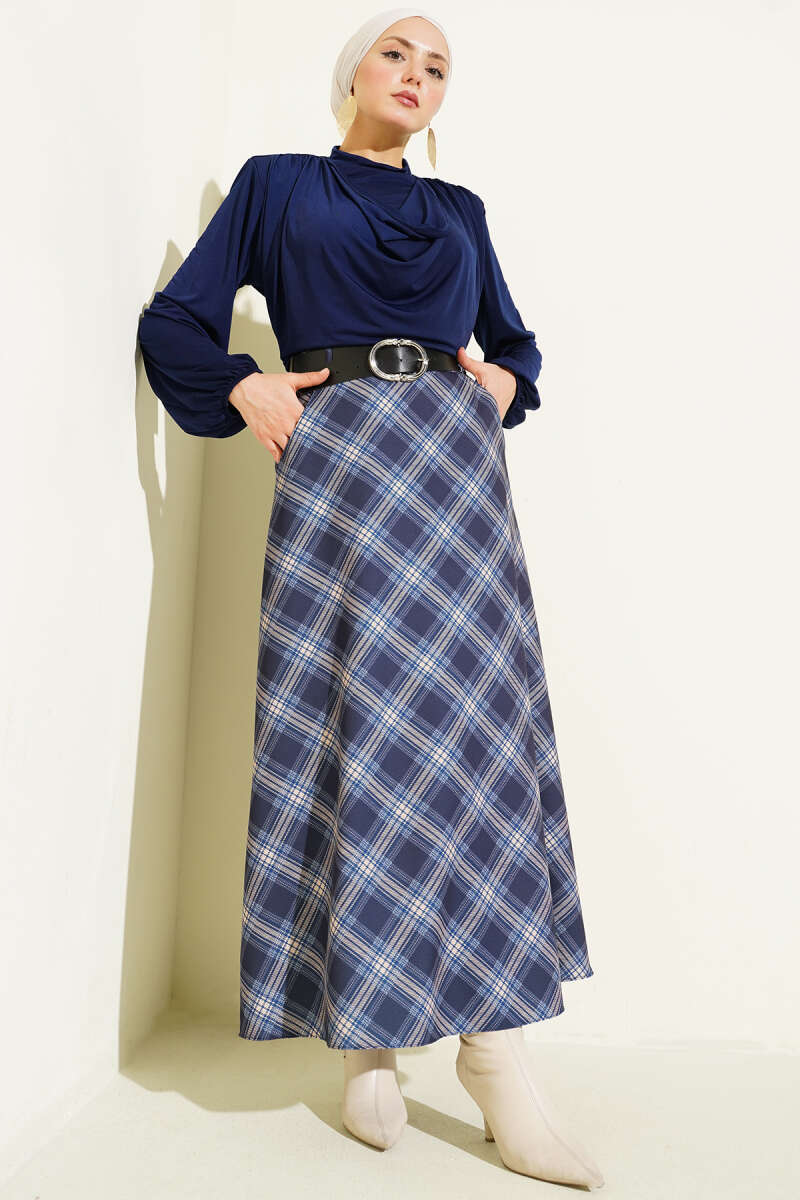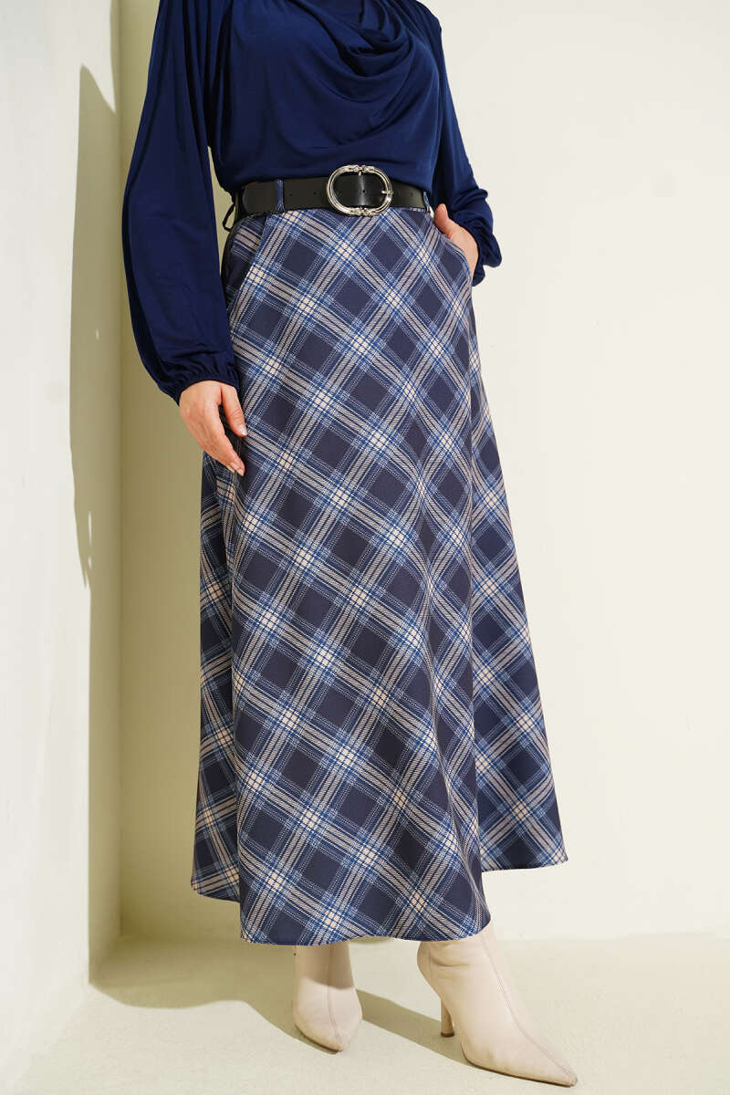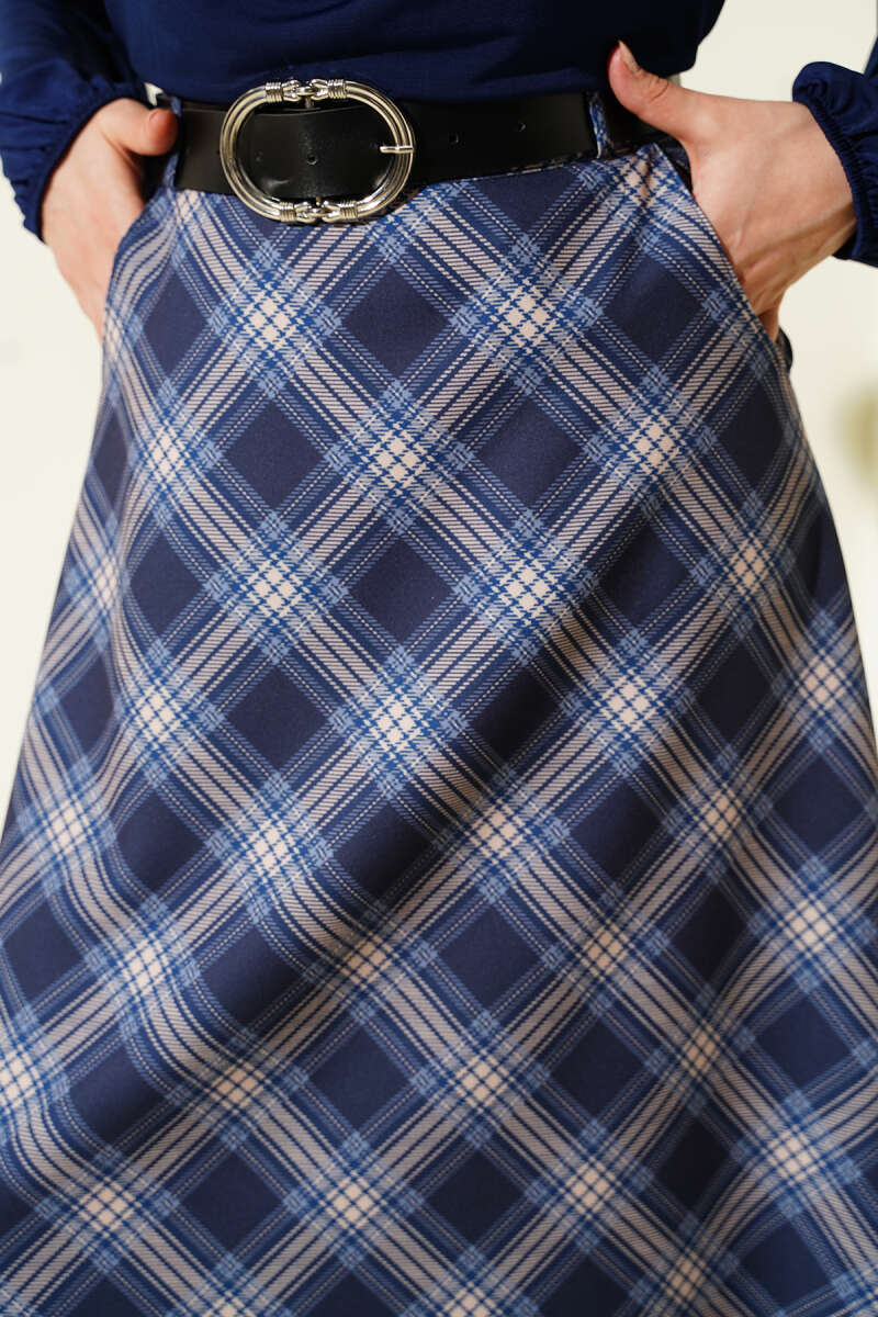 İnce Kemerli Ekoseli Etek Füme Lacivert