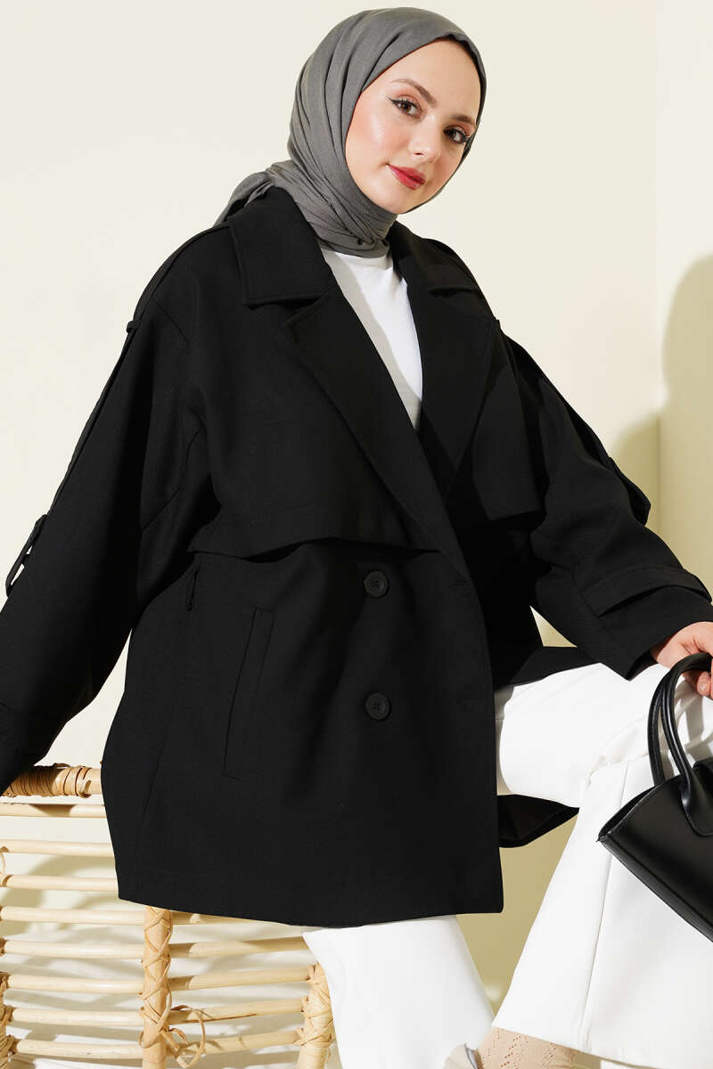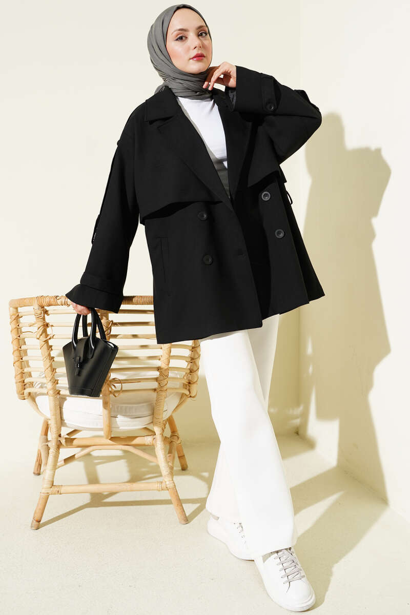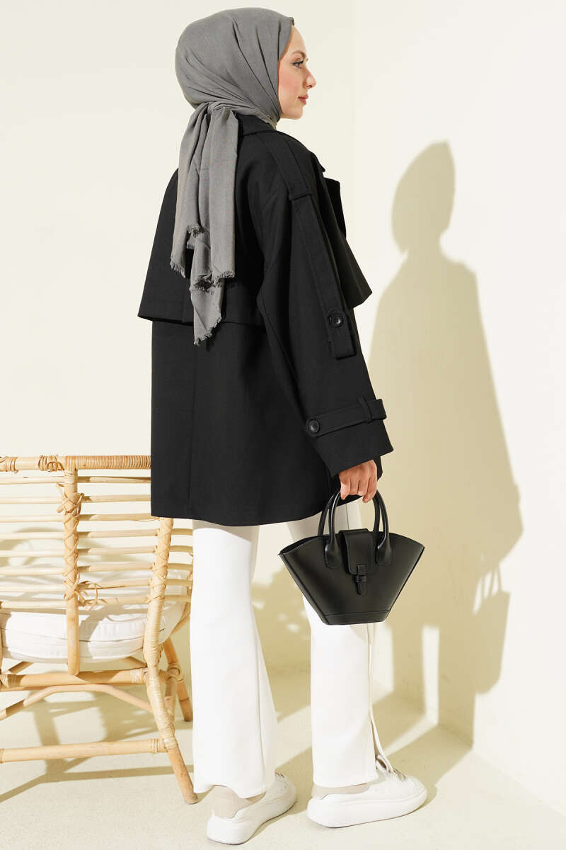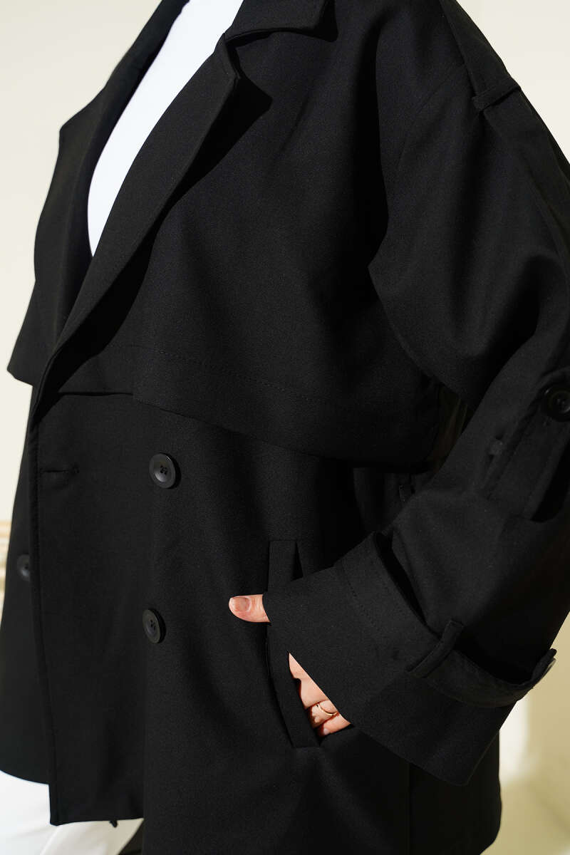 Oversize Apoletli Düğmeli Kısa Trençkot Siyah
