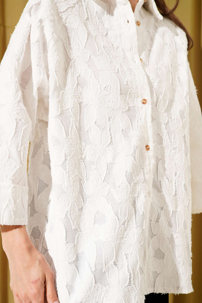 Oversize Yarım Kol Çiçek Kabartmalı Gömlek Beyaz