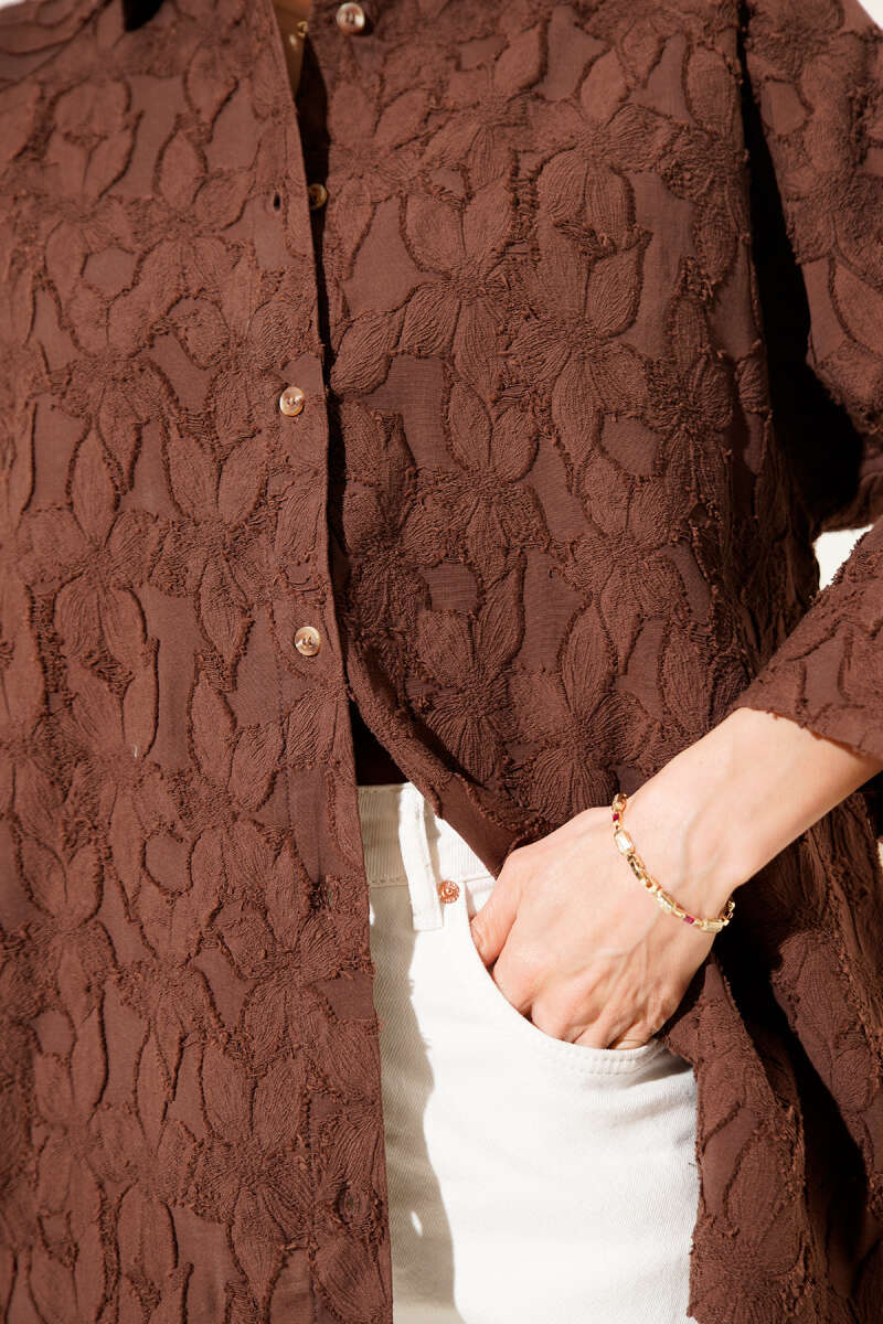 Oversize Yarım Kol Çiçek Kabartmalı Gömlek Kahve